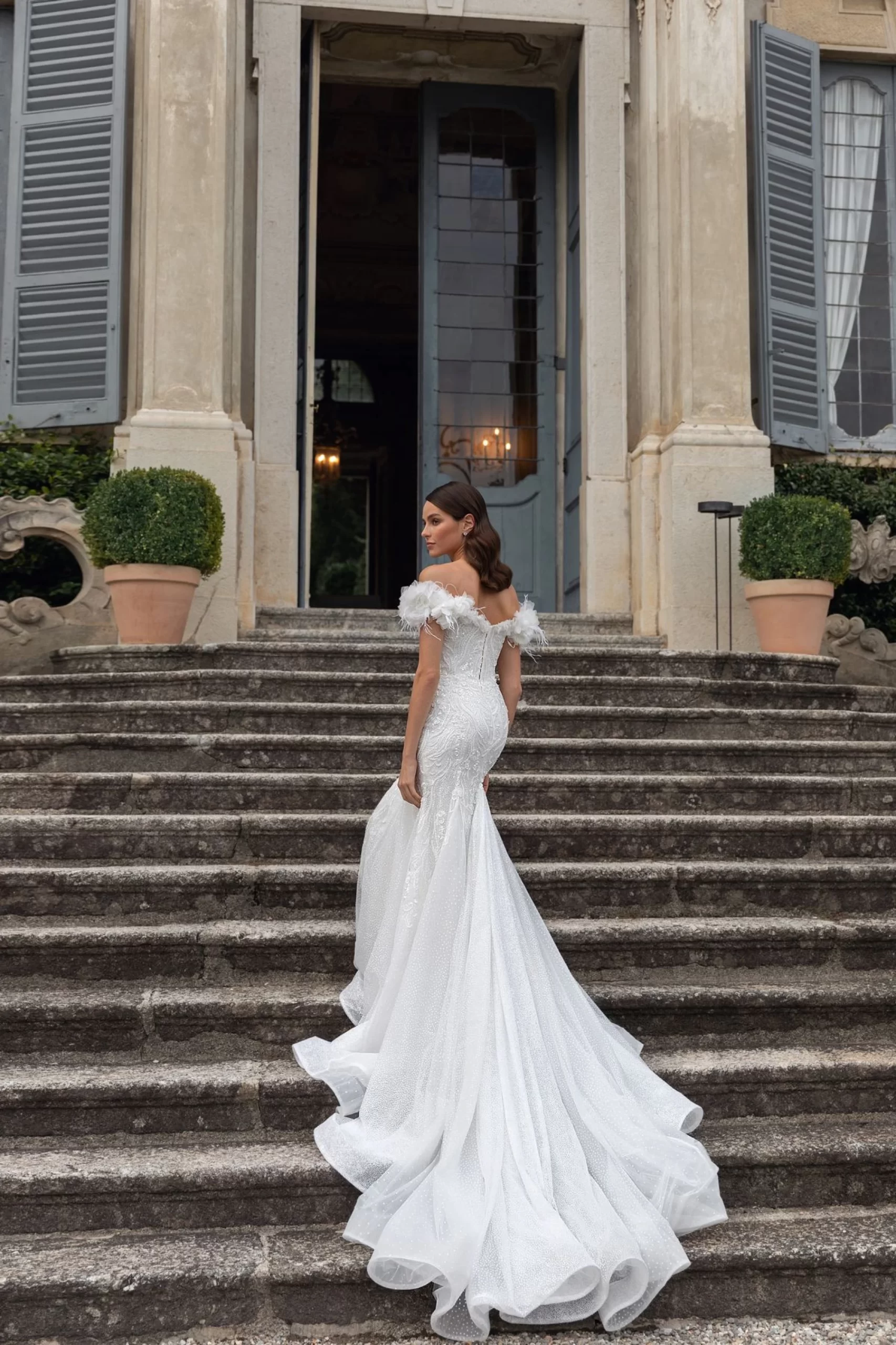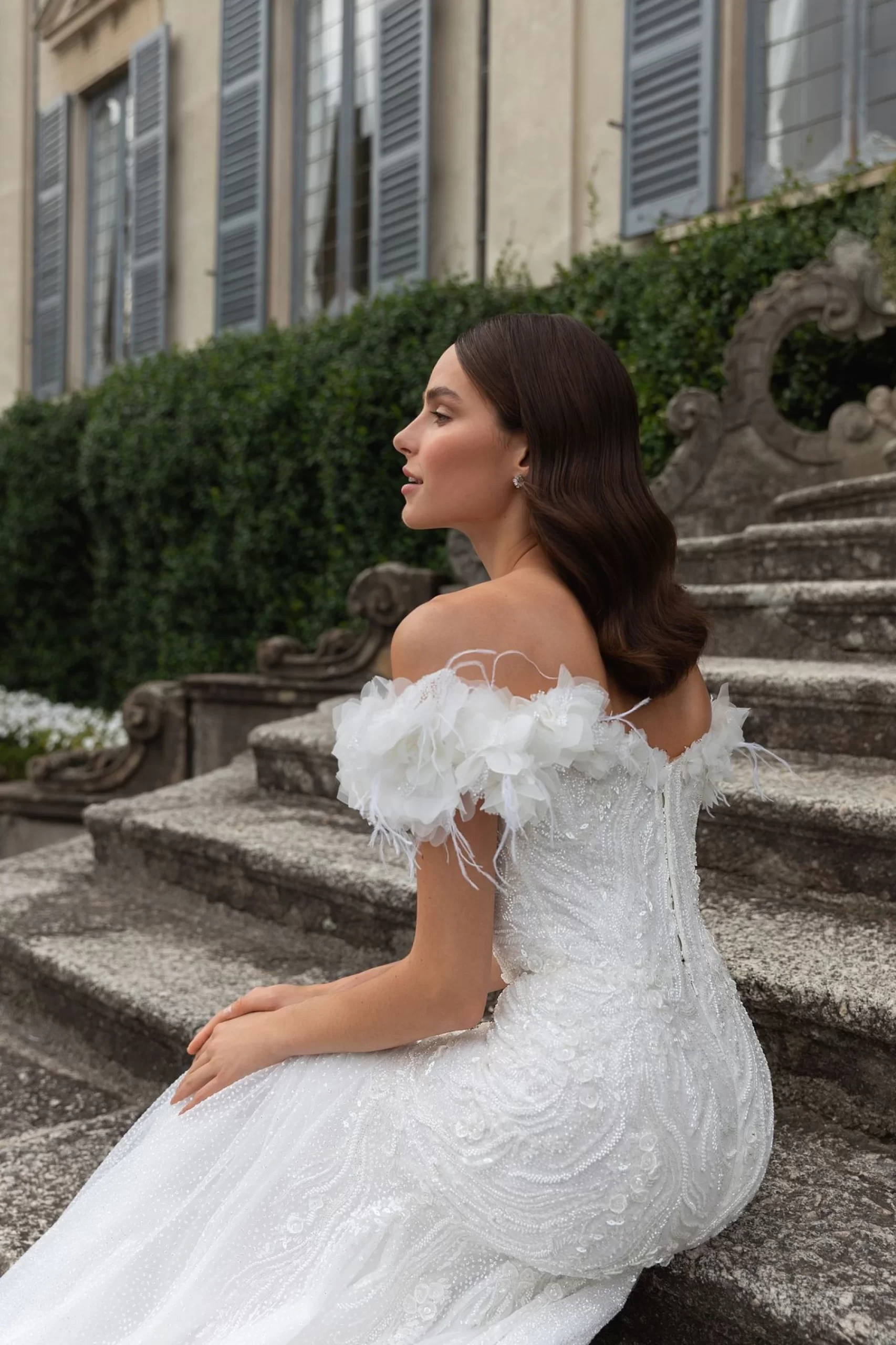 Romantic, touching, and delicate "fish" silhouette wedding dress. Pay attention to the complexity of the composition: the upper section of the corset and sleeves are decorated with voluminous flowers and delicate feathers. The upper part of the top has a boat-shaped cutout and a raglan sleeve. The skirt has wedges...