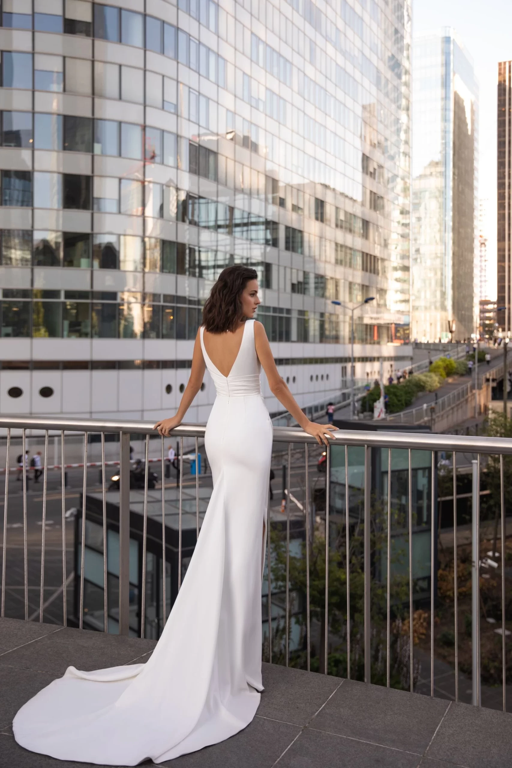 The Aimi wedding dress with the fitted silhouette in the trendy ivory color is the choice of modern beauties who follow fashion trends. The dress is made of luxurious satin, the shine of which can flawlessly tint the bride's beauty. The neckline and the back have an elegant V-shaped neckline,...