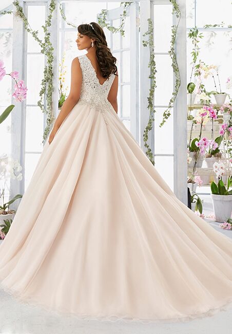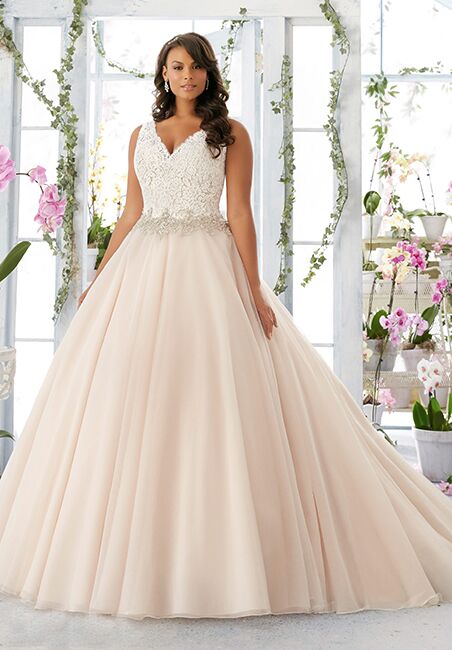 Plus size wedding gown with embroidered lace bodice edged with beading onto the tulle ball gown. Colours available: White/Silver, Ivory/Silver, Caramel/Silver.