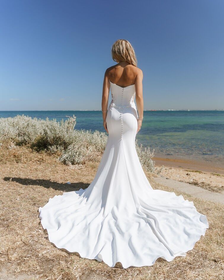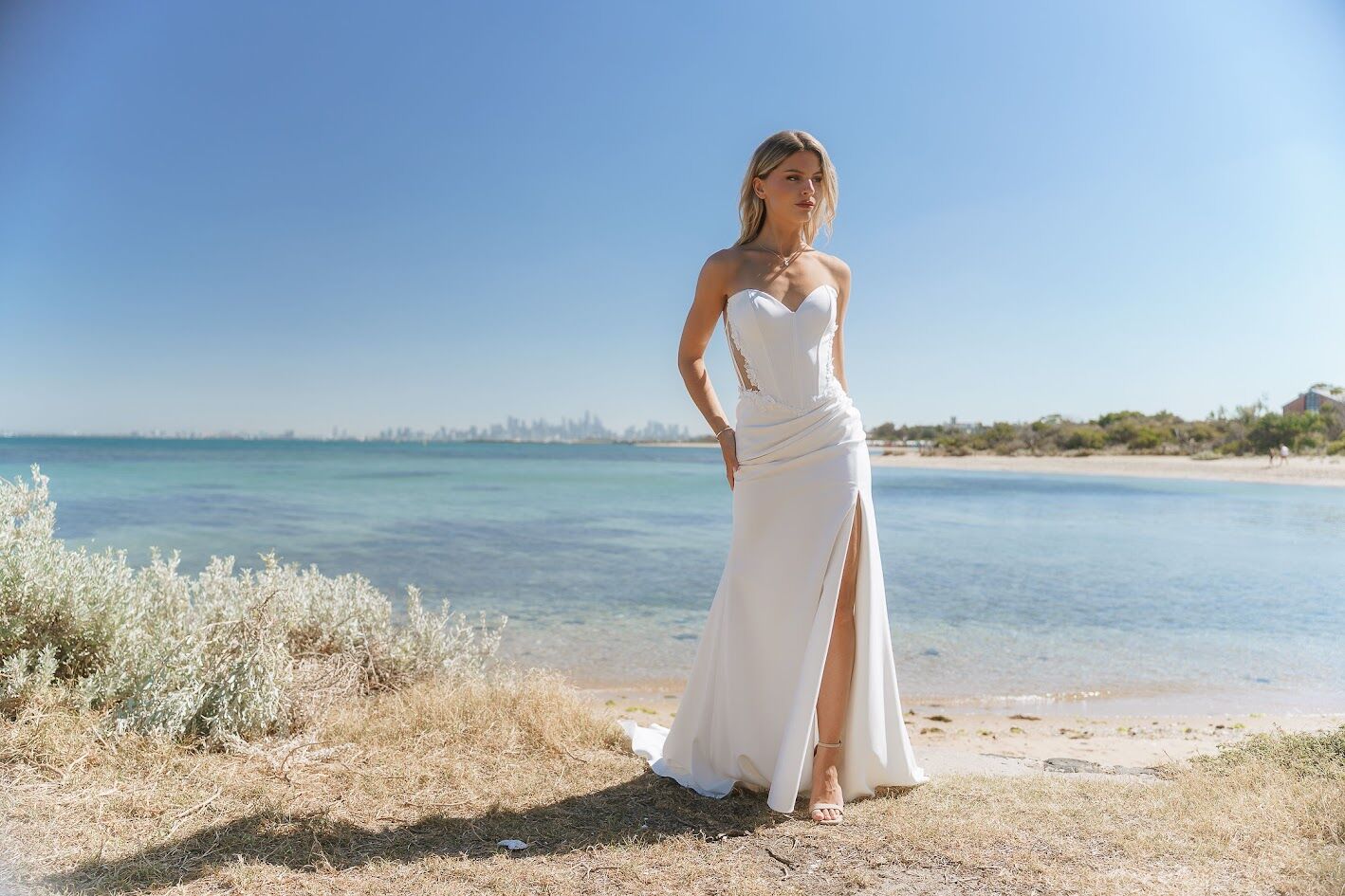 Our ARIANA Wedding gown is structured and romantic with an edge ! Featuring a fully structured bodice and sheer side panels embellished with 3D flowers, modern brides will delight in this unique design !  The draped crepe skirt with a thigh split ensures freedom of movement and sexy allure !