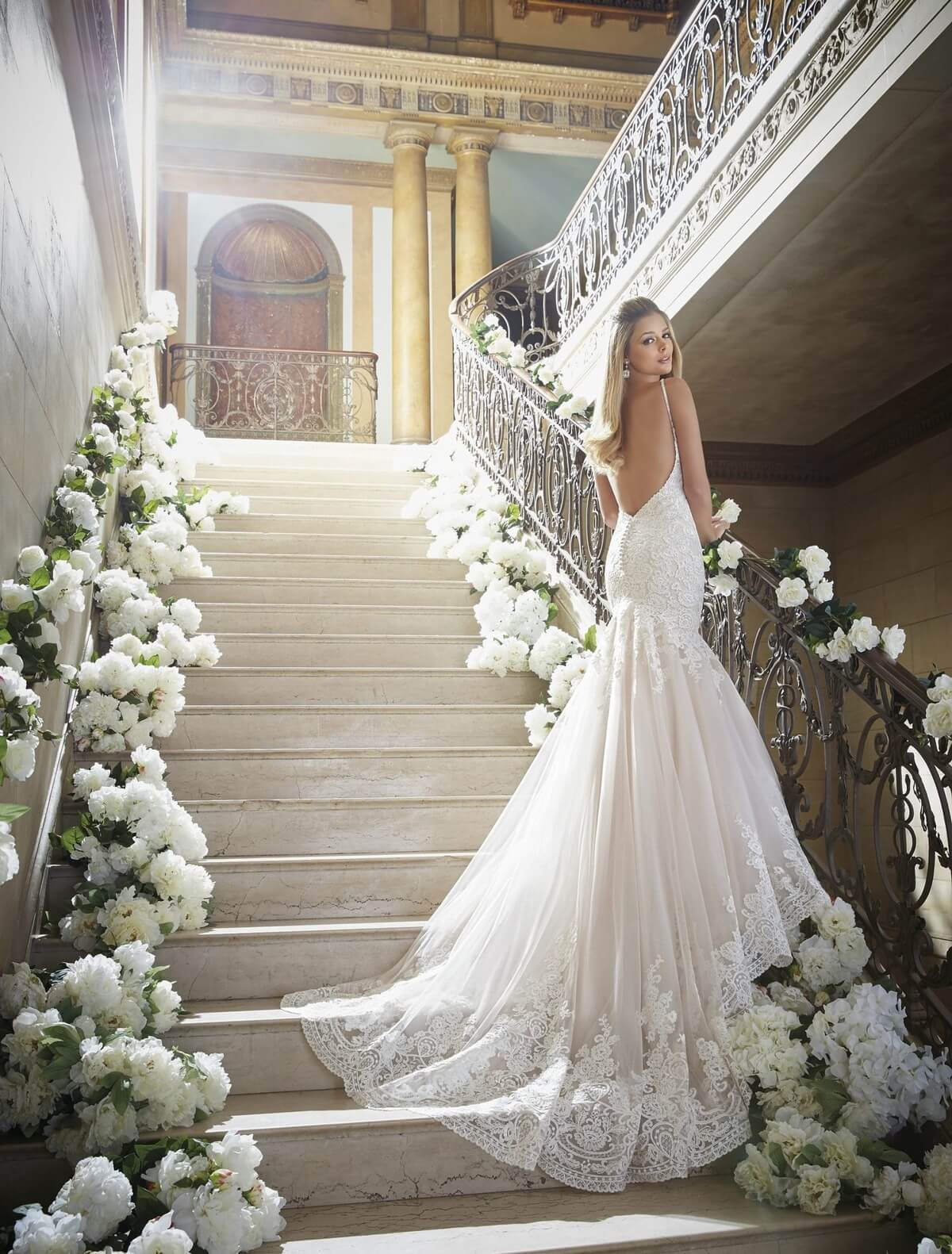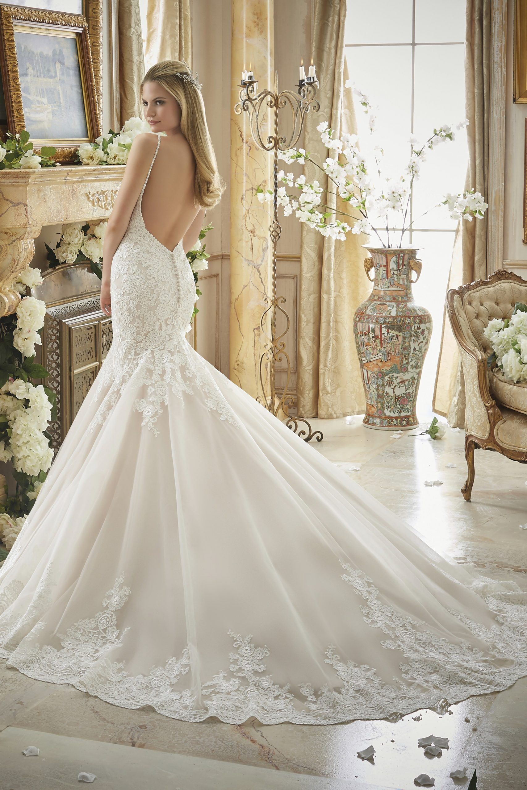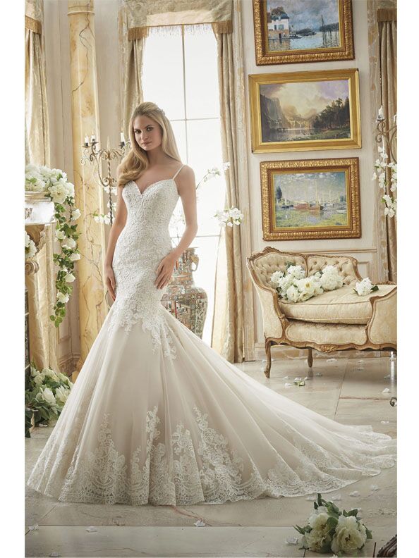 This is one of the most beautiful wedding dresses that combines tulle and lace! Feel like a modern day princess in this Alencon Lace Appliques on Tulle with Wide Scalloped Hemline Wedding Gown. Designed by Madeline Gardner. Colors: White, Ivory, Ivory/Champagne