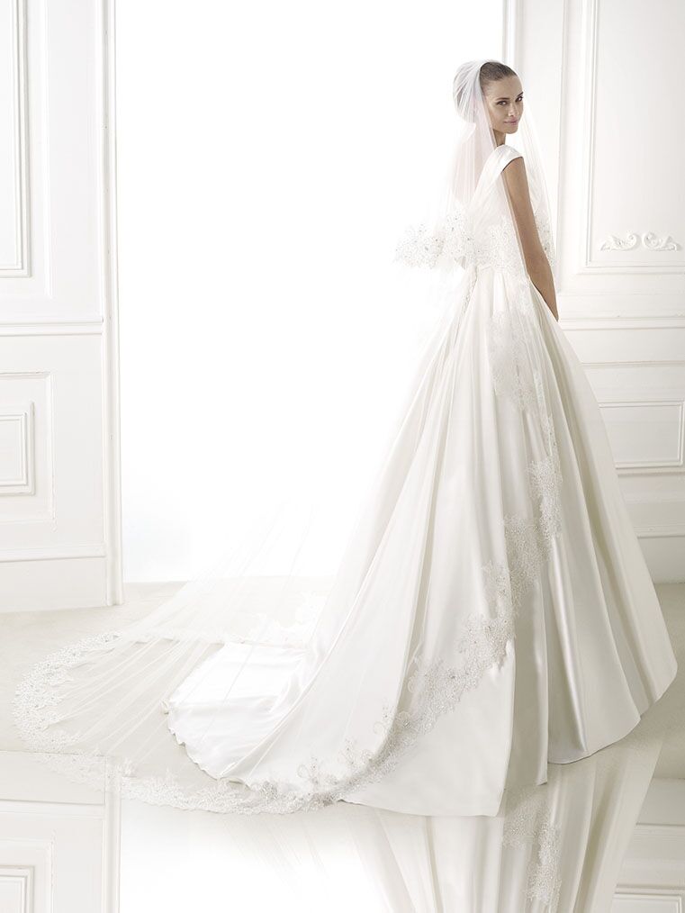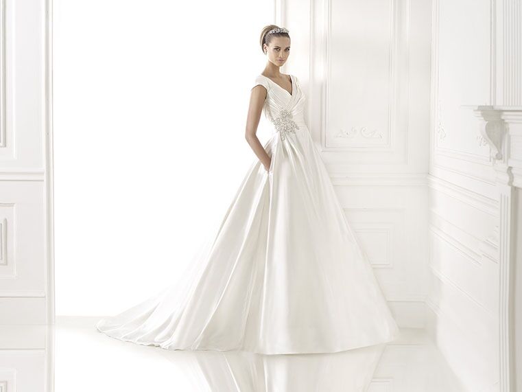 Taffeta dress. Draped V-neck bodice with gemstone embroidery on the side. Wide skirt with pleats on the side below the embroidery. Side pockets.