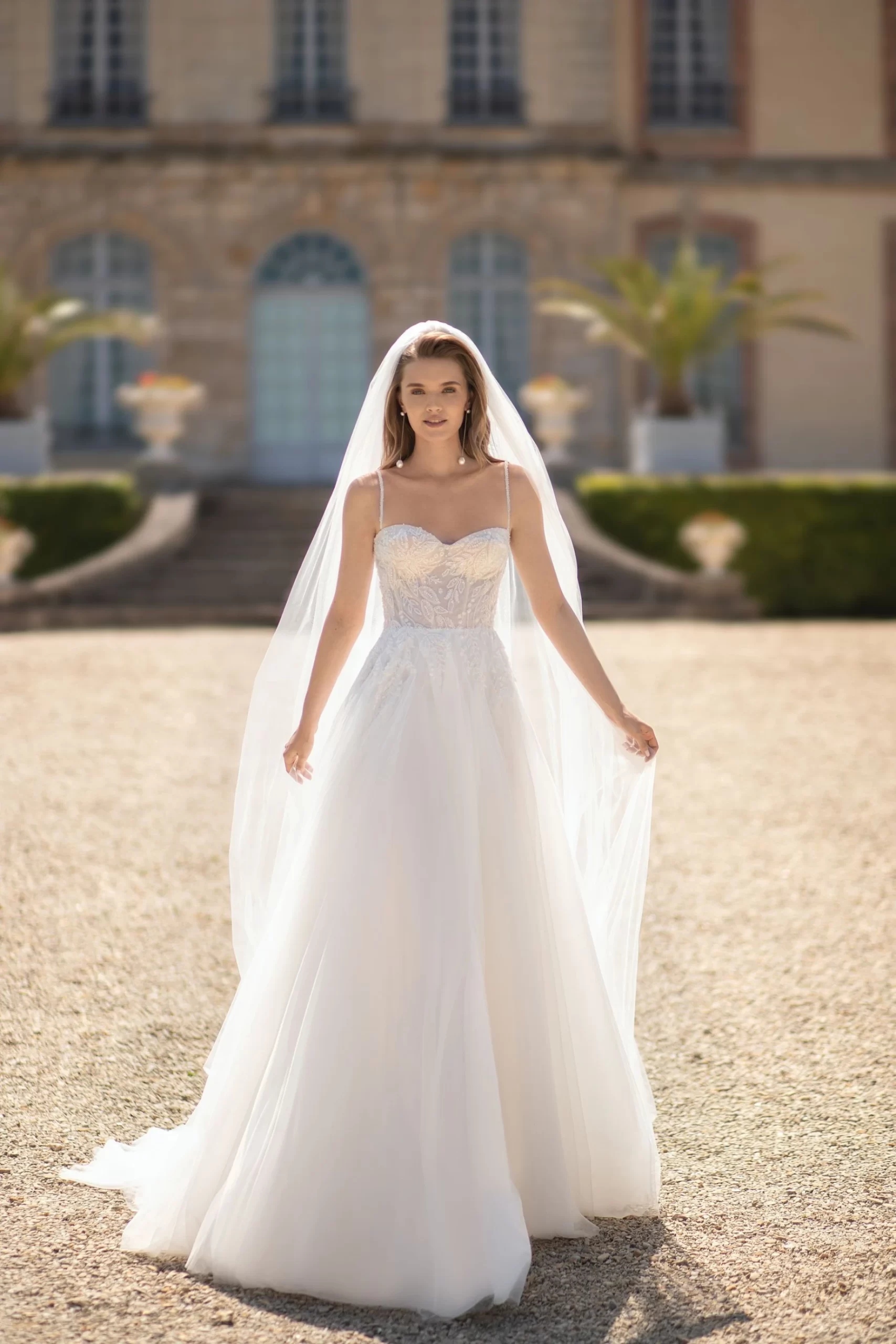 The main Cassandra detail of this romantic A-silhouette dress is the translucent corset with a symbolic heart neckline on the straps.