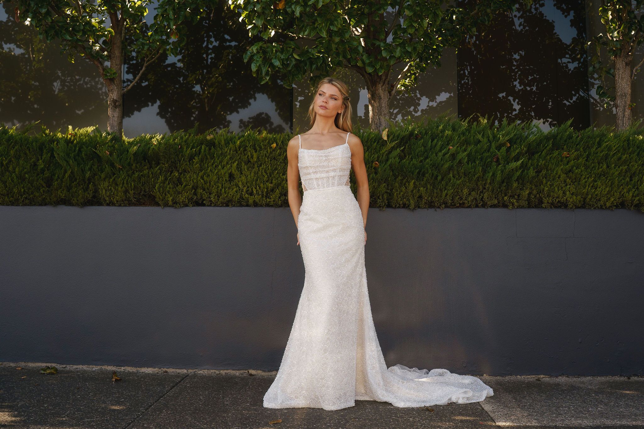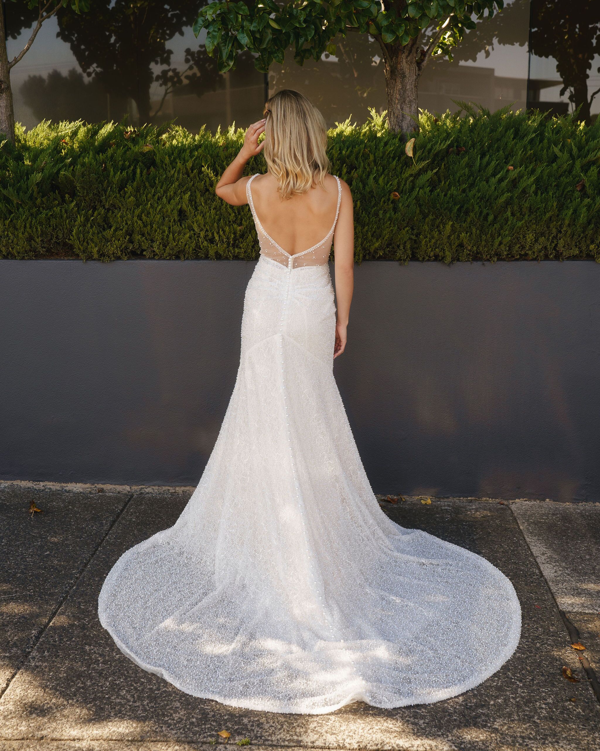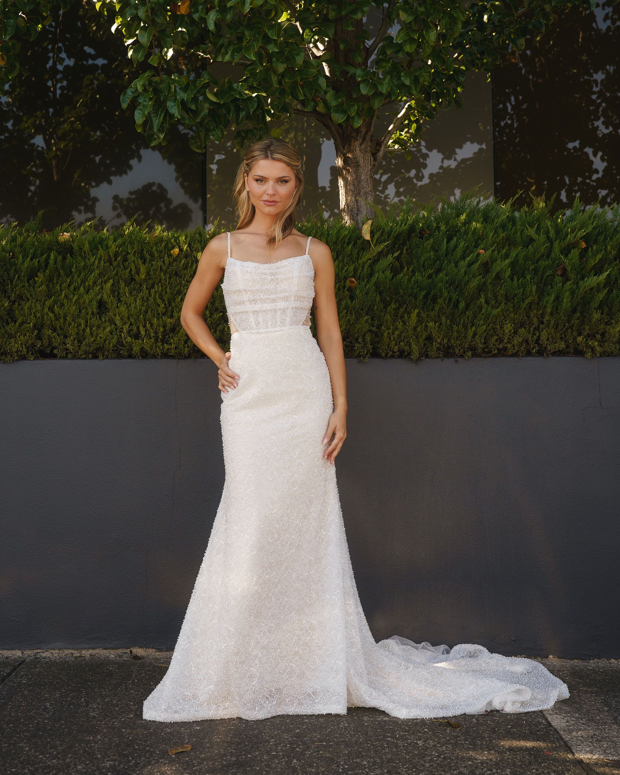 Make a red carpet–worthy entrance in the COSIMA fully beaded fitted wedding gown, a dazzling design that radiates Hollywood glamour and modern sensuality. Covered in intricate beadwork from bodice to hem, this gown hugs the body with a curve-contouring silhouette, perfect for the confident bride who wants to shine.