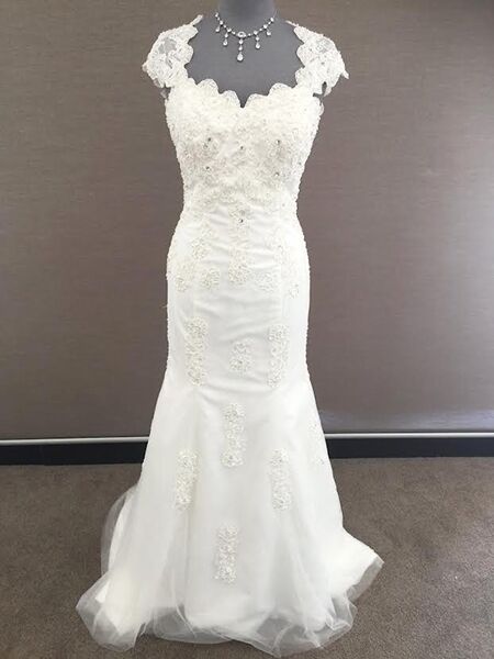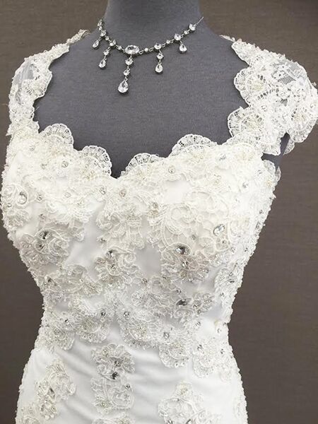 Lace and beaded wedding dress with lace cap sleeves and sweetheart neckline