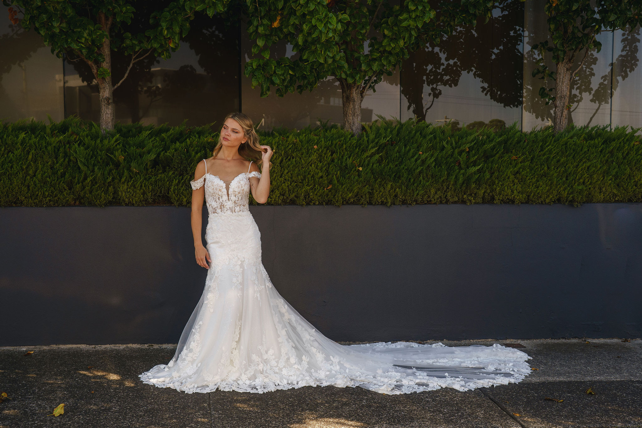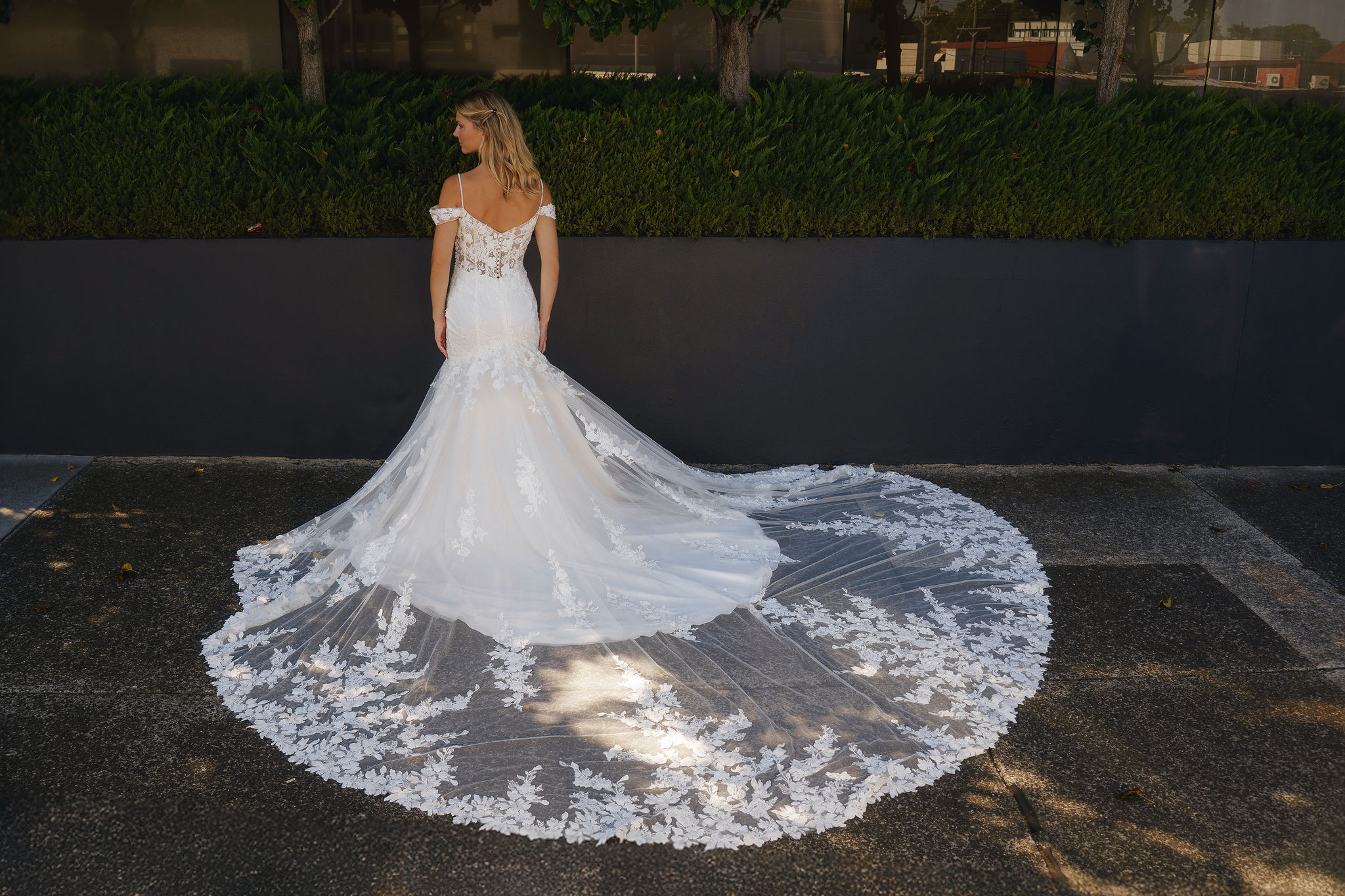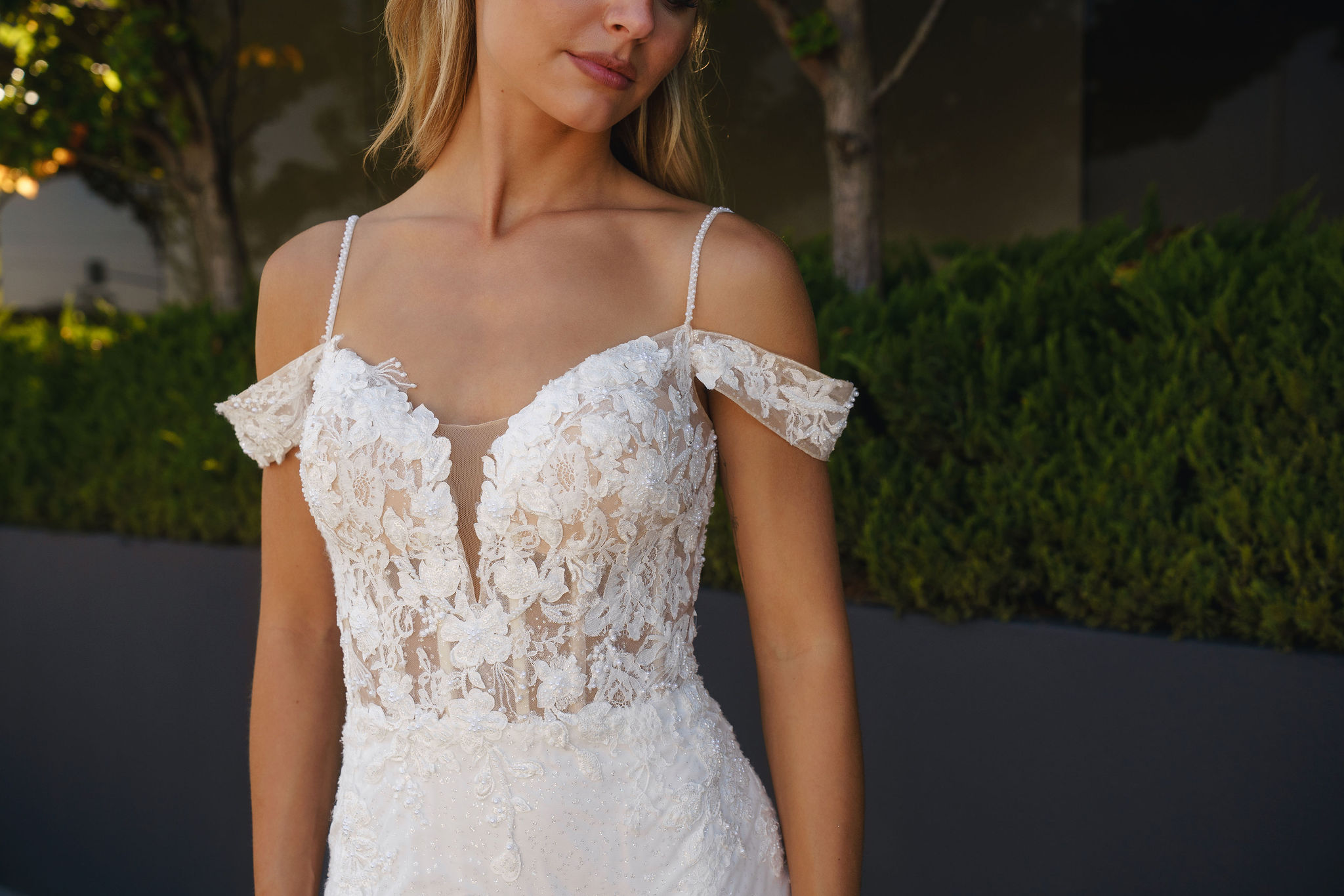 Delicate beaded thin straps frame the shoulders, while detachable off-shoulder straps add a romantic, fashion-forward touch. The silhouette hugs the body through the hips before flaring into a dramatic mermaid skirt, finished with a spectacular lace train that trails behind you in breathtaking detail.