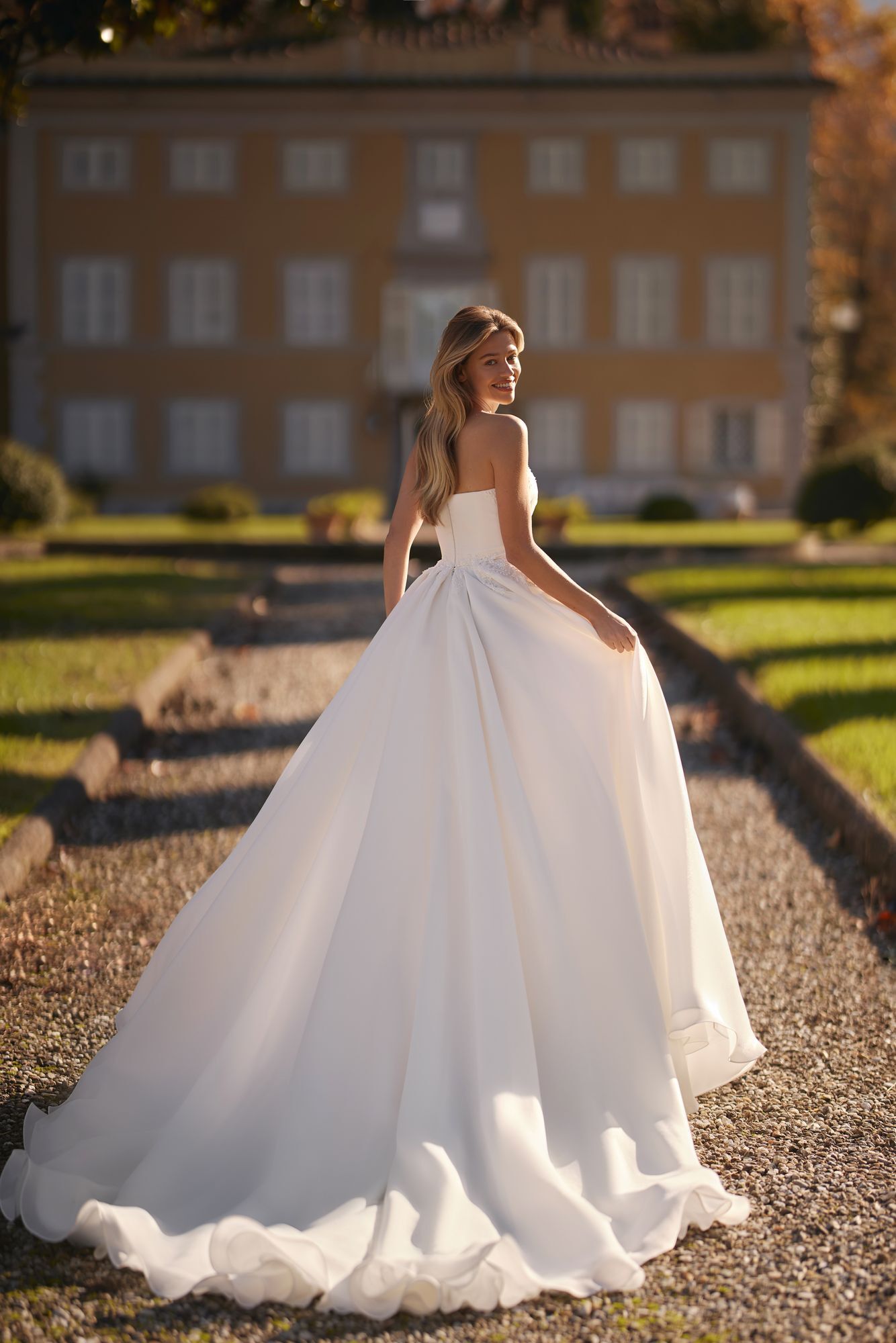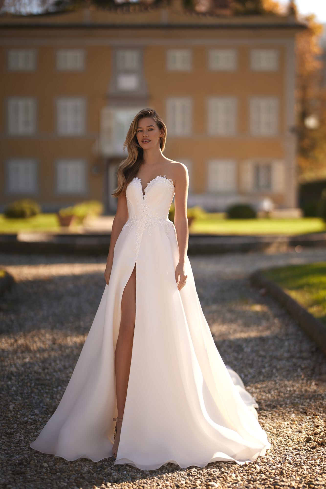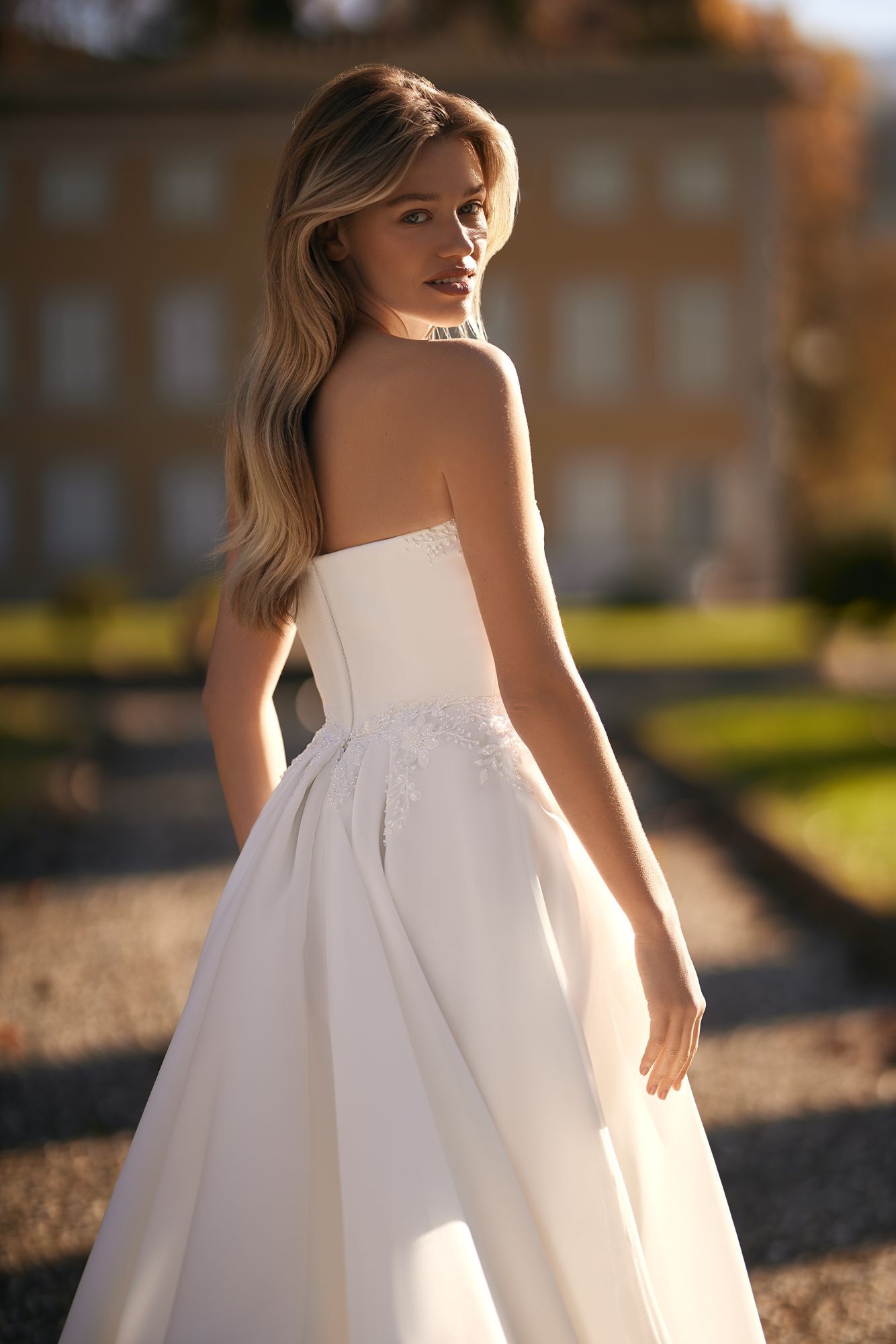 The bride, dressed in a luxurious Mikado fabric A-line dress, shines with happiness and confidence. The corset features a heart-shaped cutout, while the puffy skirt features a train, slit, and lace details.