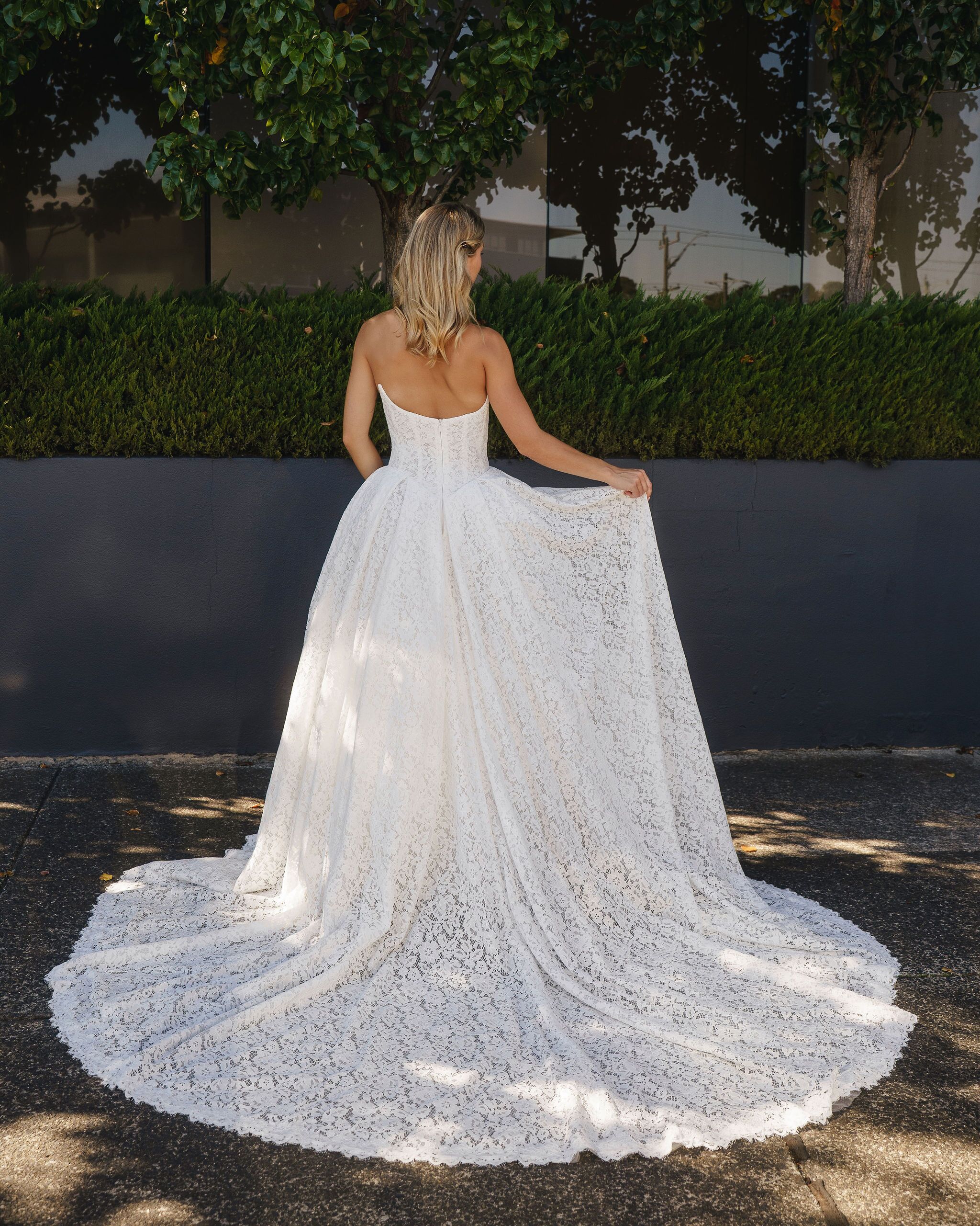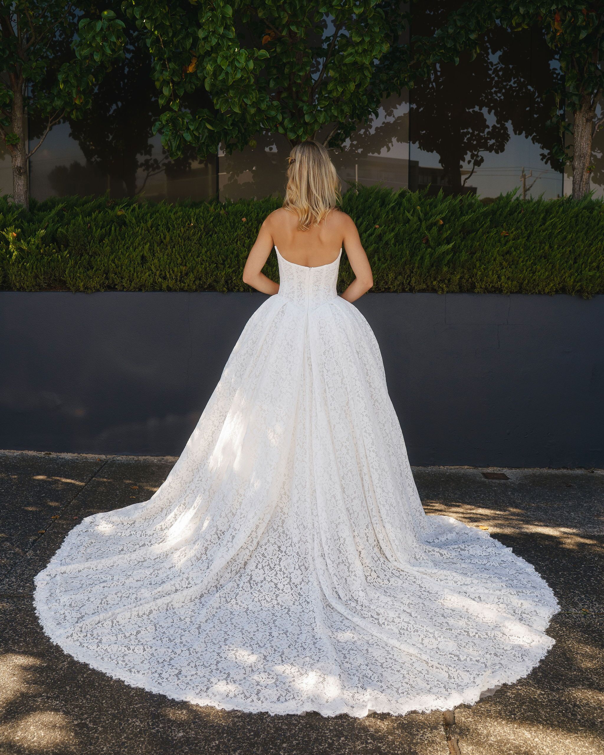 Bold, romantic, and unapologetically grand, this dramatic lace wedding gown is for the bride who wants to make a majestic statement from aisle to afterparty.