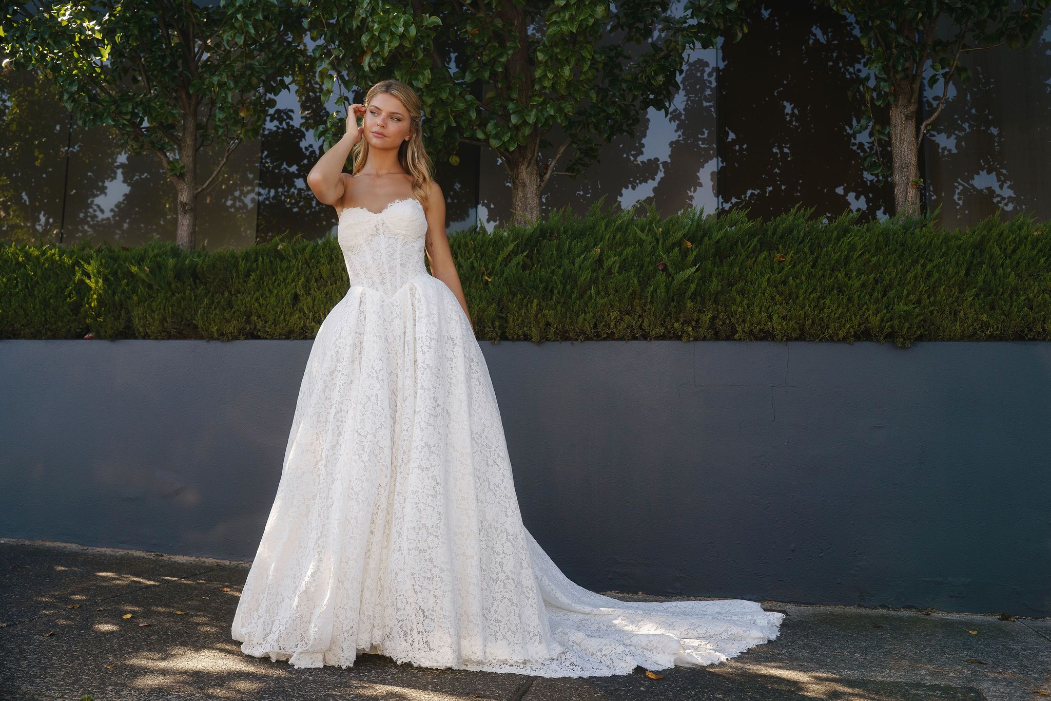 DOLCE is a Full Lace Regal Ballgown Wedding Dress with Sweetheart Neckline – Dramatic Renaissance-Inspired Bridal Gown.