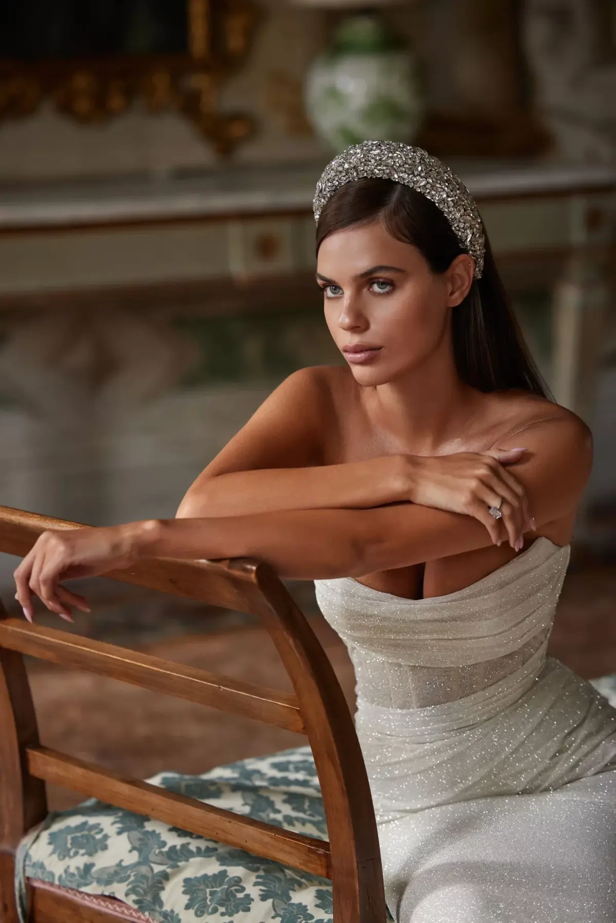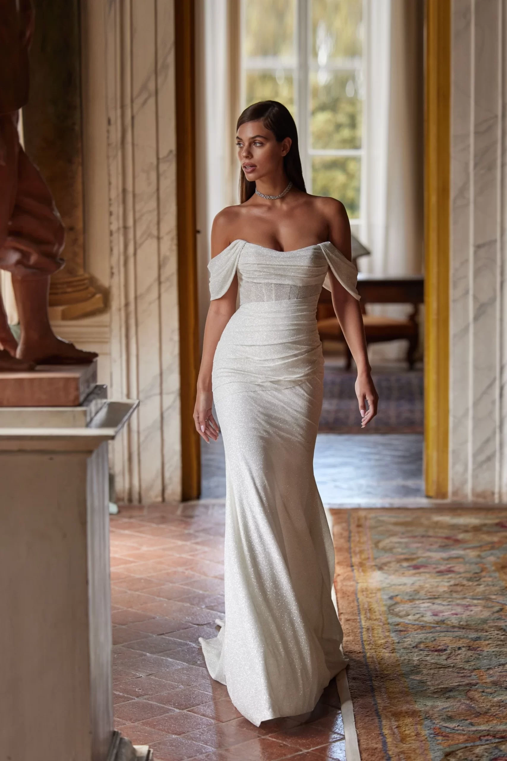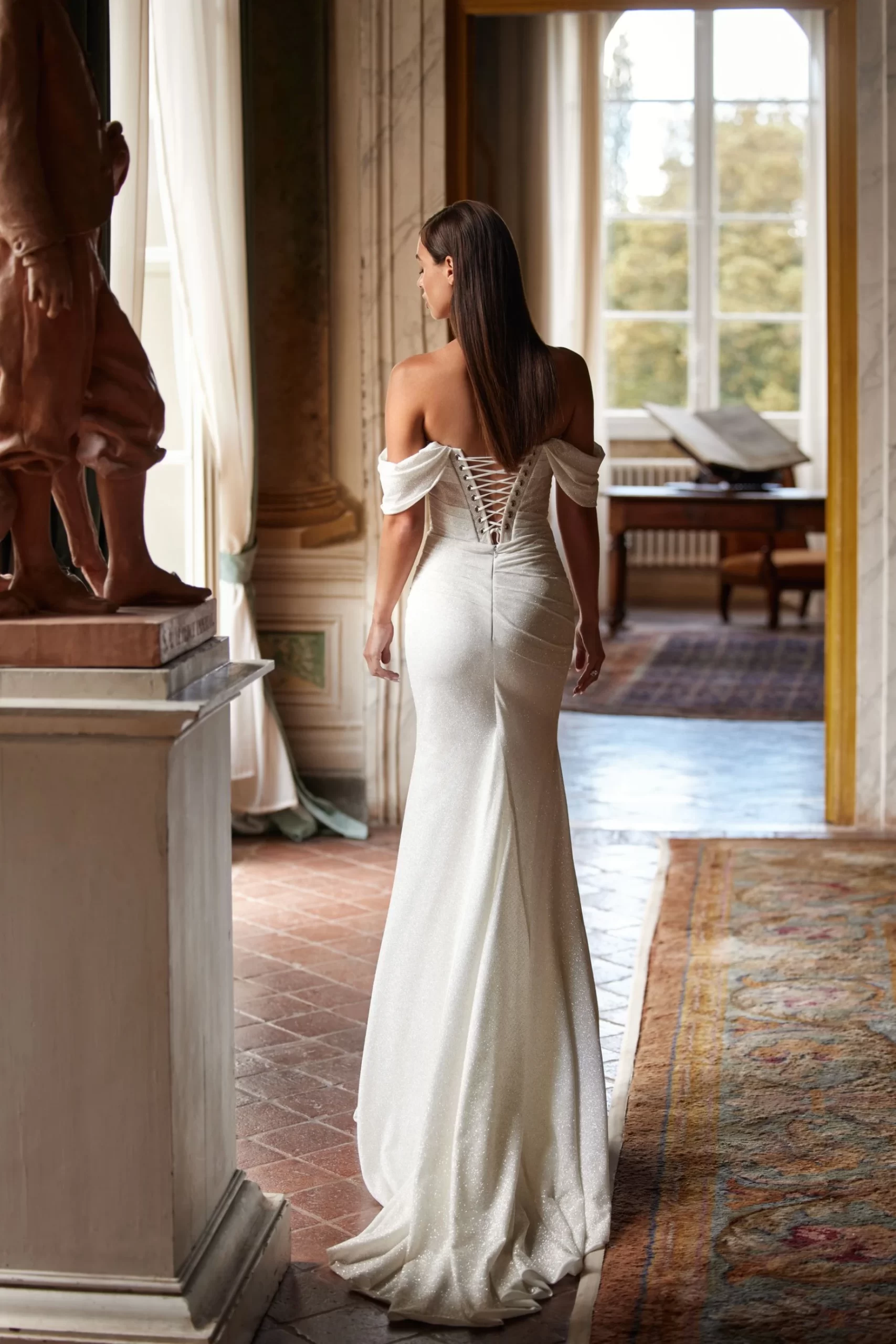 Restrained sexuality, sophisticated elegance, mystery and, at the same time, bold frankness, combine the image created with the mermaid dress in ivory colour made of knitted fabric with glitter. A semi-sheer corset with a boat neck, successfully framed by pleats of knitted fabric with a shine, gives the effect of a more voluptuous bust. The back is concave below the level of the shoulder blades and fastens in the centre with eyelets and lacing. The skirt has a tight-fitting shape in the hip area, and at the bottom is an elegant train. The front and back panels of the skirt are decorated with diagonal pleats in the hip area. The skirt fastens in the centre of the back panel with a hidden zipper. Removable decorative wing sleeves complete the look. This dress is available in a version with a fastener in the centre of the back of the corset with expander hooks—an incomparably graceful and seductive image.