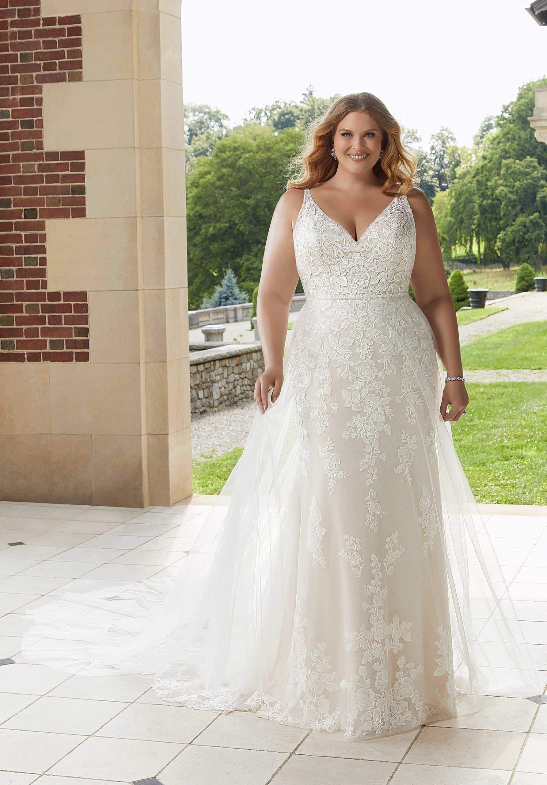 Esme is a stunning sheath wedding dress with a blingy crystal beaded v-neckline and scoop back on a relaxed sheath silhouette. The sparkle net fabric shimmers from all angles, while the frosted, floral embroidered lace and sheer petal train keep the look soft and romantic. Add on the airy, detachable tulle overskirt for extra dama as you walk down the aisle. Shown in Ivory/Champagne
