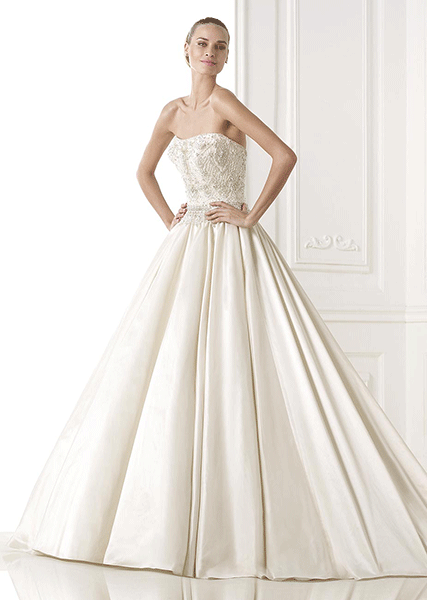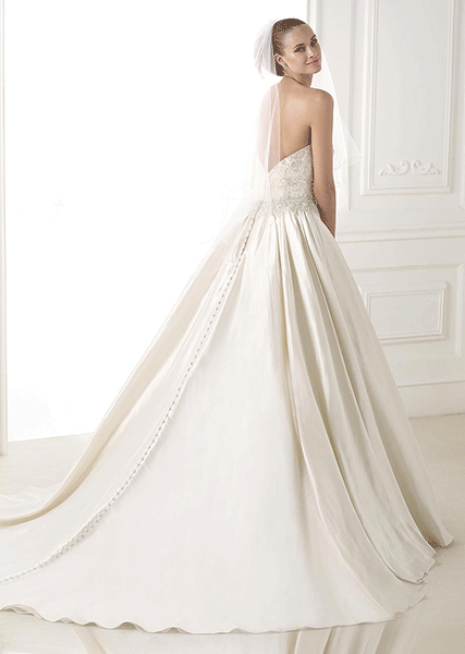 Taffeta princess-style dress. Embroidered bodice with a dramatic back. Voluminous taffeta skirt with buttons down to the train.