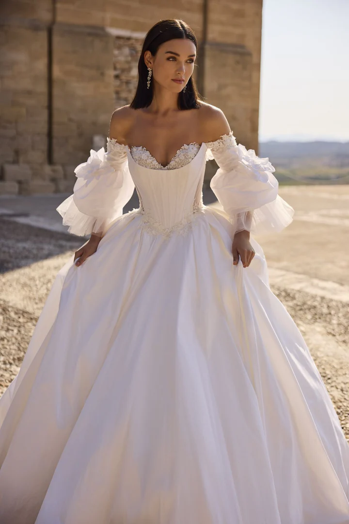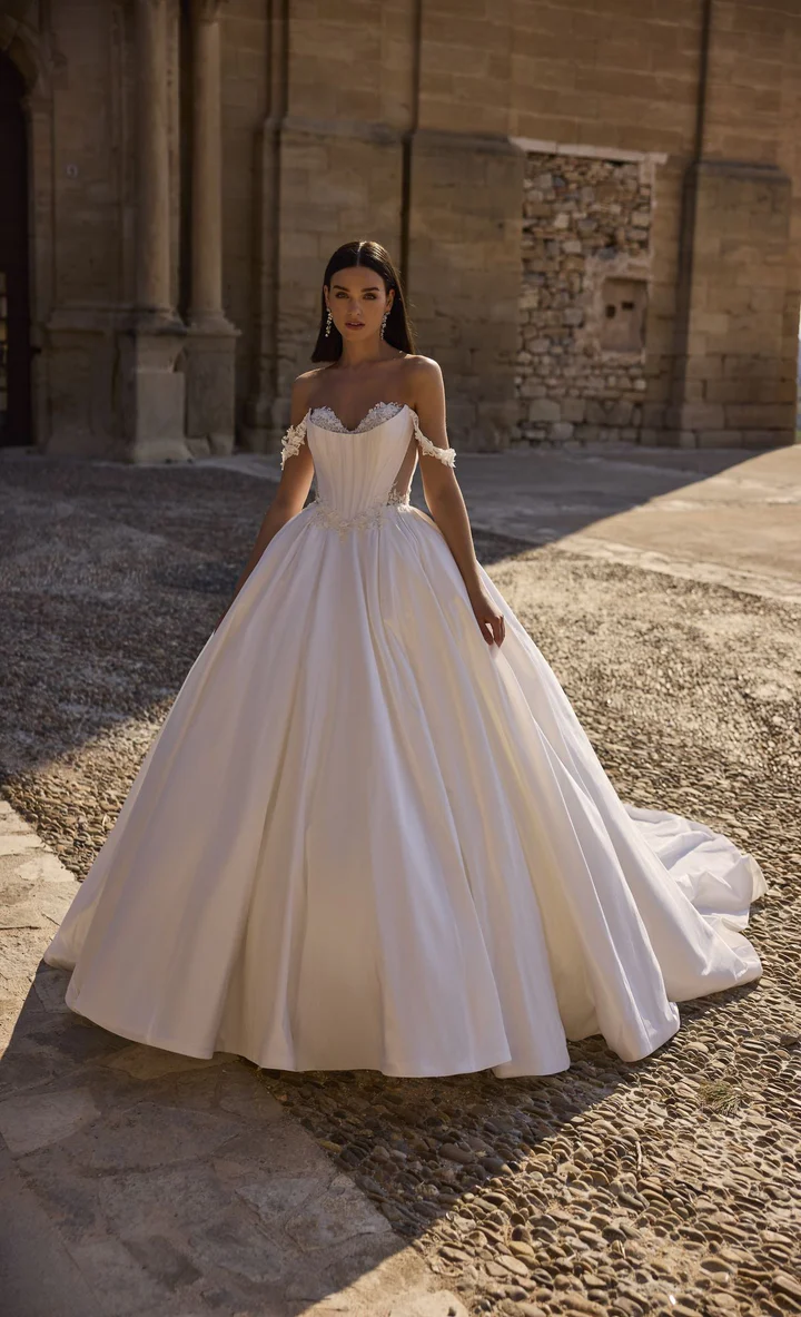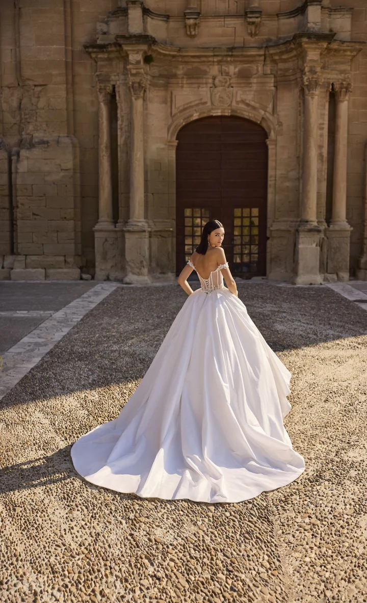 FIORELLA is a breathtaking ballgown wedding dress that strikes the perfect balance between timeless romance and contemporary style. The cinched waist creates a flattering hourglass silhouette, flowing into a voluminous skirt that embodies classic bridal grandeur.