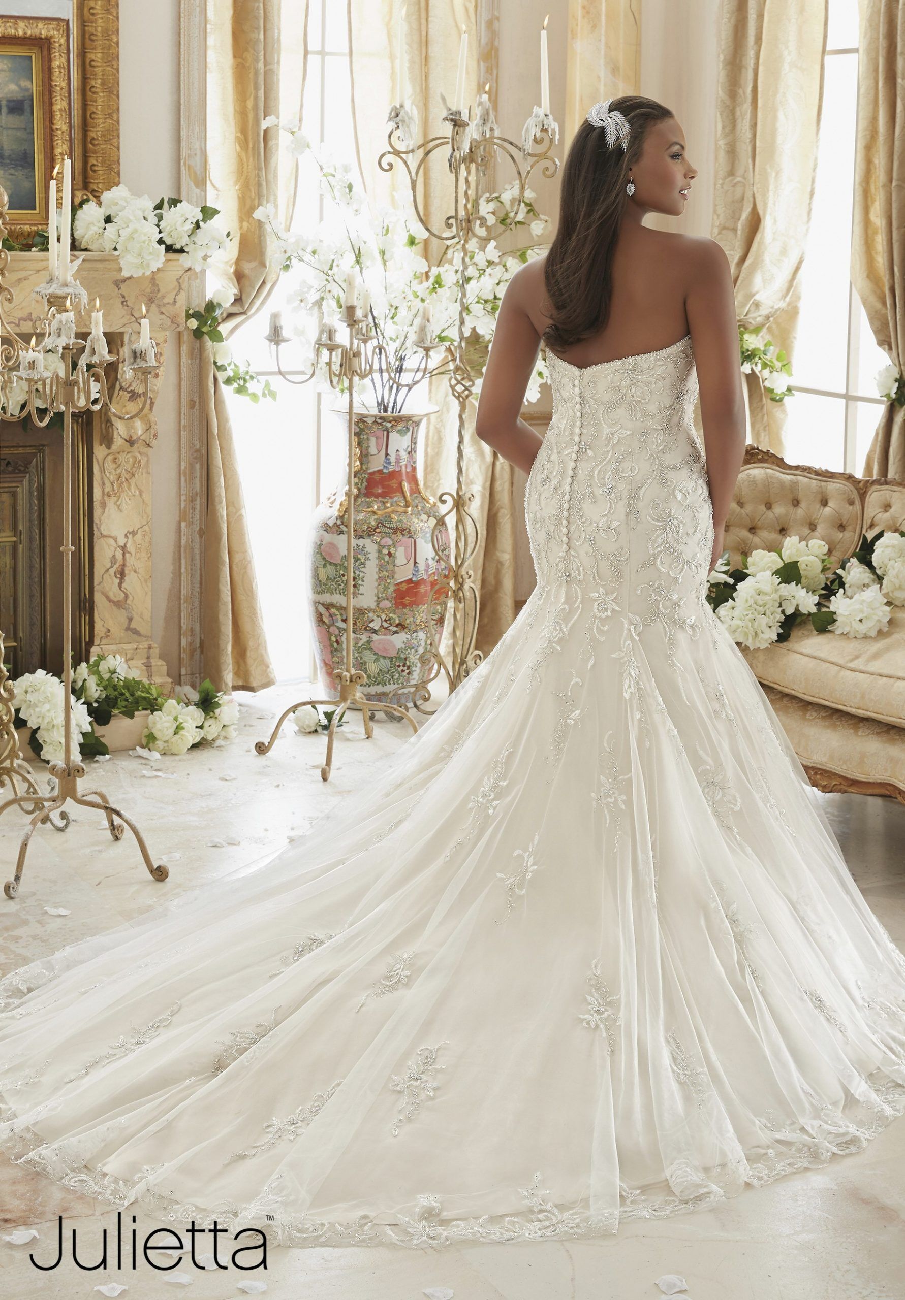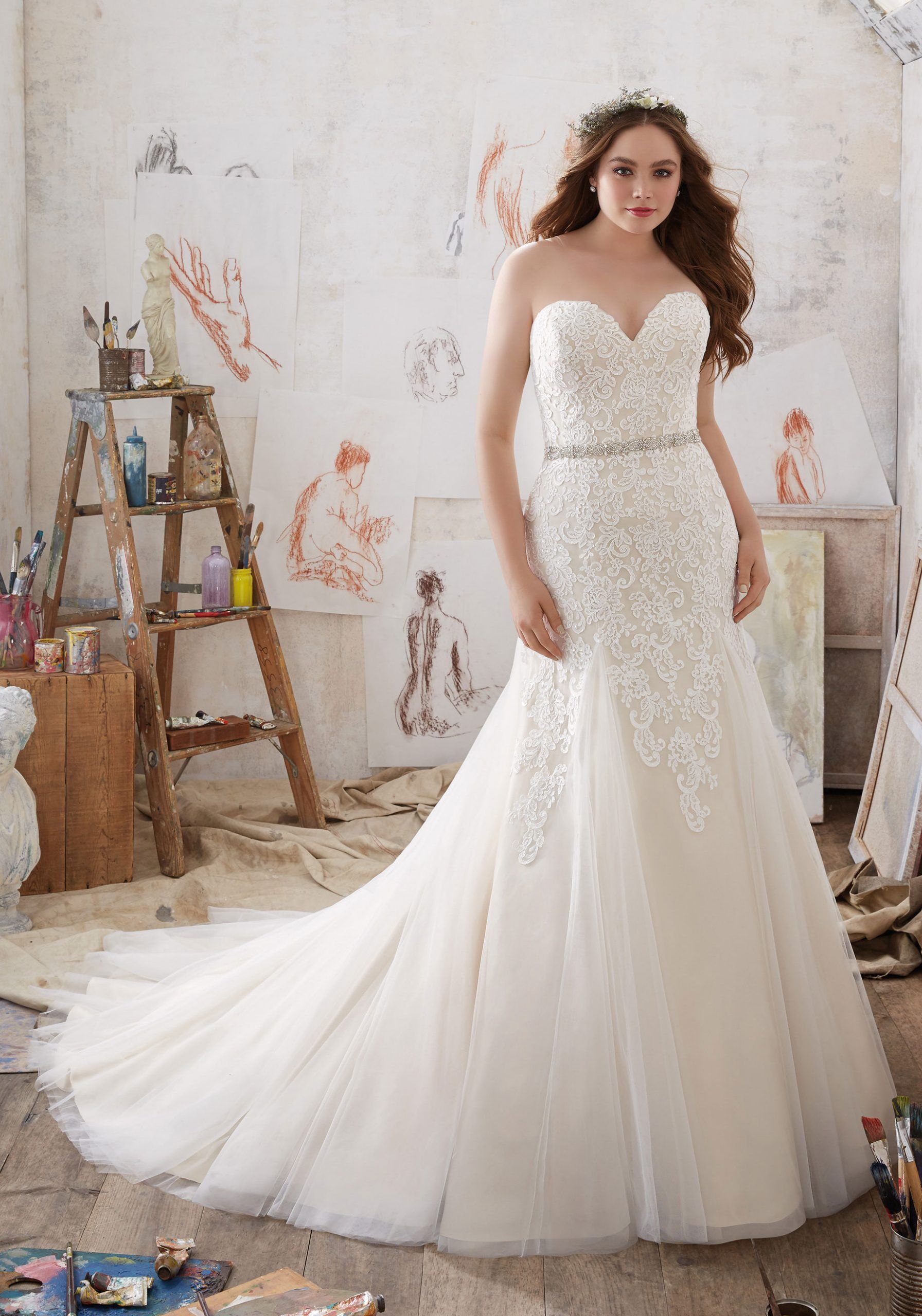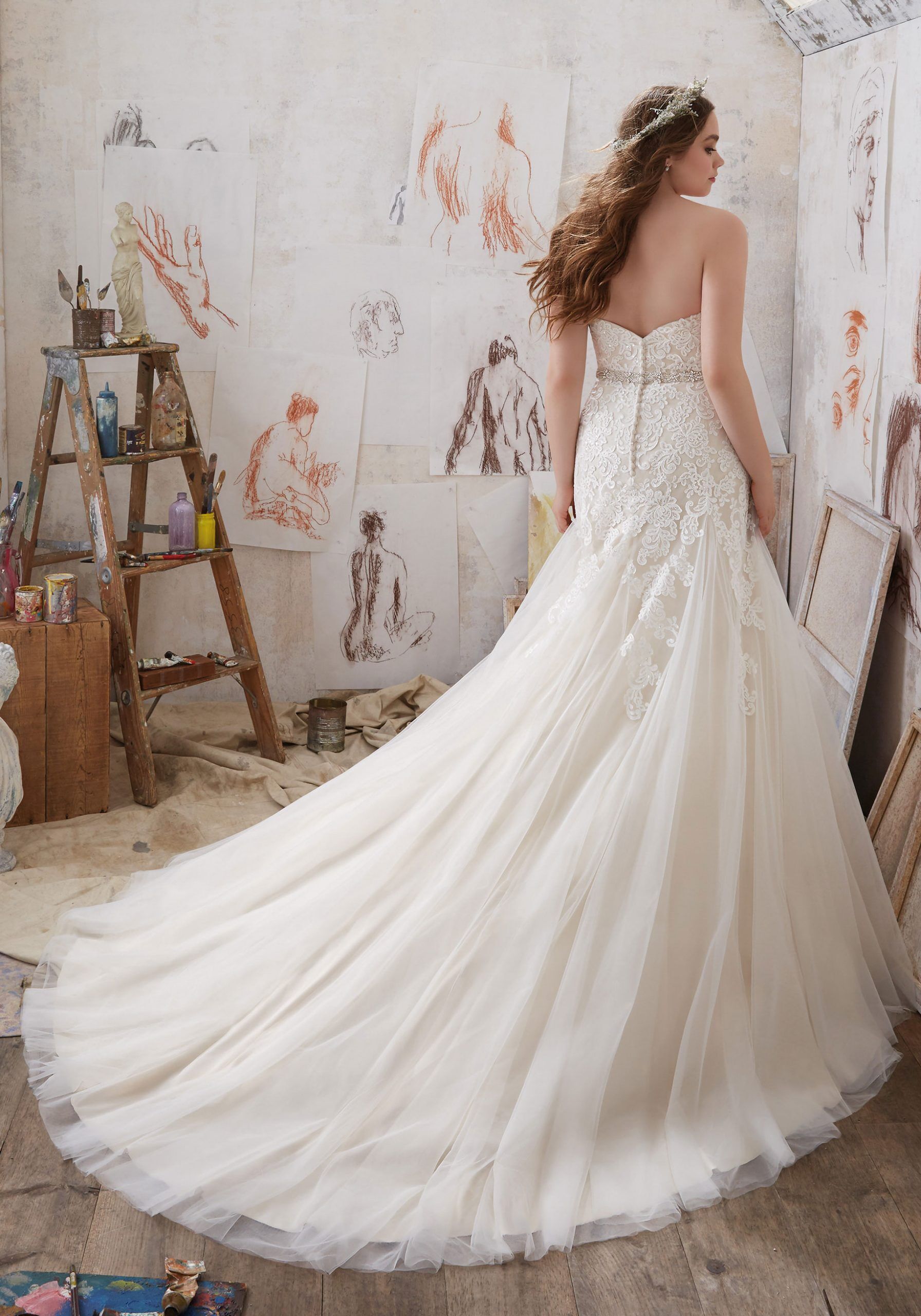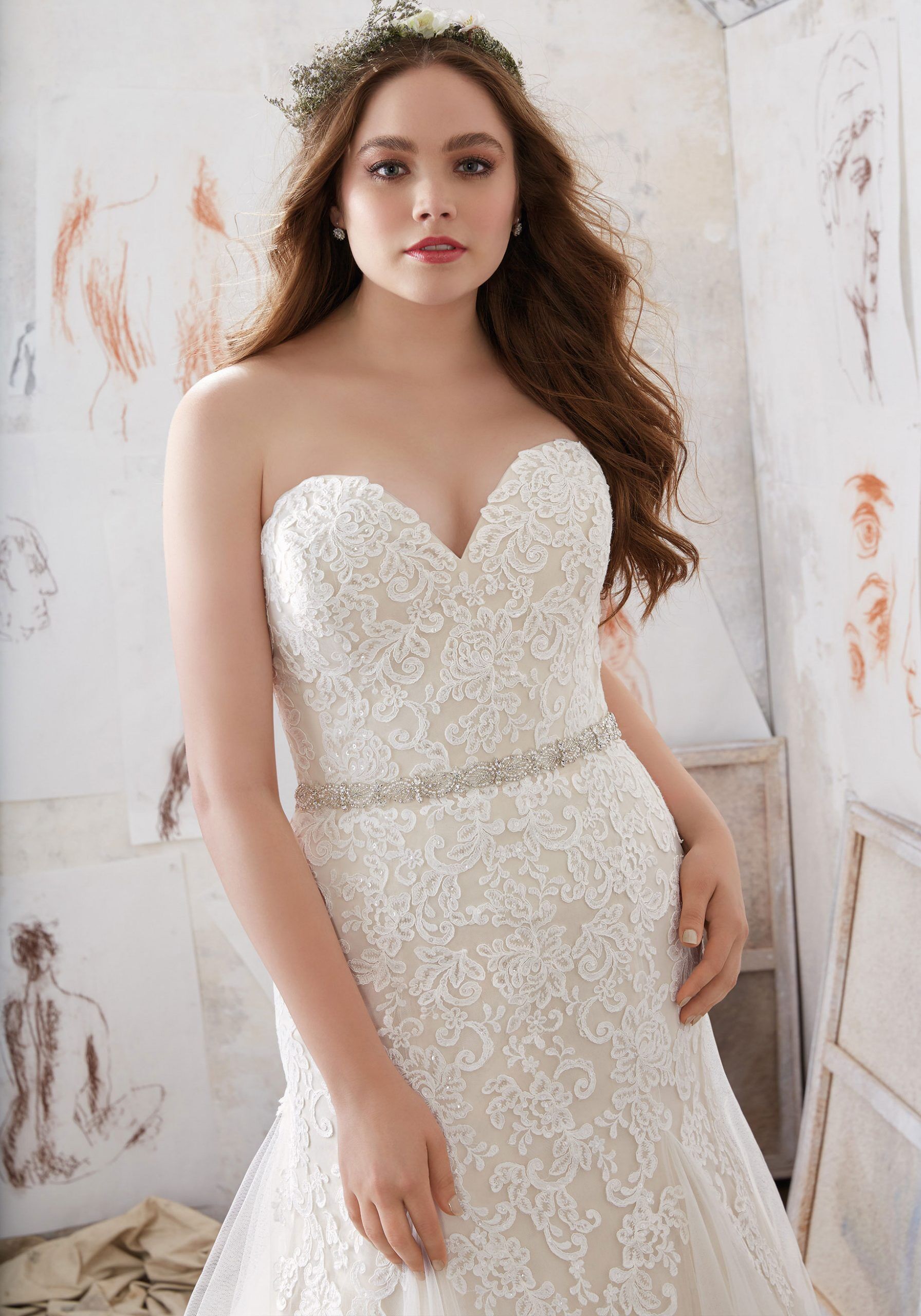 This Glamorous Fit & Flare Wedding Gown Features Frosted Alençon Lace Appliqués on Net.