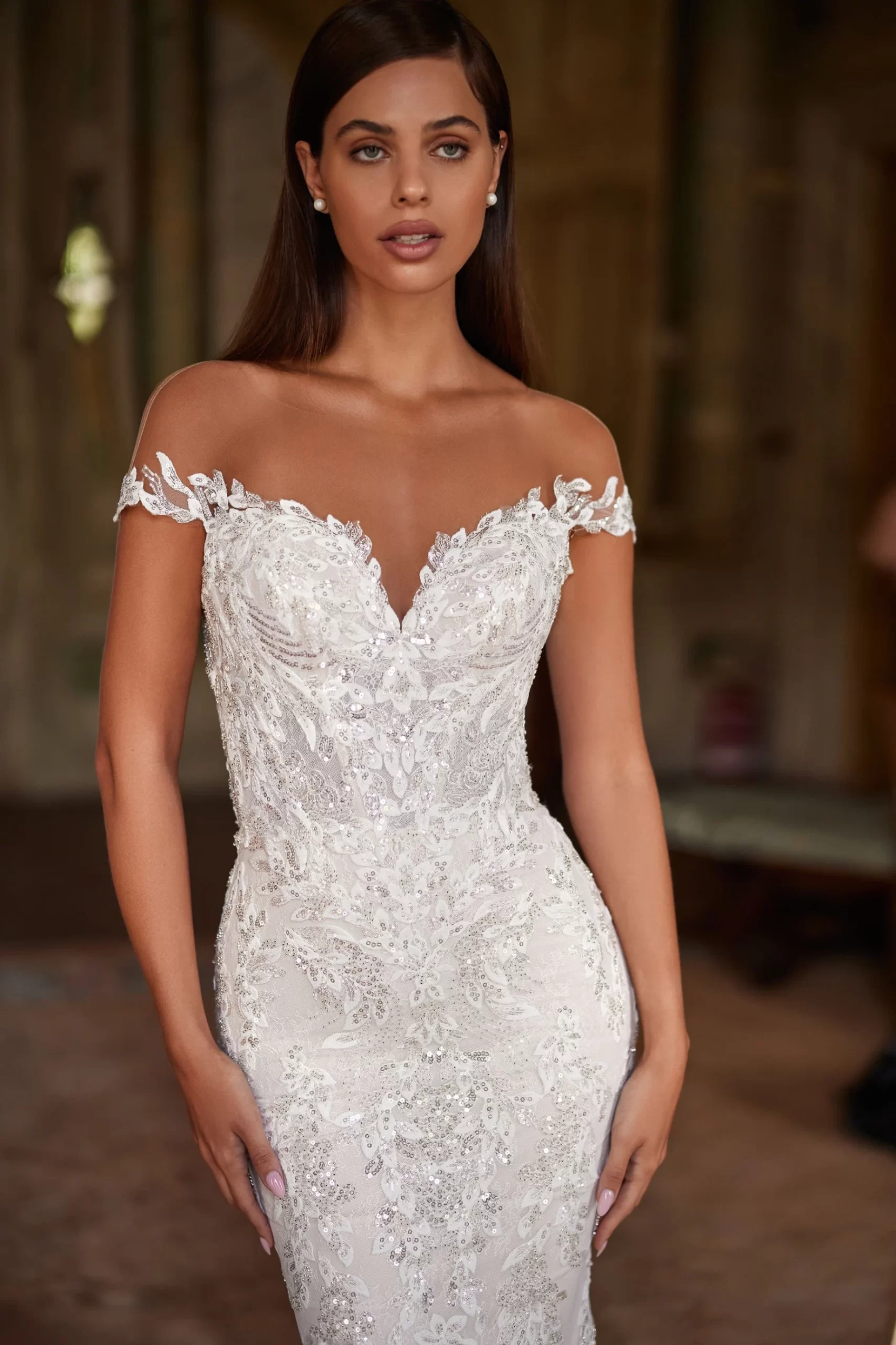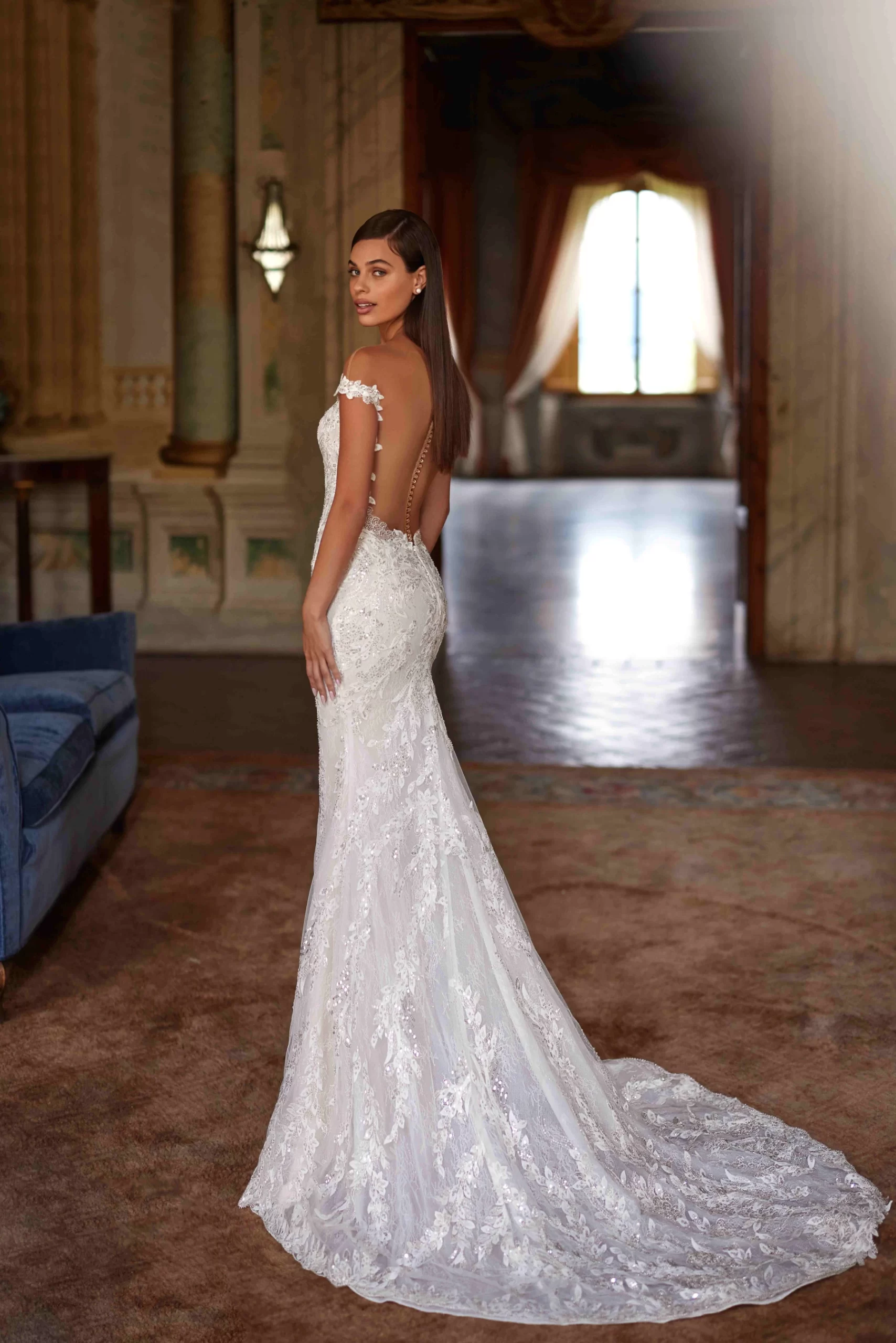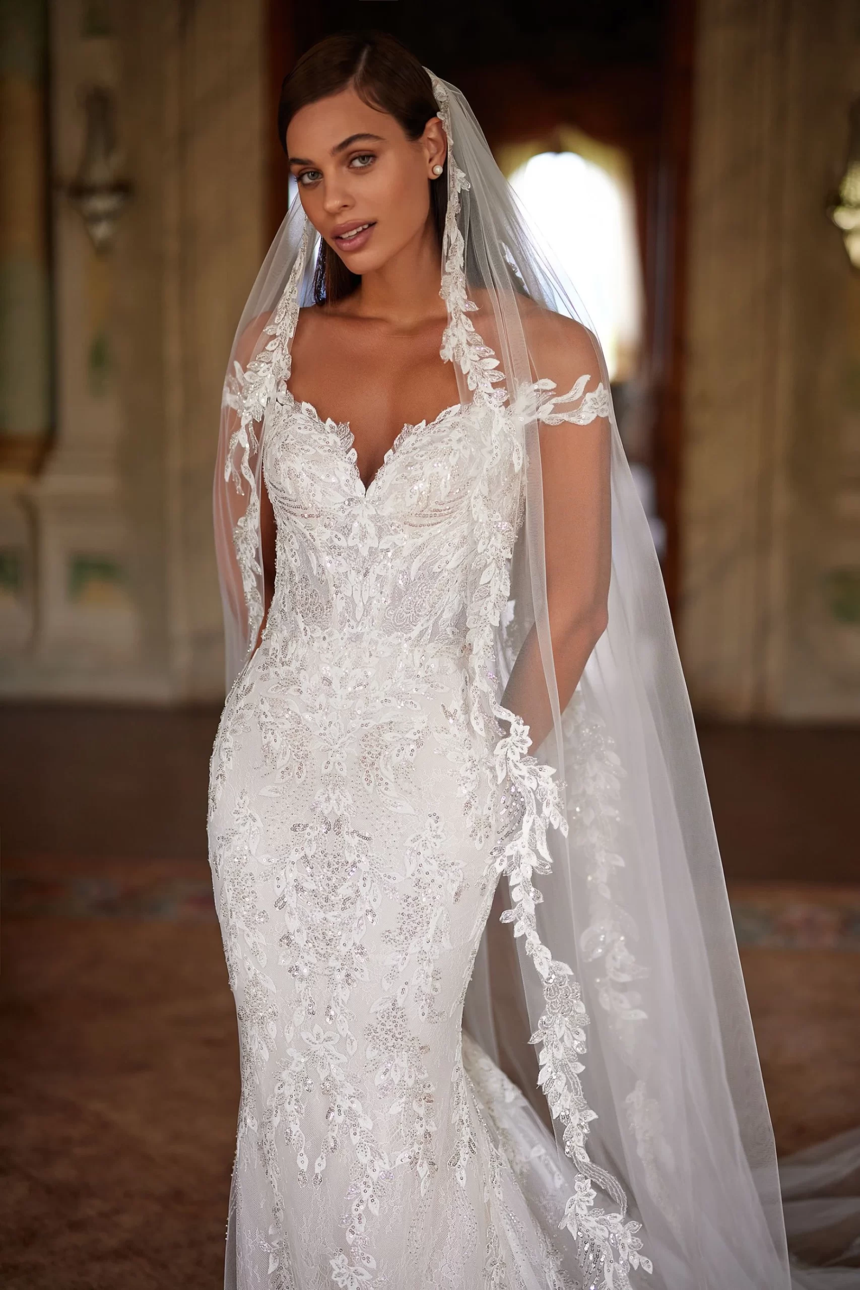 The bride will successfully emphasize refined gracefulness and sexuality by choosing a mermaid silhouette dress in light skin color made of embroidered lace. A semi-transparent top with a heart cutout and a nude-colored sewn-in tank top will attract the attention of the groom and excite his unbridled imagination. The flawless curves of the body and sophisticated perfection are perfectly emphasized by the back of the dress, which is made of nude-colored mesh, which gives the effect of nakedness. The corset is embellished with embroidered appliqués that accentuate the neckline of the dress and flow smoothly onto the forearm and back of the item. The fitted skirt at the hips, which seductively turns into a luxurious train, will emphasize the ideality of the figure. The skirt fastens in the center of the back panel with a hidden zipper. In this dress, the bride will receive countless compliments.