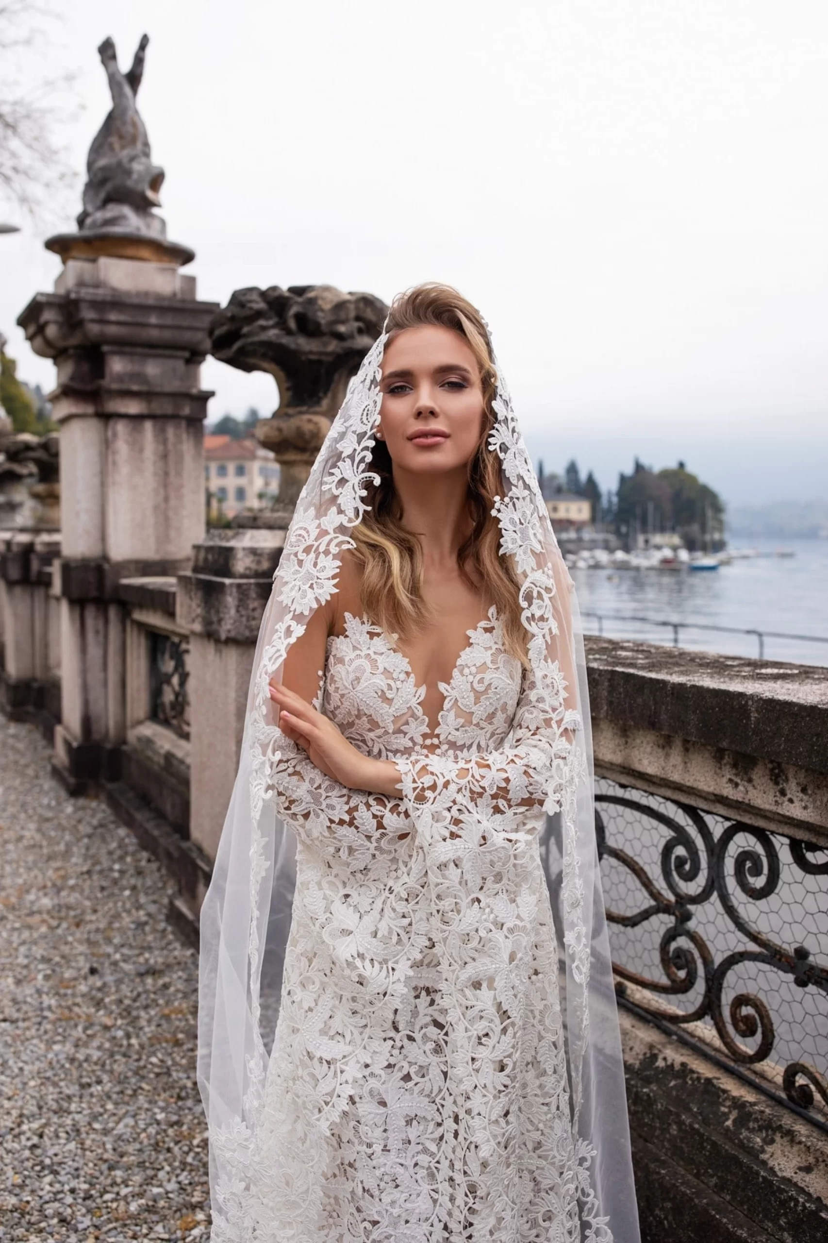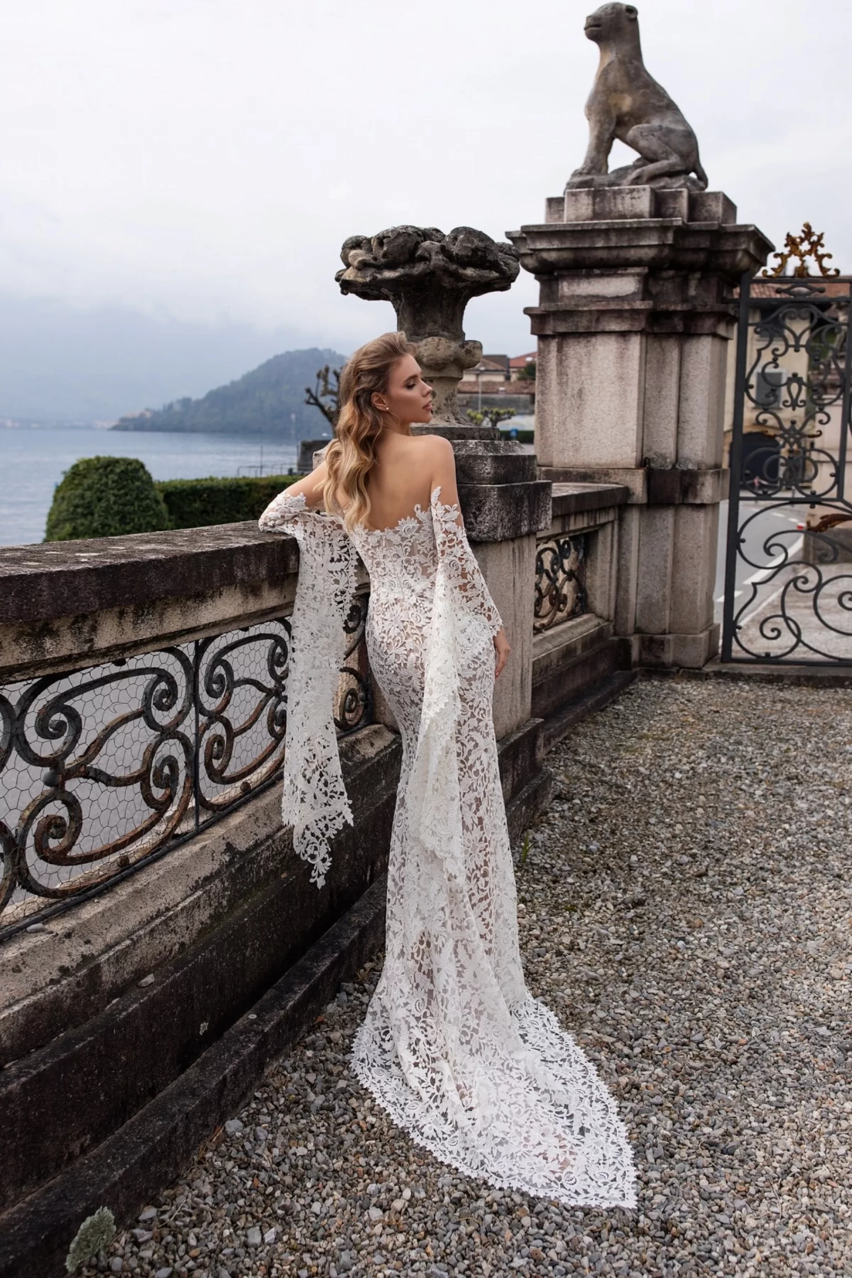This spectacular design dazzles us! One of our favorites. A mermaid cut made entirely in lace with a floral design. A light V-neck and cascading sleeves are the options for a modern and different bride.