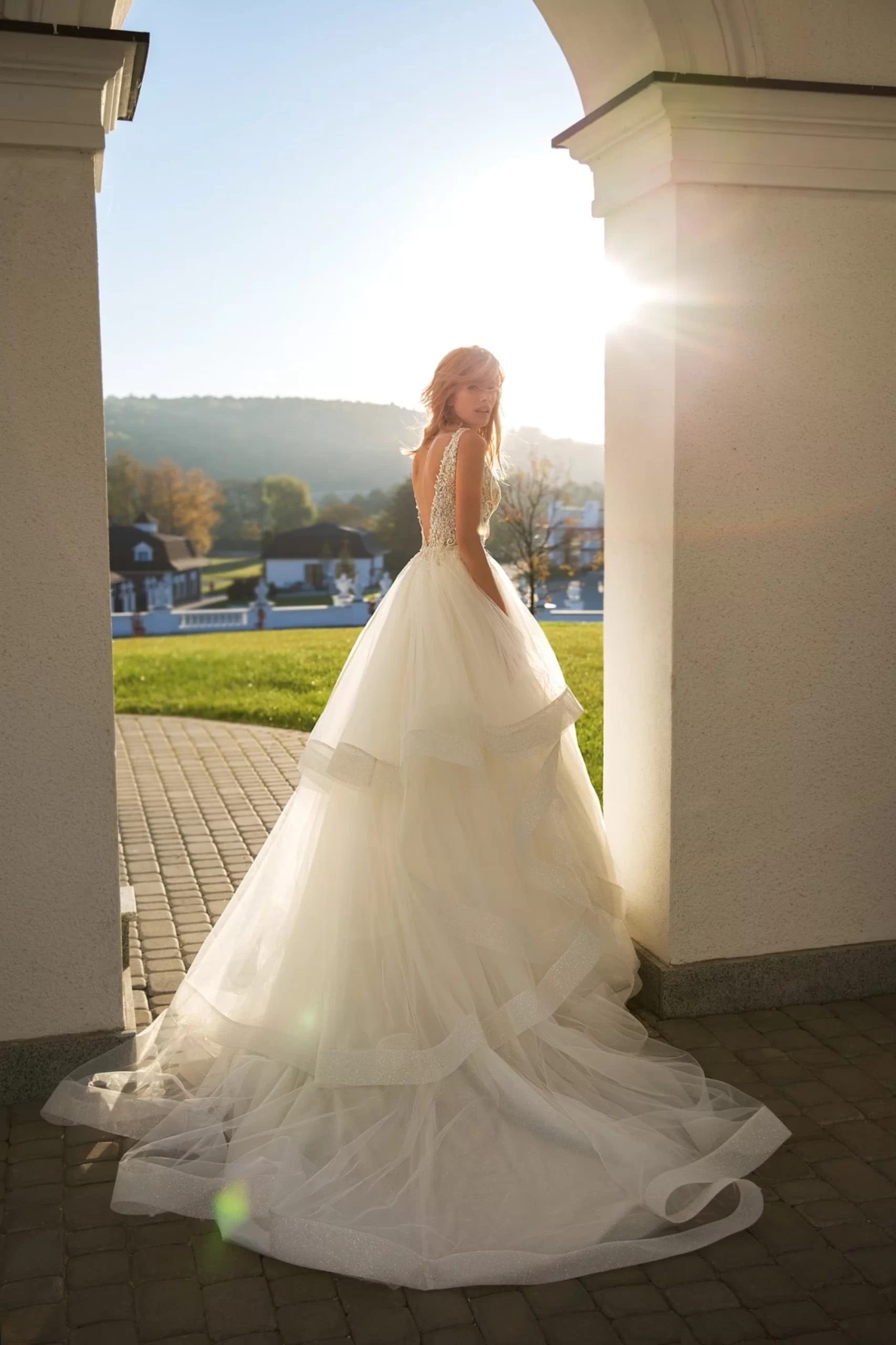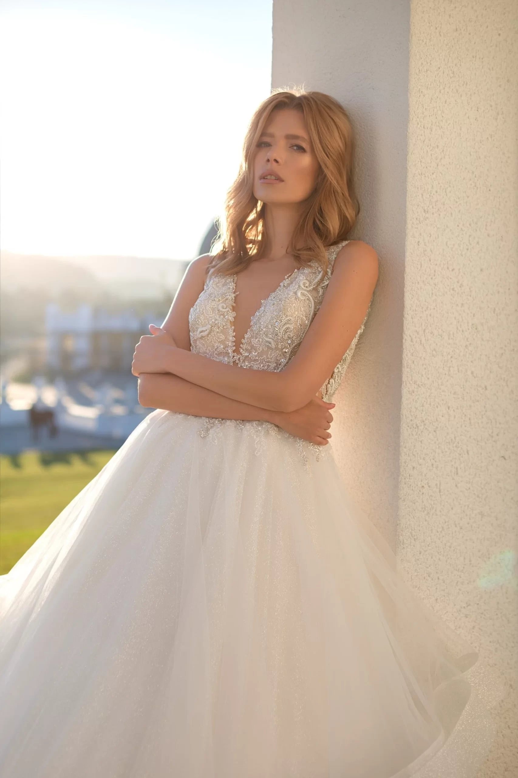Airy lightness, freedom and grace of movement the bride will be able to feel if she chooses an A-line wedding dress in ivory color. The semi-transparent corset is made of delicate glitter, with a V shaped neckline and a nude mesh insert in the centre that reaches the waistline. The...