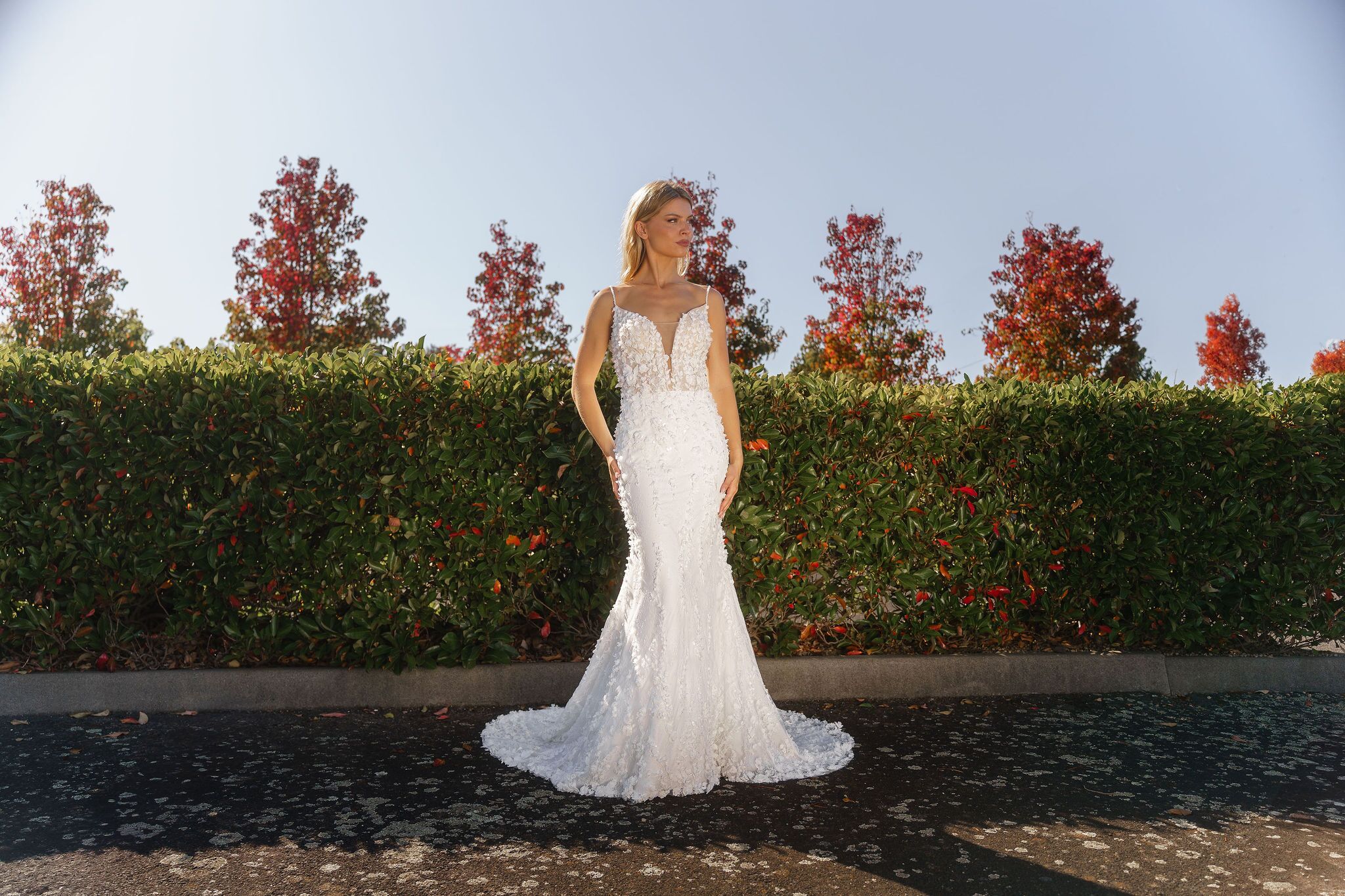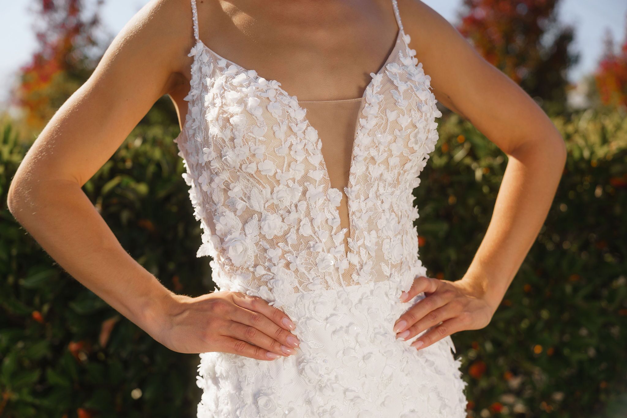 Delicate 3D floral appliqués bloom across the gown, creating depth and texture that beautifully catches the light. Beaded straps add a subtle shimmer and a touch of glamour, framing the shoulders and enhancing the overall elegance. The ivory base with nude underlay creates a gentle contrast that makes the intricate details stand out while maintaining a soft, romantic tone.
