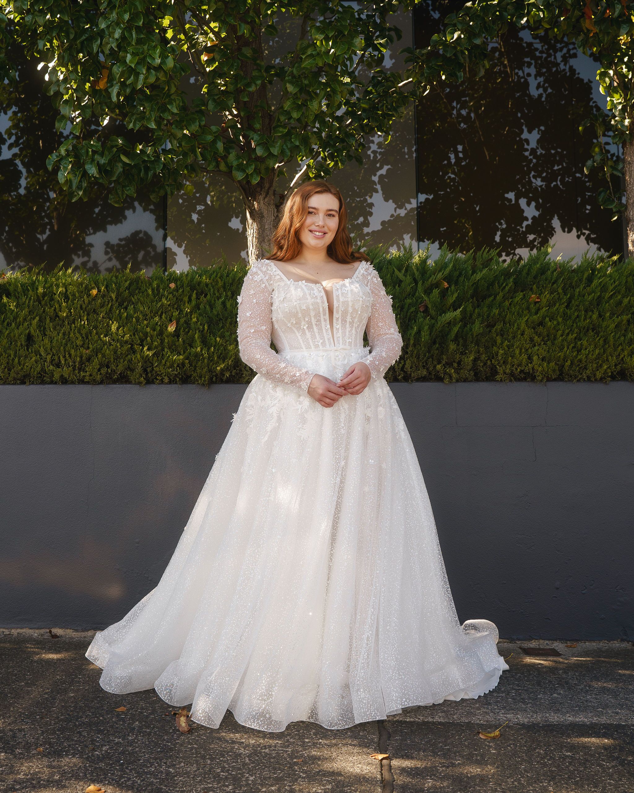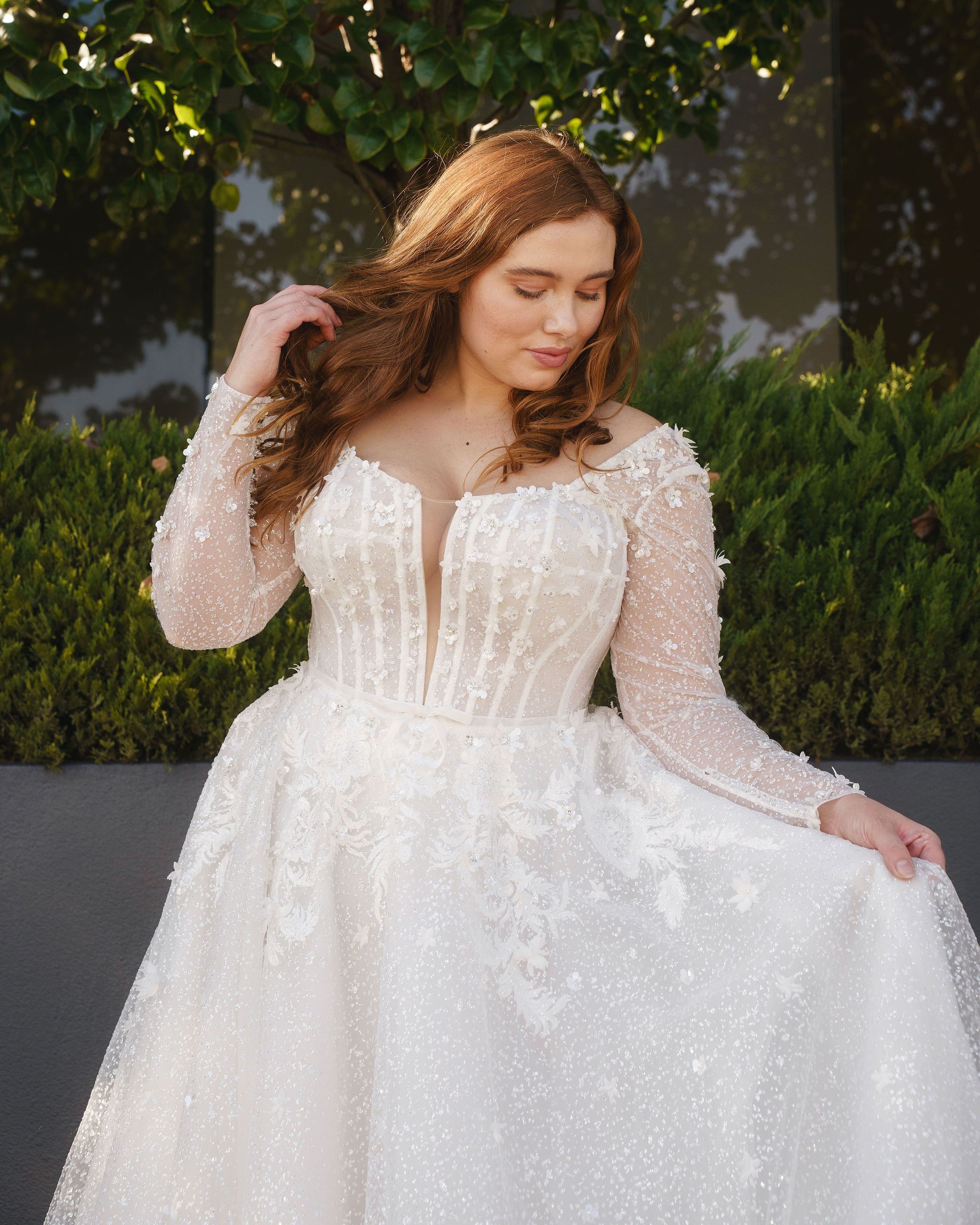 LIANA Plus Size Glitter Wedding Gown with Sheer Boned Bodice, 3D Floral Motifs & Detachable Sleeves – Luxe Tulle Skirt Bridal Look