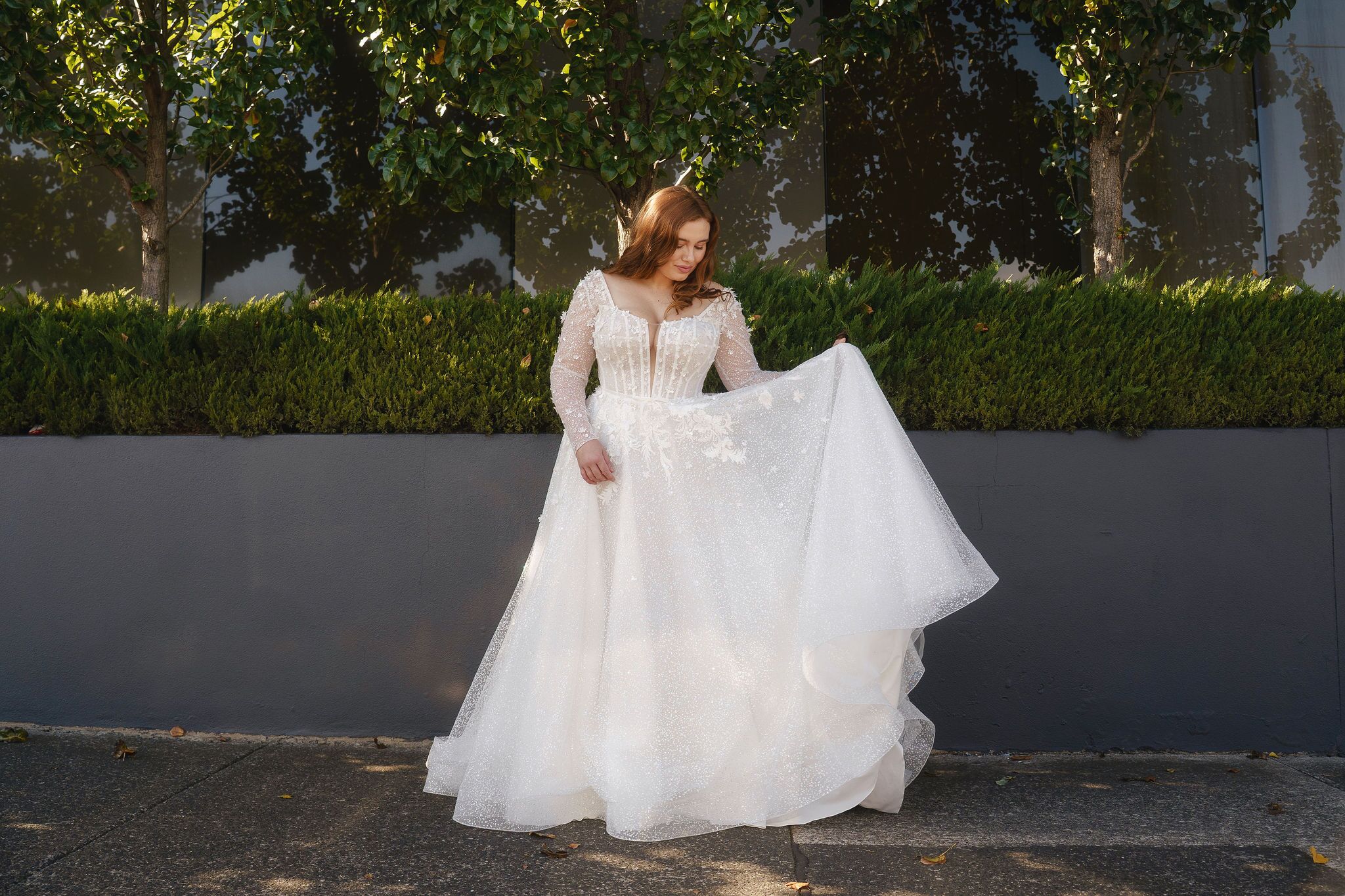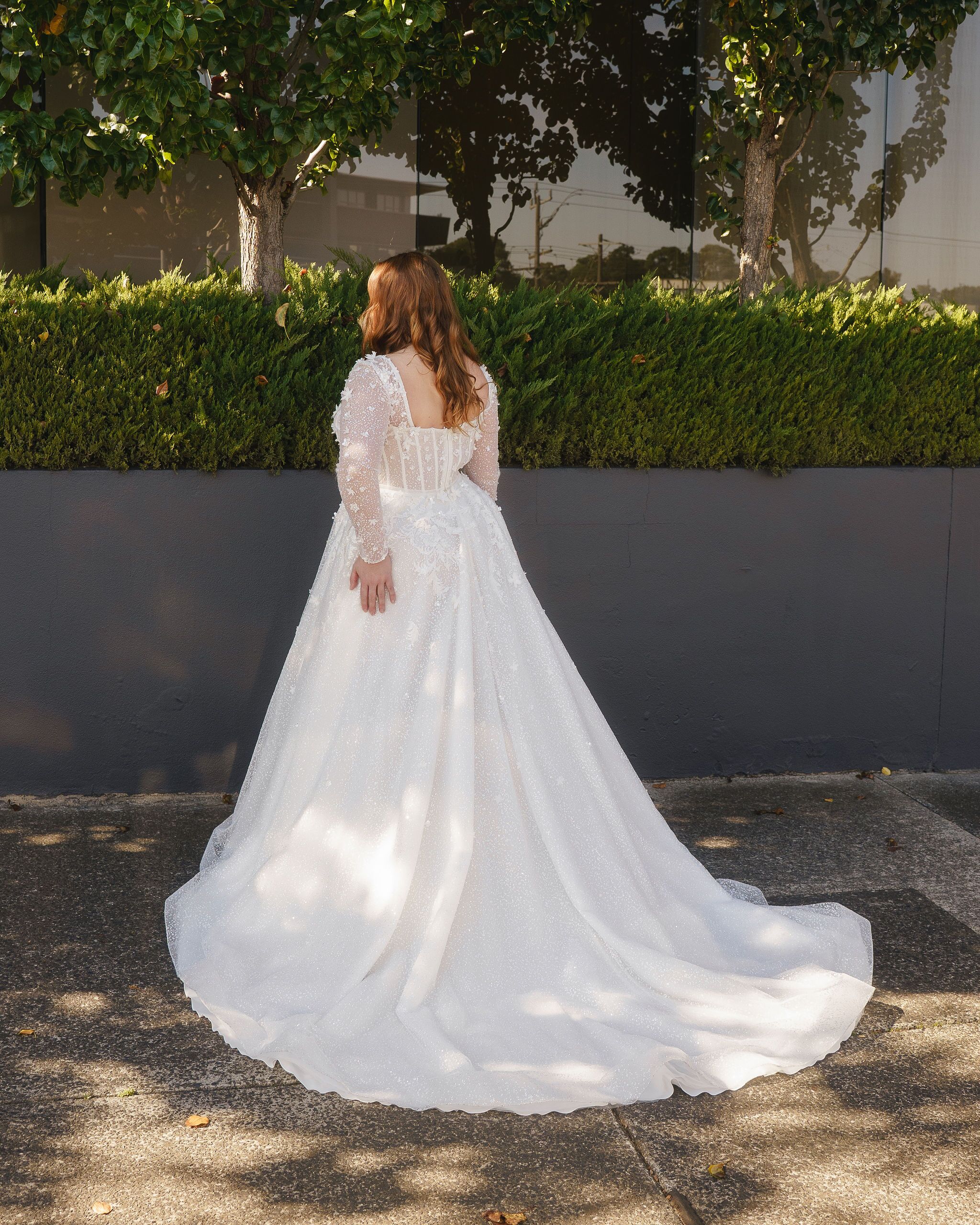 Adorned with 3D floral motifs, the gown shimmers with every movement thanks to its glitter-infused fabric and layered tulle skirt that flows with soft volume. For added versatility and elegance, detachable long sleeves allow you to customize your look—from ceremony sophistication to reception-ready glamour.