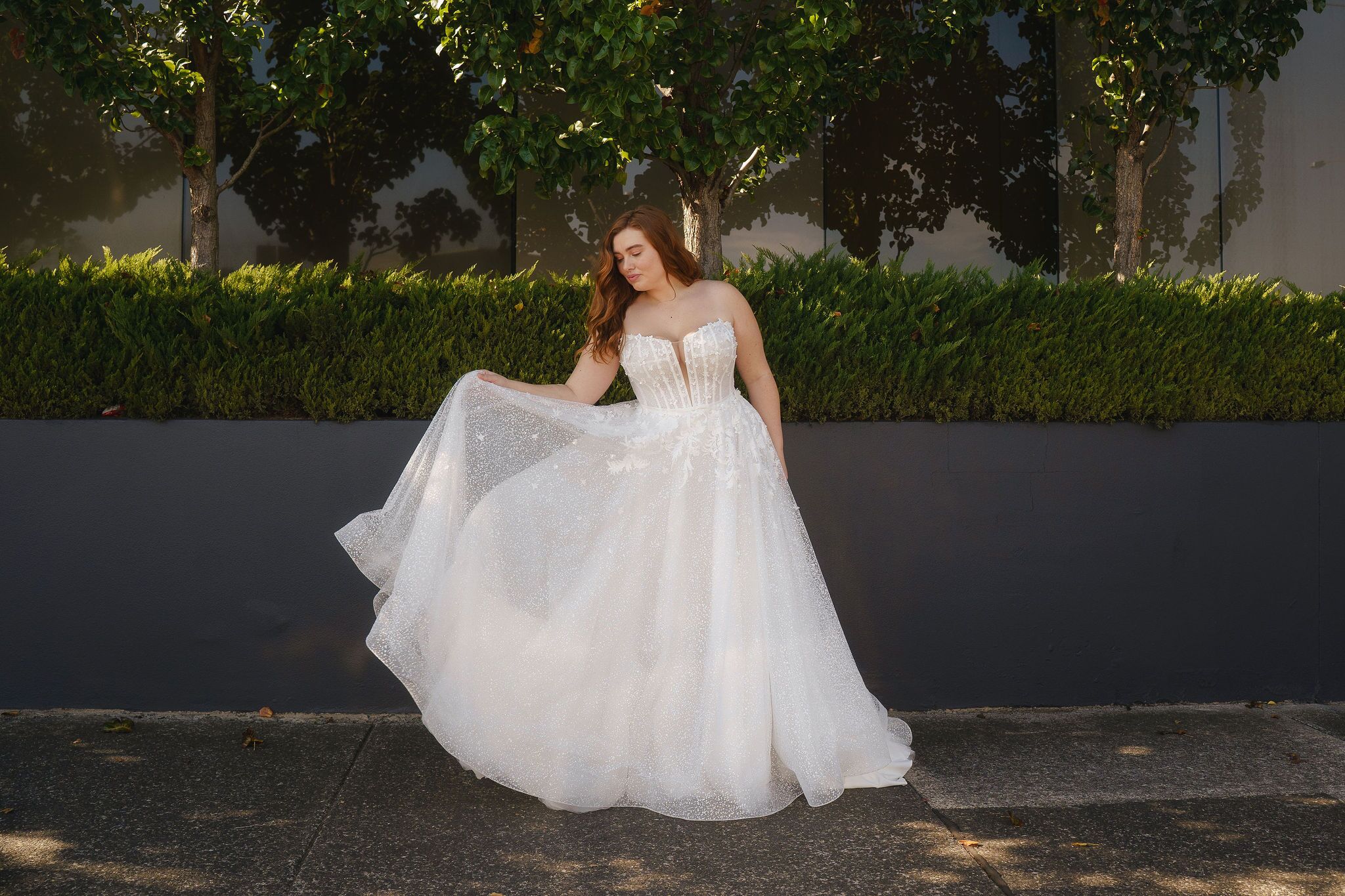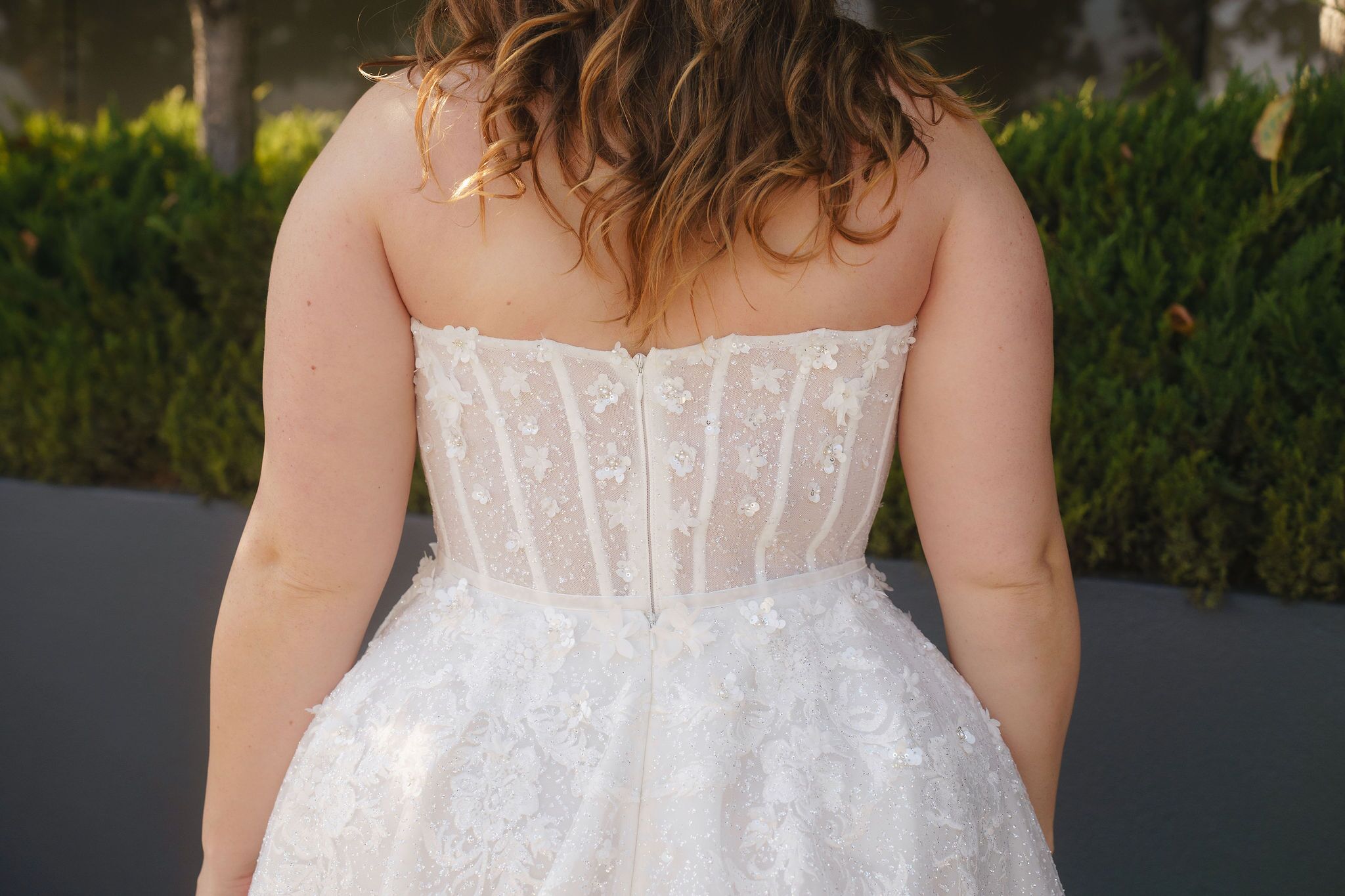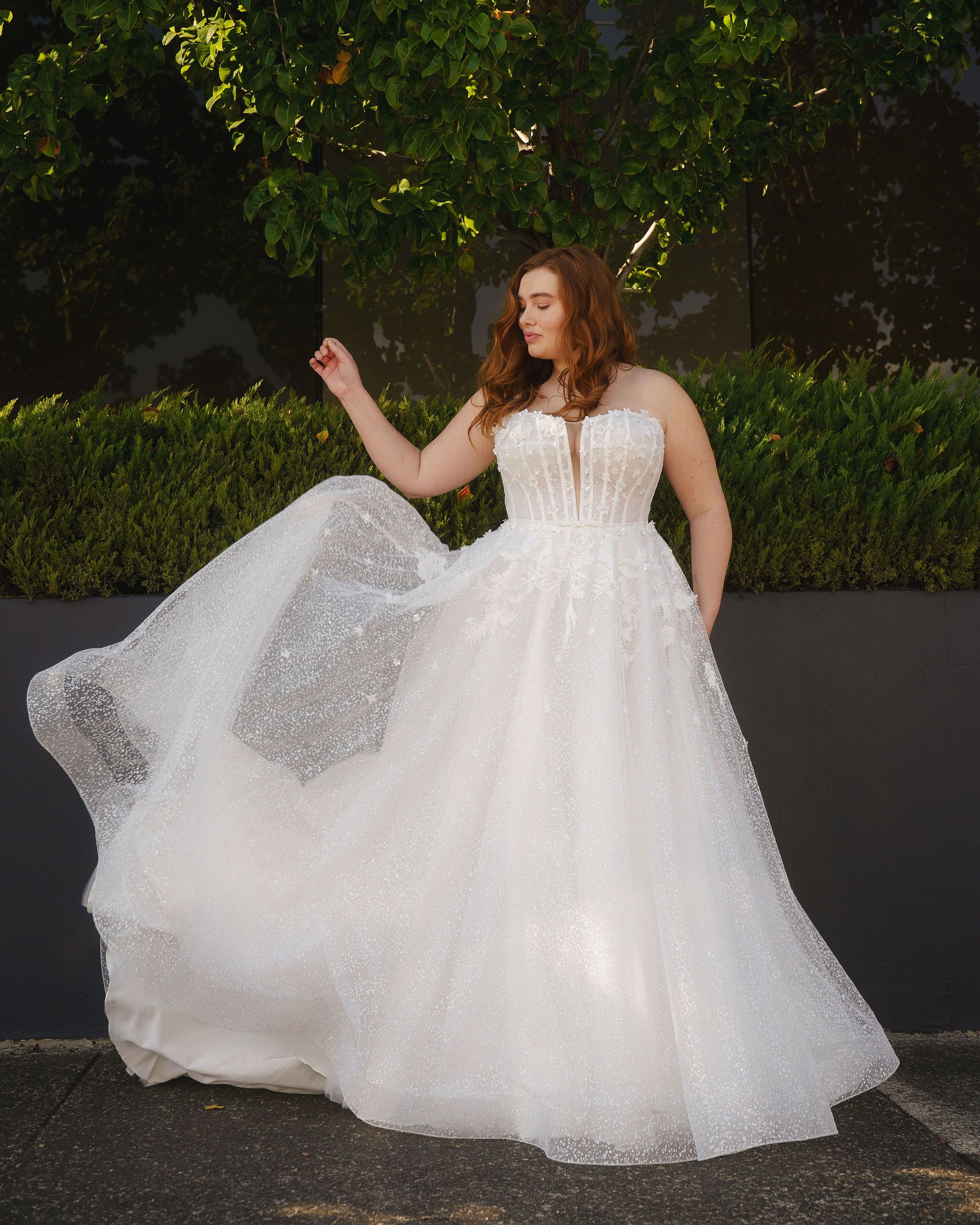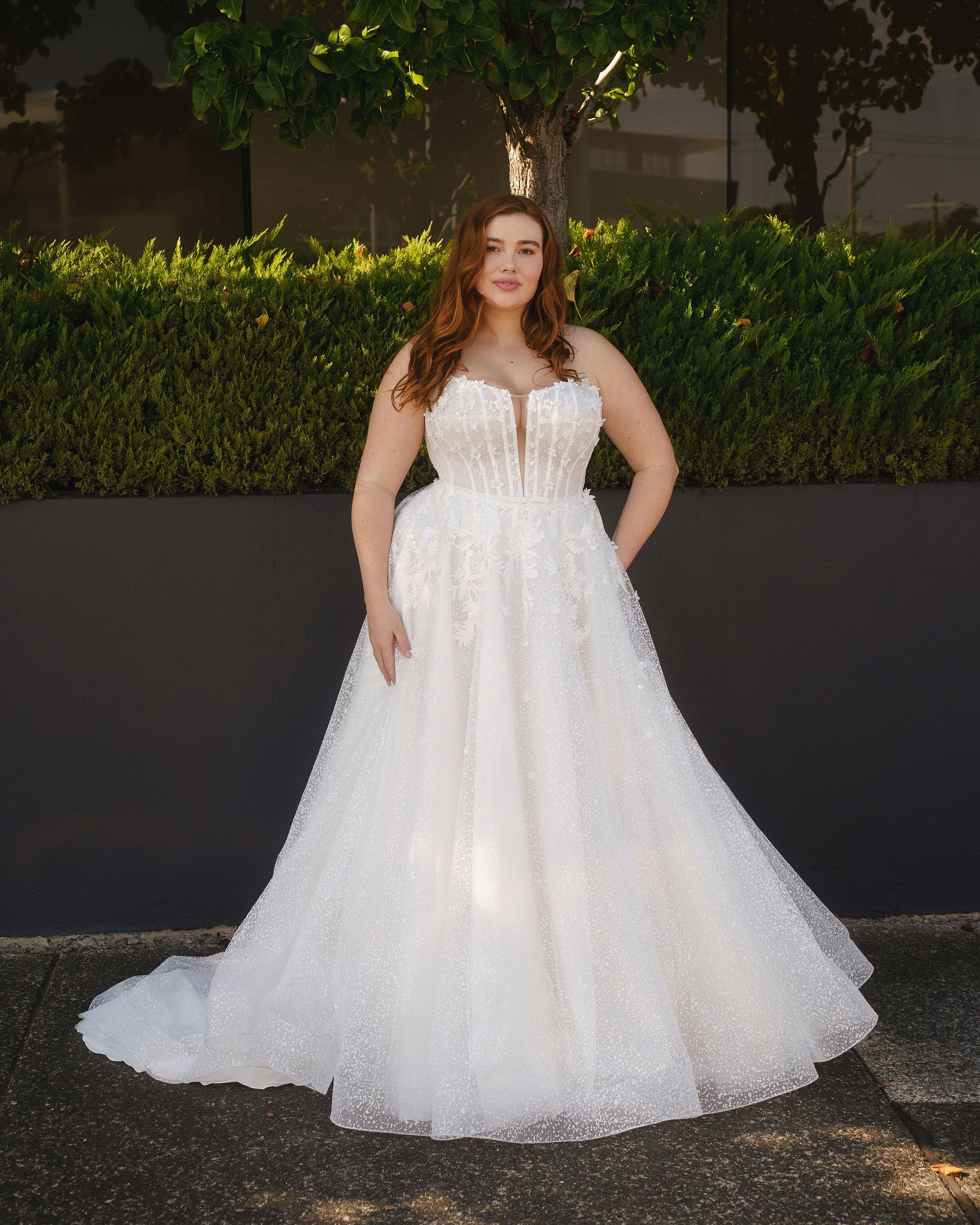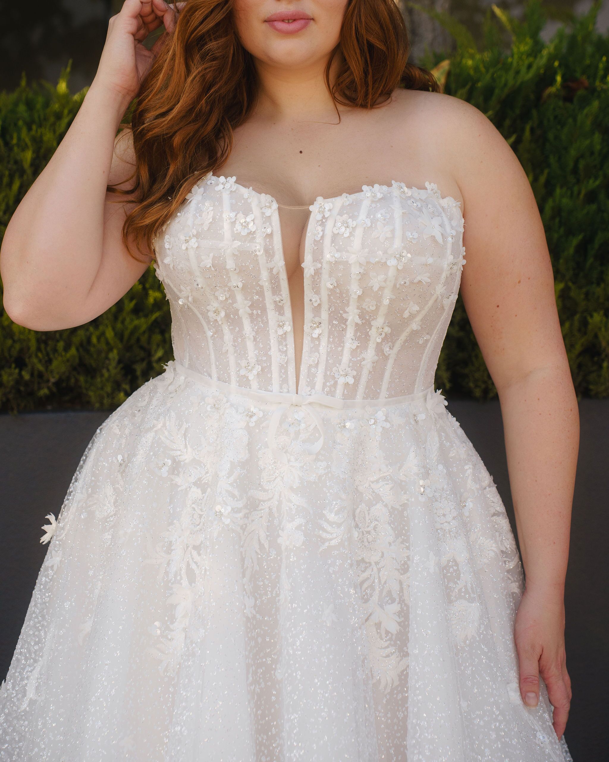 Radiate confidence and fairytale beauty in the LIANA plus-size wedding gown, crafted for the bride who loves drama, sparkle, and high-fashion detail. The fully sheer bodice features visible corset-style boning, offering sculpting support while keeping the look sexy and modern.