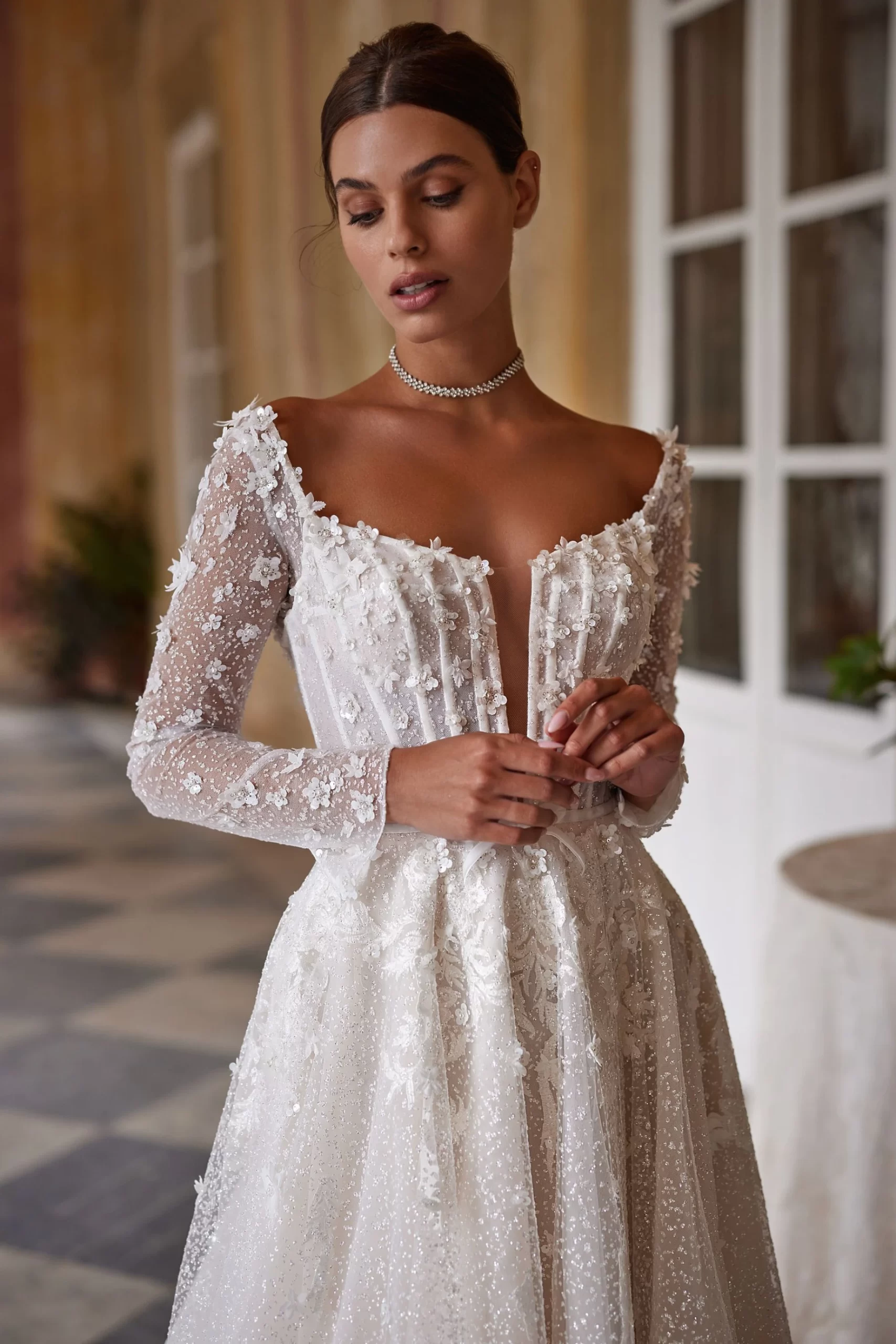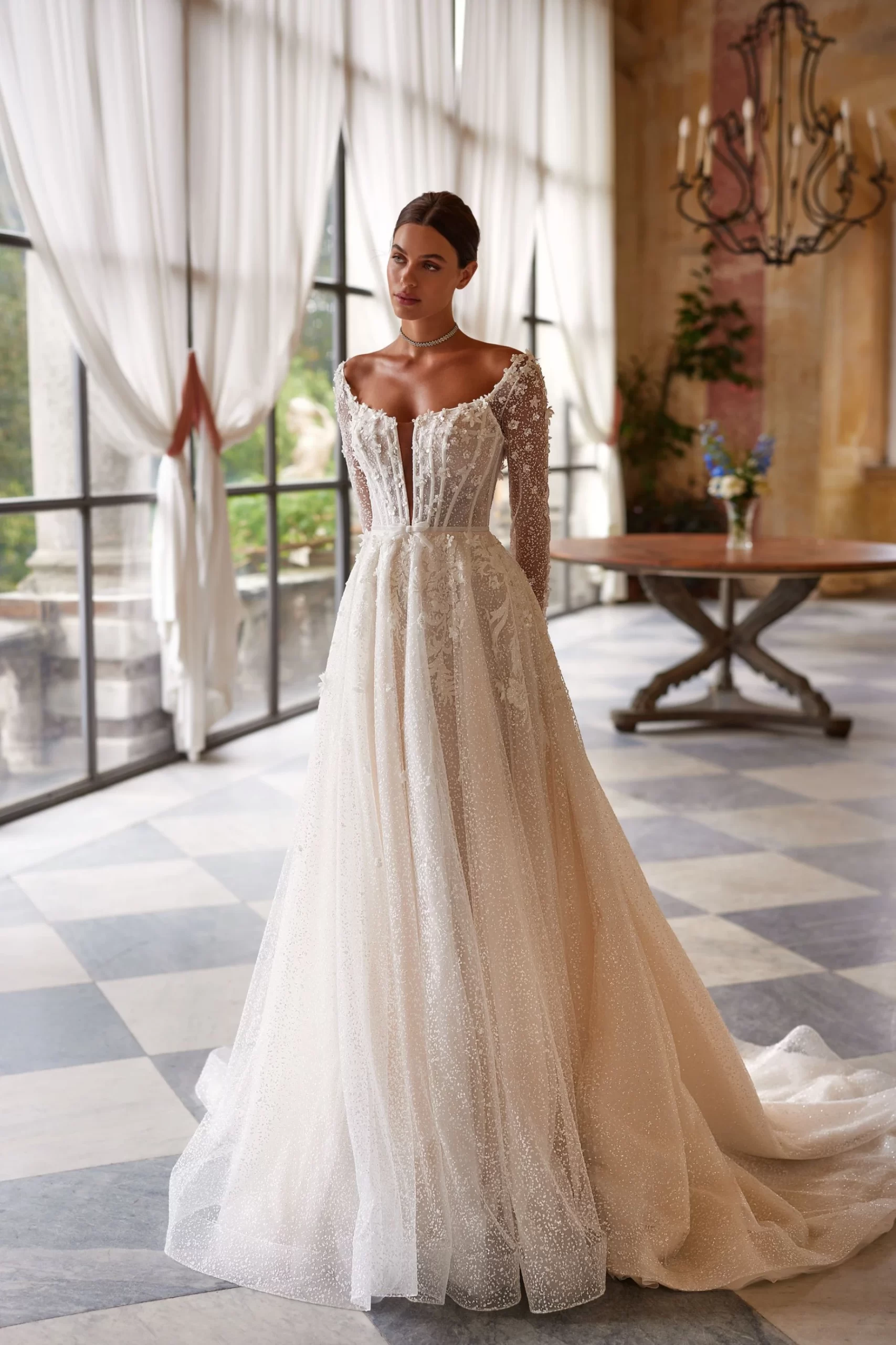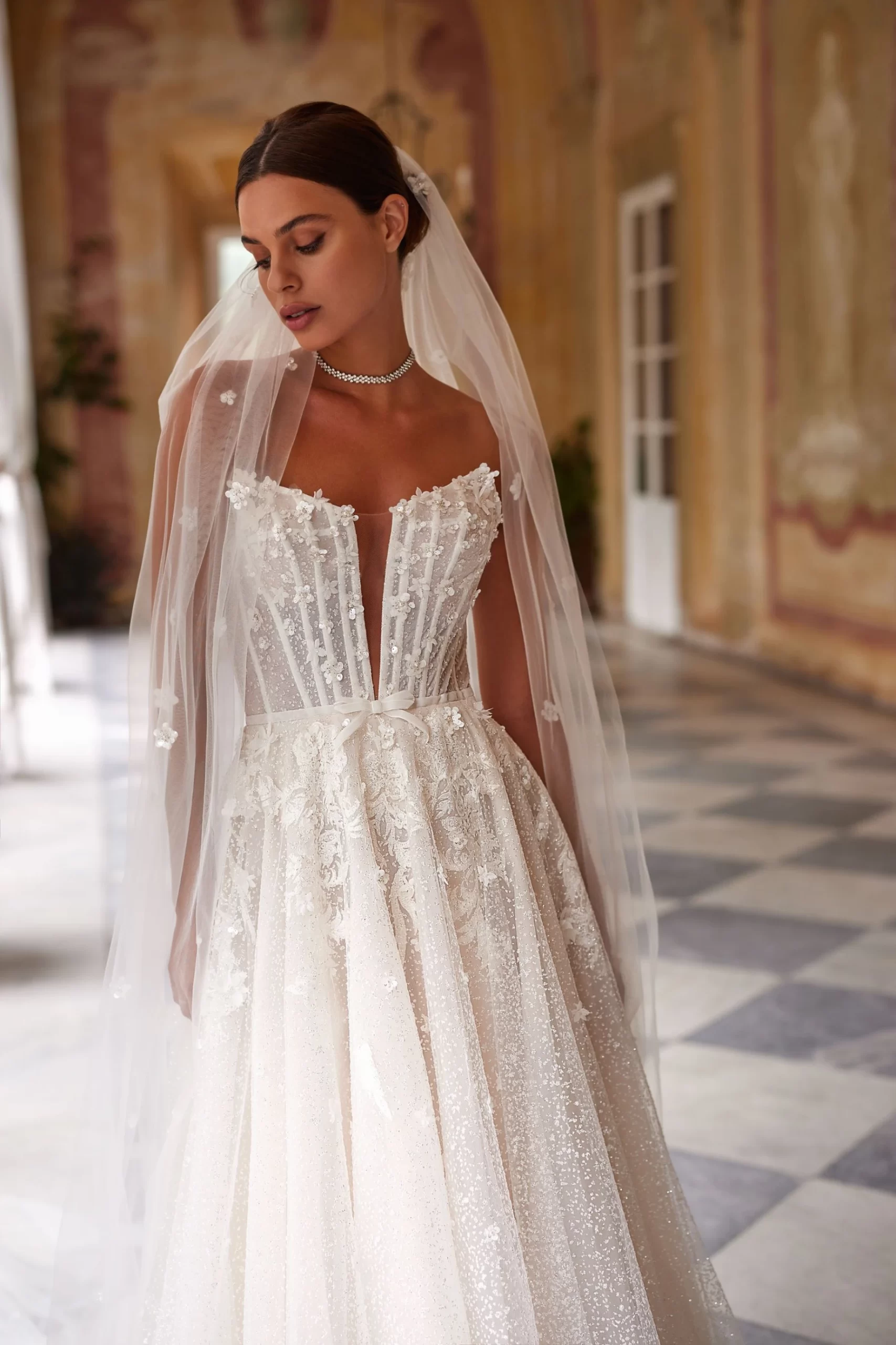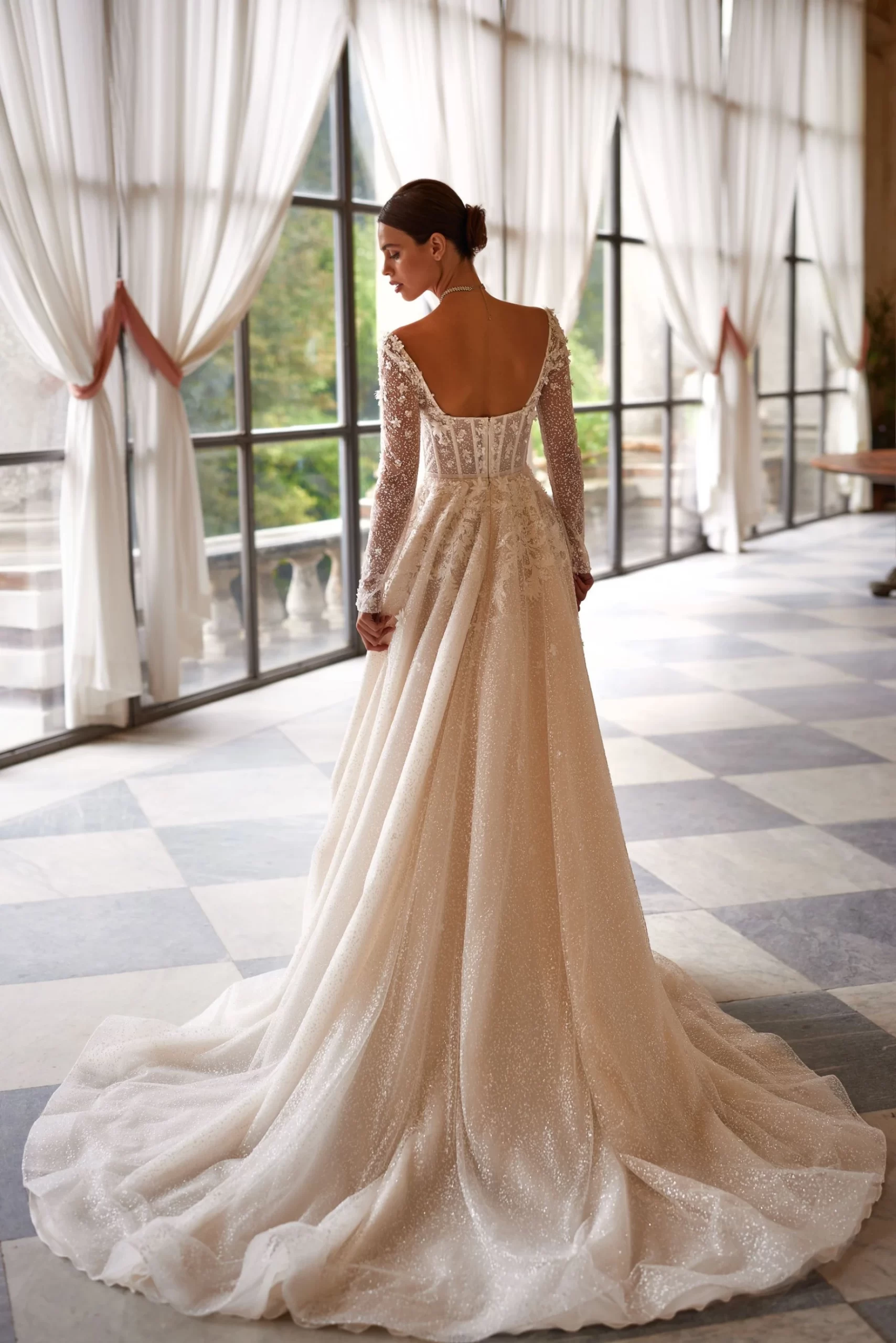 The seductive tenderness, versatility, and sophistication of the manners of a charming bride will be easy to see in an A-line dress in light skin or ivory colour, which is made of fabric with glitter. The grace of posture will be emphasized by the corset with a deep neckline and a concave shape of the back below the shoulder blade line. The top is finished with an emphasis on constructive lines, which are covered with a fabric with glitter and flowers with a 3D effect. The fastener in the center of the back is a hidden zipper. The smoothness of movements, lightness of gait, and invisible flight in the wedding dance, all can be achieved thanks to a lush skirt with a luxurious train, the top layer of which is also decorated with flowers with a 3D effect. And the second layer was made with appliqués by the craftsmen. The fastener of the skirt is a hidden zipper. The touching image of the bride is completed by removable long sleeves and a velvet belt with a small bow.