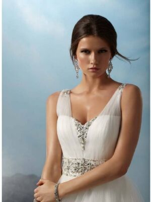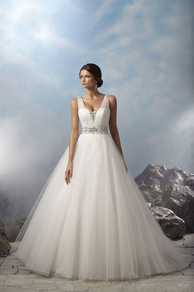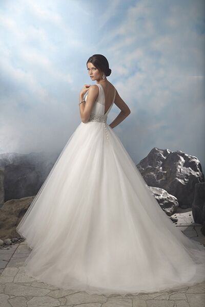 Beautiful ballgown wedding dress with frosted beading on tulle with a low, open back.