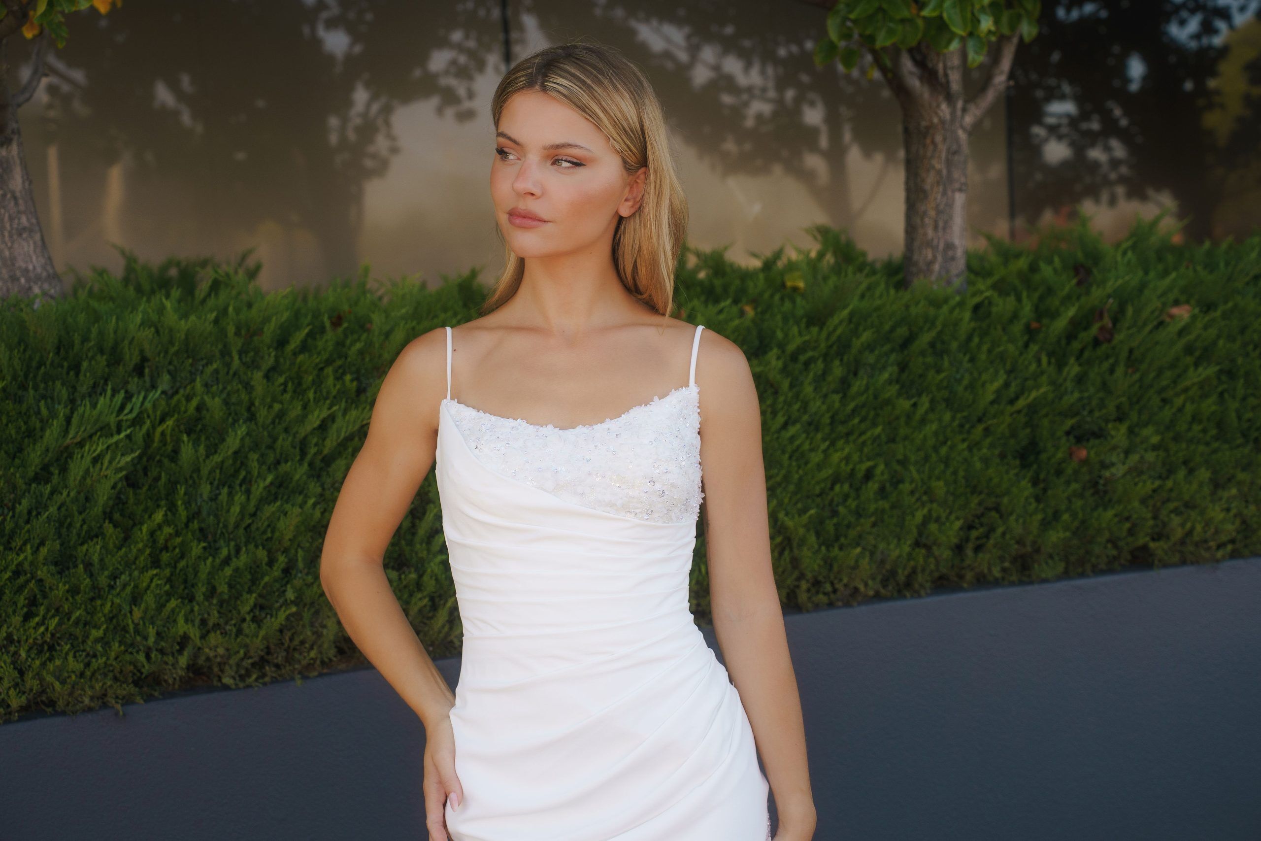 Sexy, alluring, and effortlessly elegant, our NIKKI crepe column wedding gown is designed for the modern bride who values clean lines and sophisticated detail. The sleek, fitted silhouette elongates the frame, while delicate pleating at the waist enhances your natural shape, offering both structure and femininity.