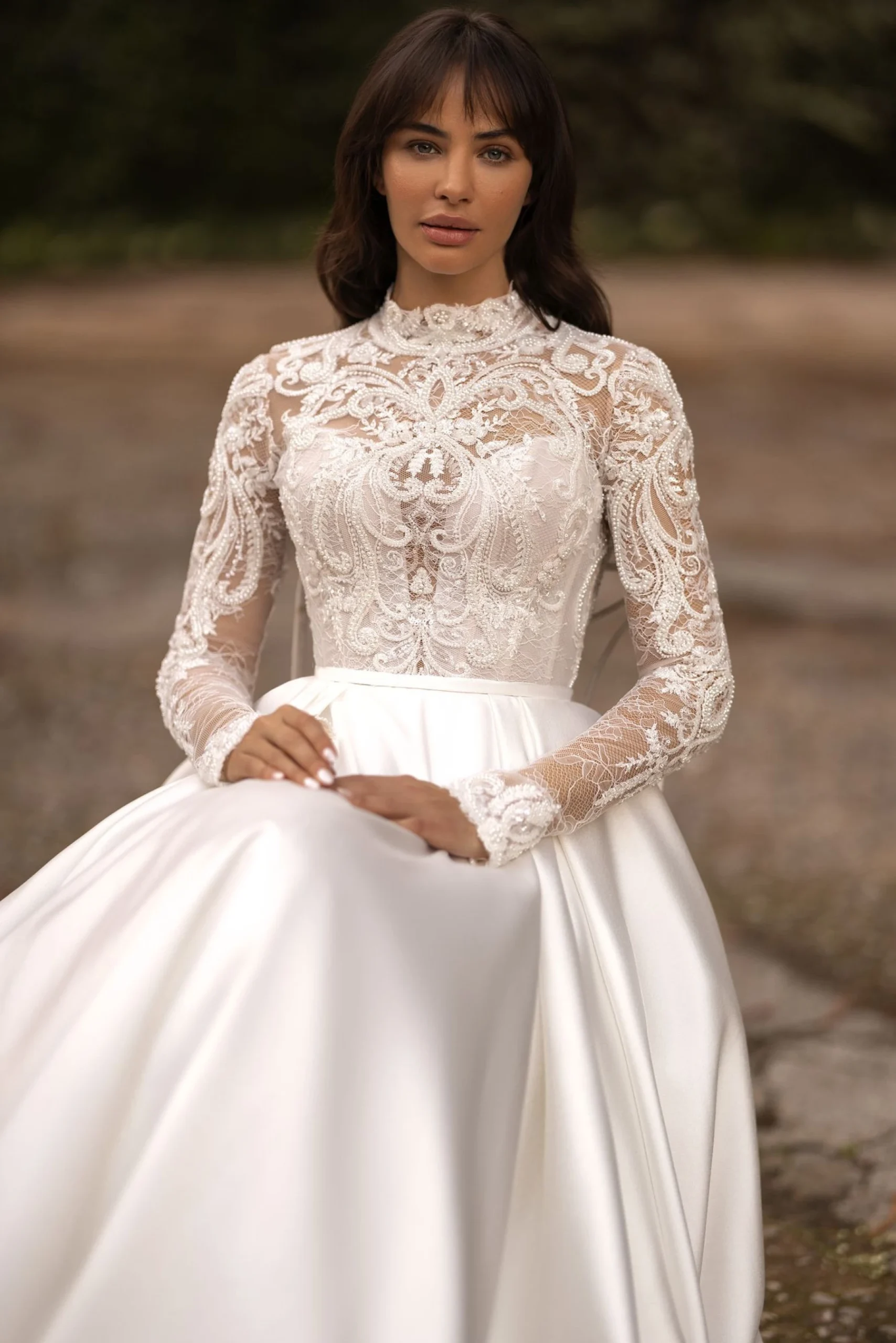 This wedding dress is a timeless vision of classic elegance and refined sophistication. It features a high lace neckline and long sheer lace sleeves, beautifully detailed with intricate embroidery that exudes regal charm. The fitted lace bodice flows seamlessly into a luxurious satin ball gown skirt,