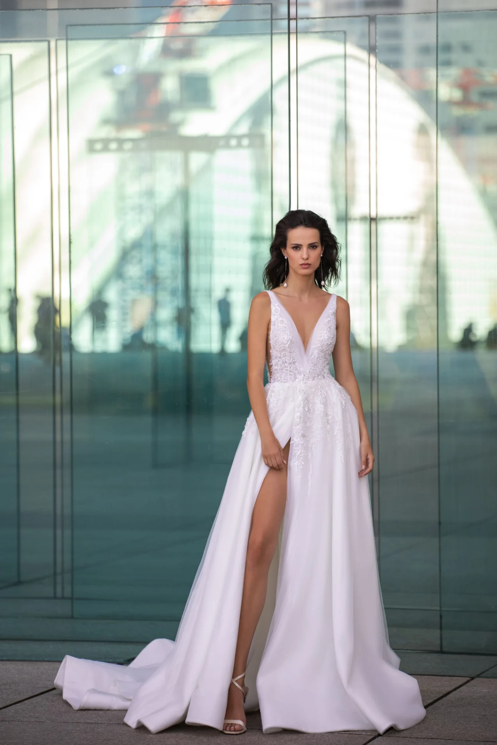 The lace is complemented with pearls, crystals,s and beads. Such an elegant, modern design is sure to collect a lot of enthusiastic compliments from guests.