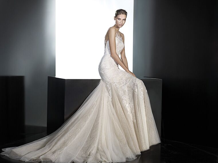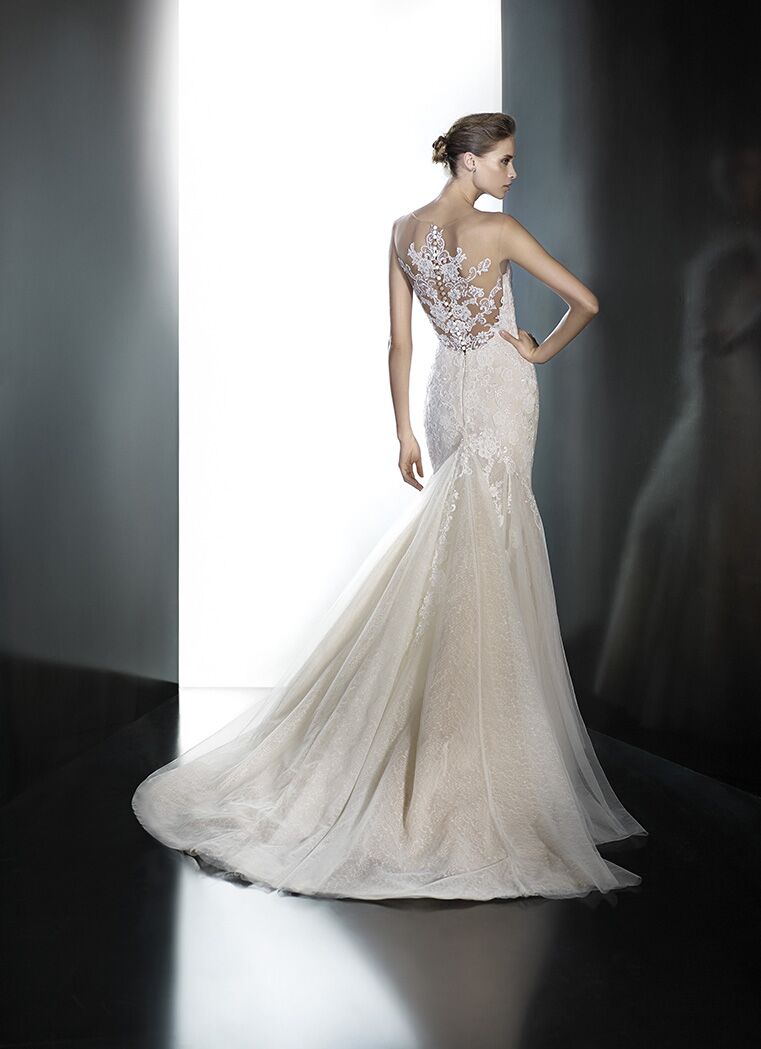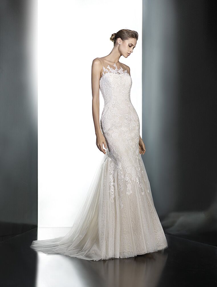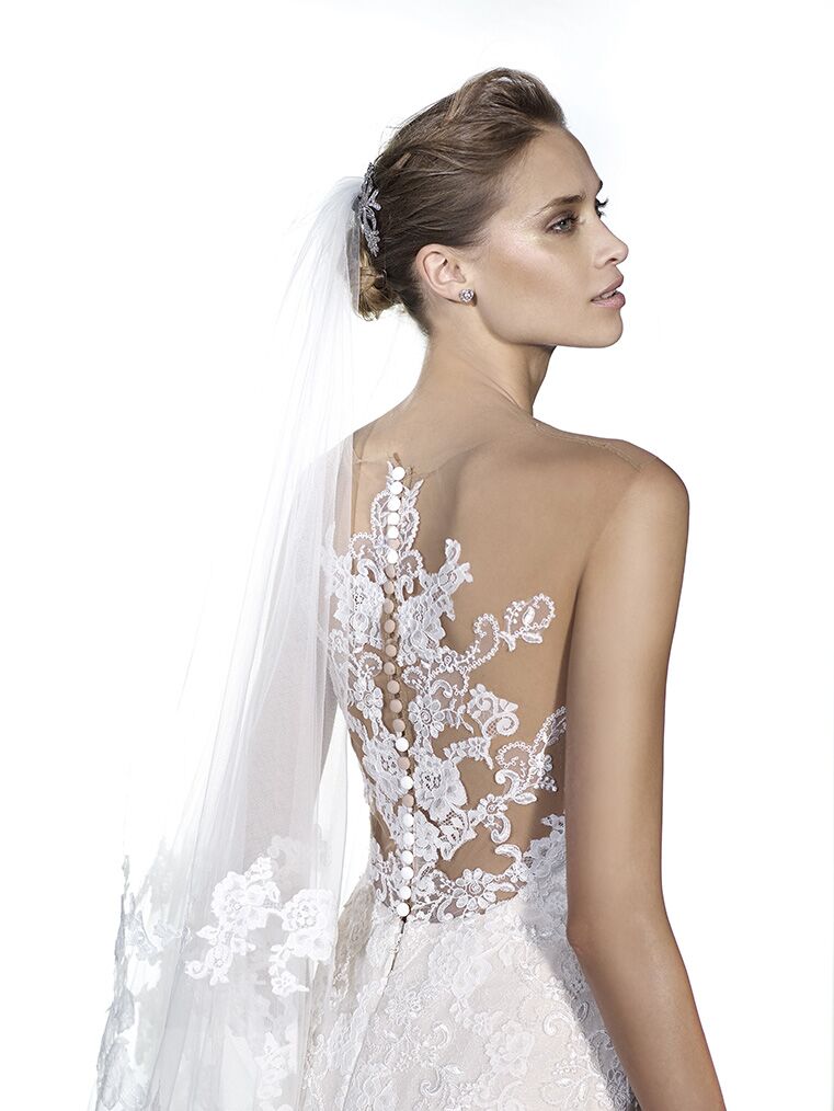 Wedding dress with beige tulle, flared with lace and thread embroidery appliqués. Bodice with sheer under bodice at the front and back decorated with lace appliqués in the center.
