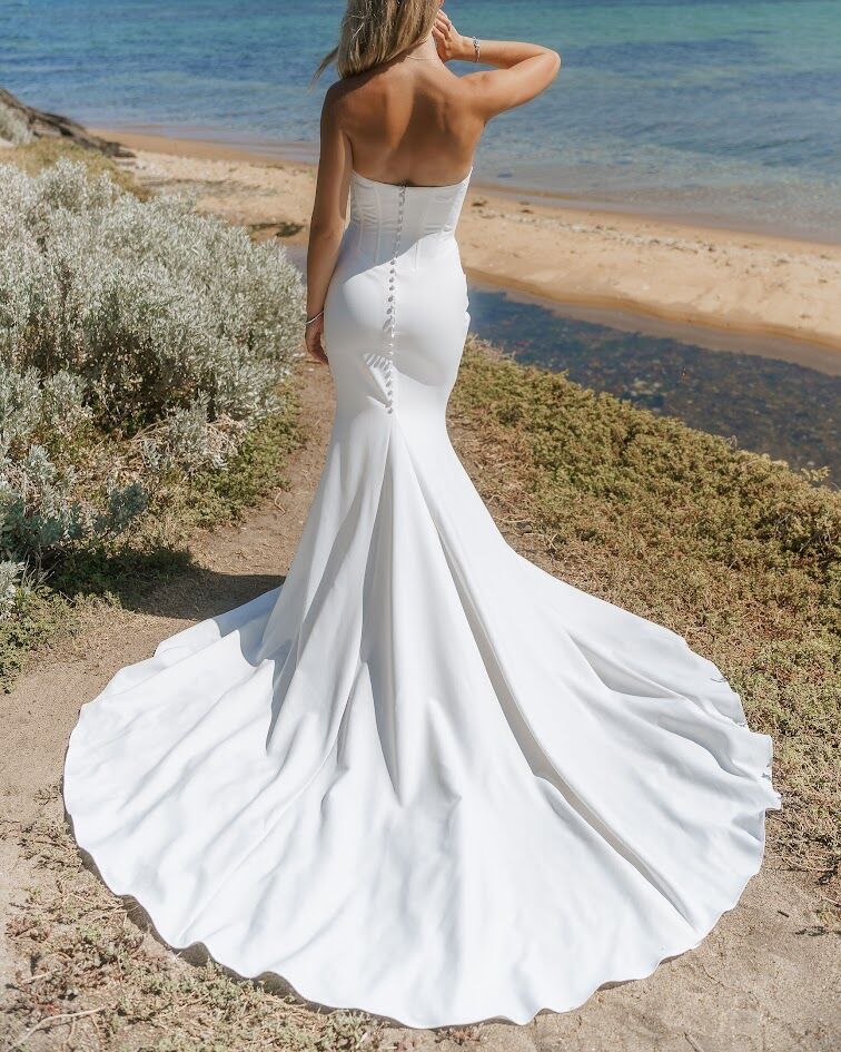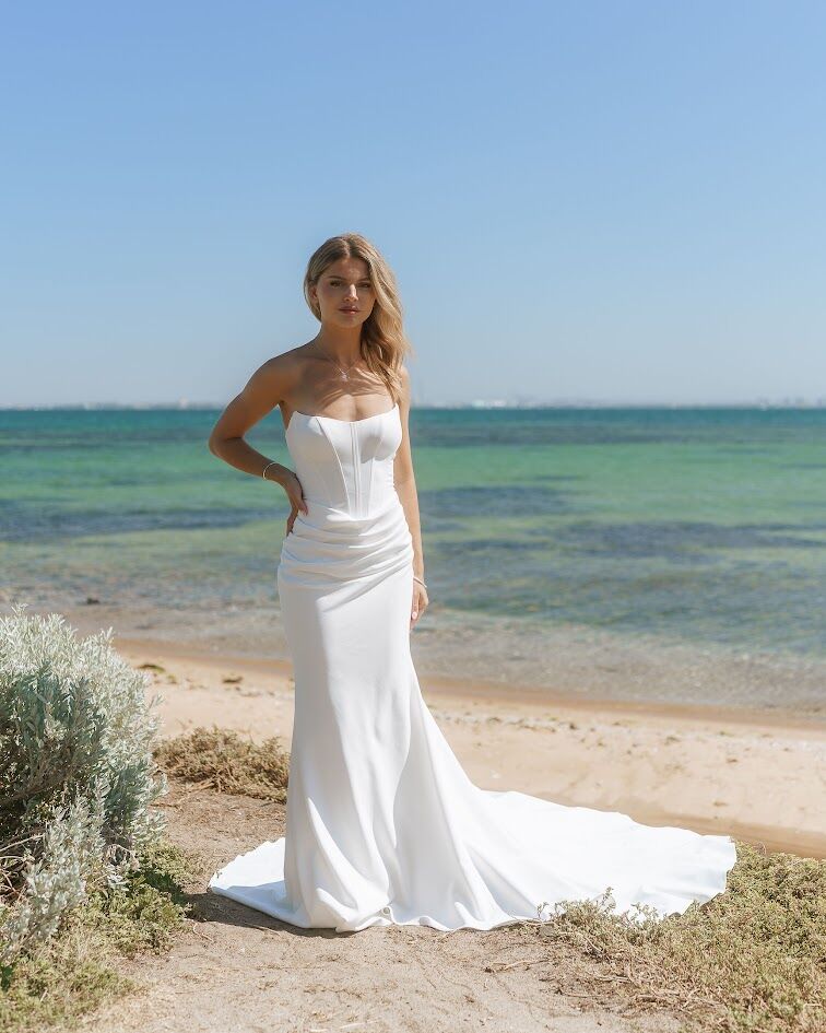 this stunning strapless corset wedding dress. Designed to sculpt and enhance your silhouette, the structured bodice offers a perfect balance of support and allure. Featuring a unique ruched waist.