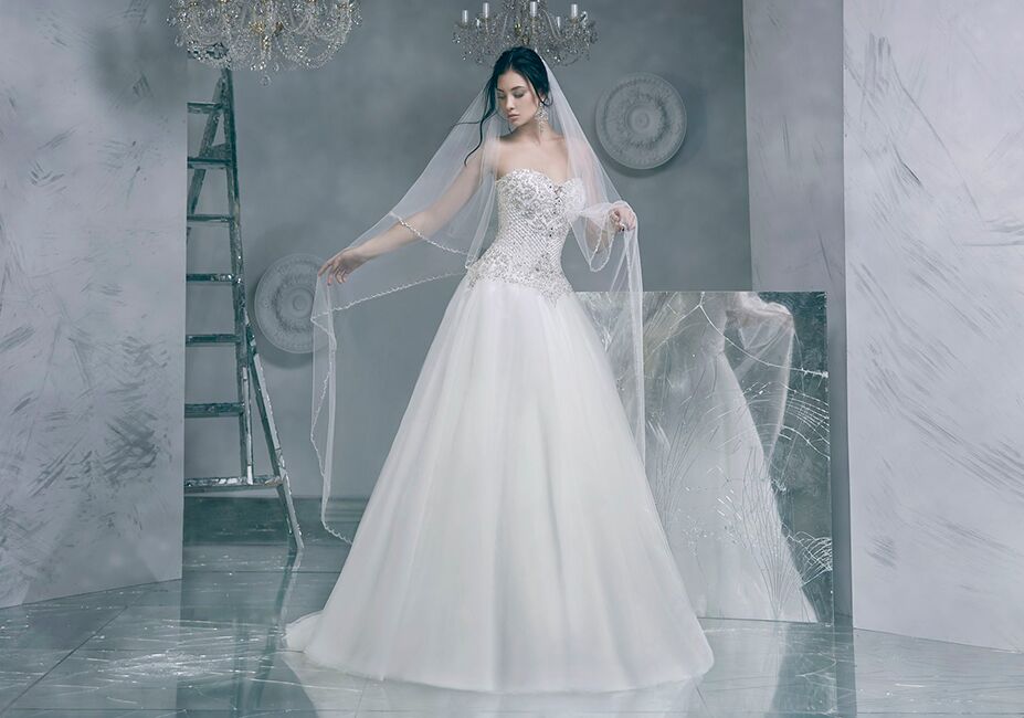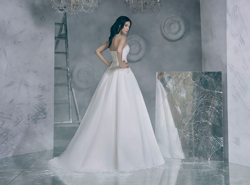 Classic princess silhouette dress with a modern twist with the unusual decoration of the corset. Sweetheart neckline is decorated with patterns of sequins, pearls and beads. The central part of the corset is decorated with diagonal straight rows of Swarovski crystals. The lower part of the embroidery falls outside of the corset and has a smooth wedge drop on a luxuriant skirt made of French tulle.
