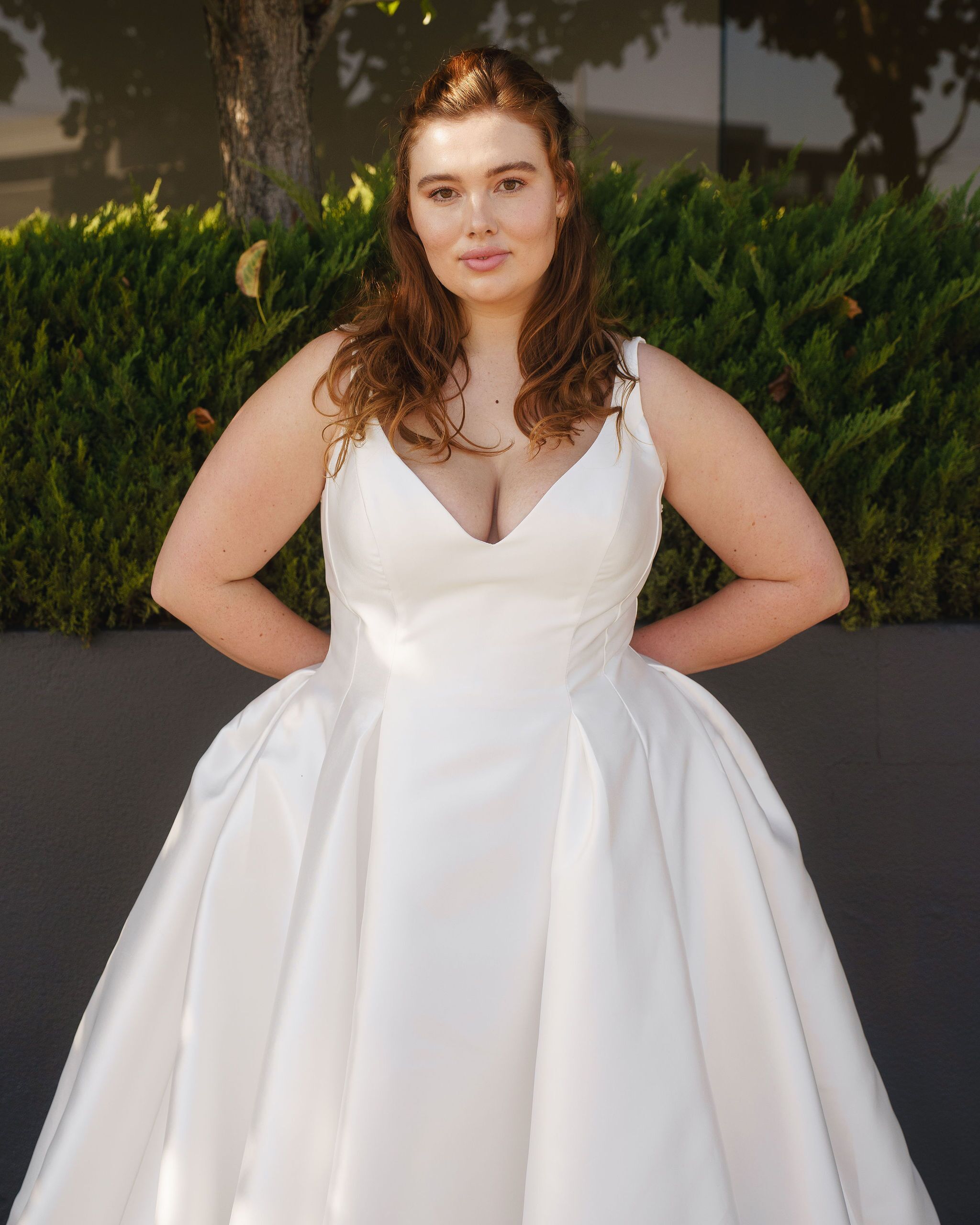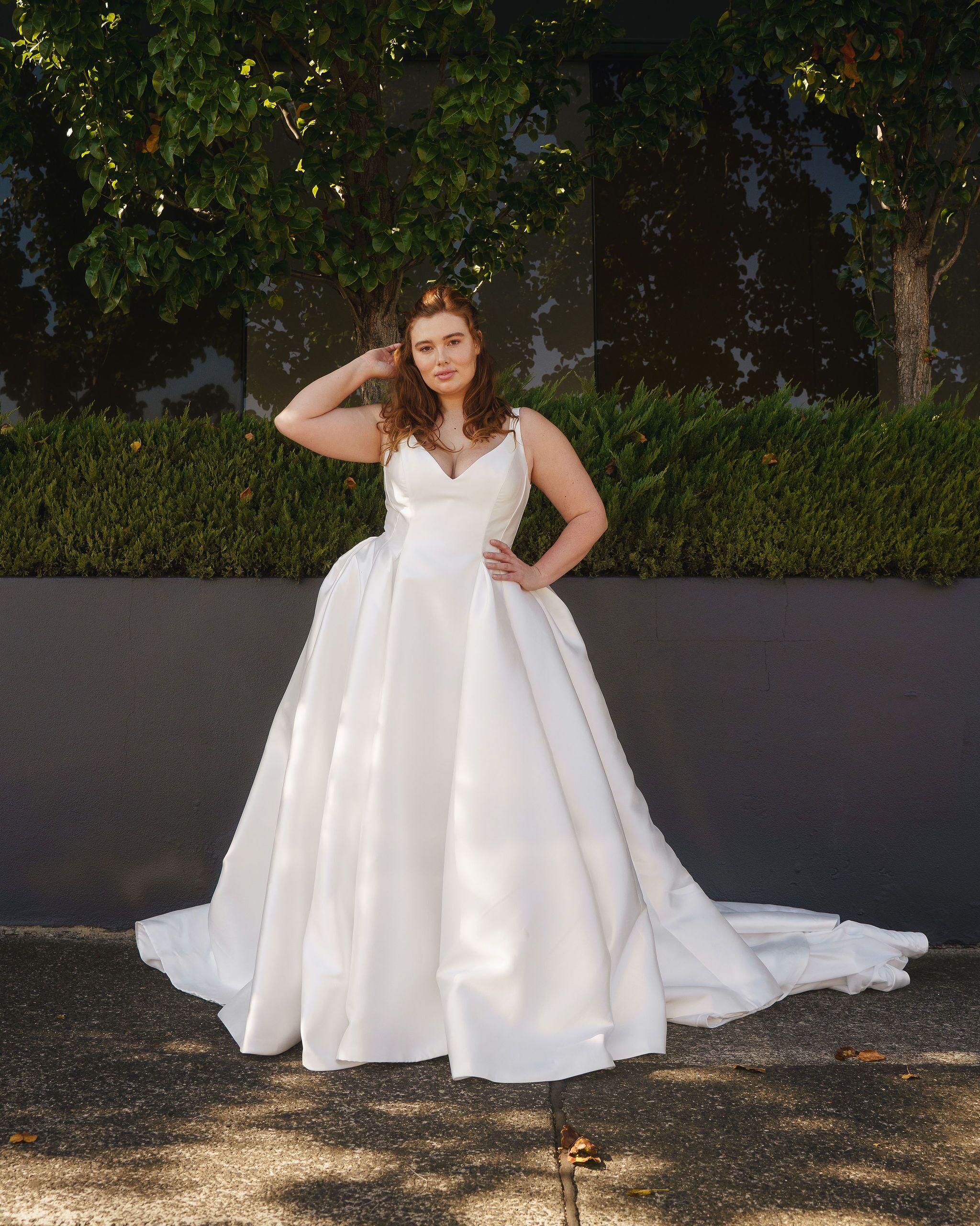 SIMONA is a Classic Plus Size Satin Ballgown Wedding Dress with Straps & Pleated Skirt – Timeless Elegance for the Modern Bride