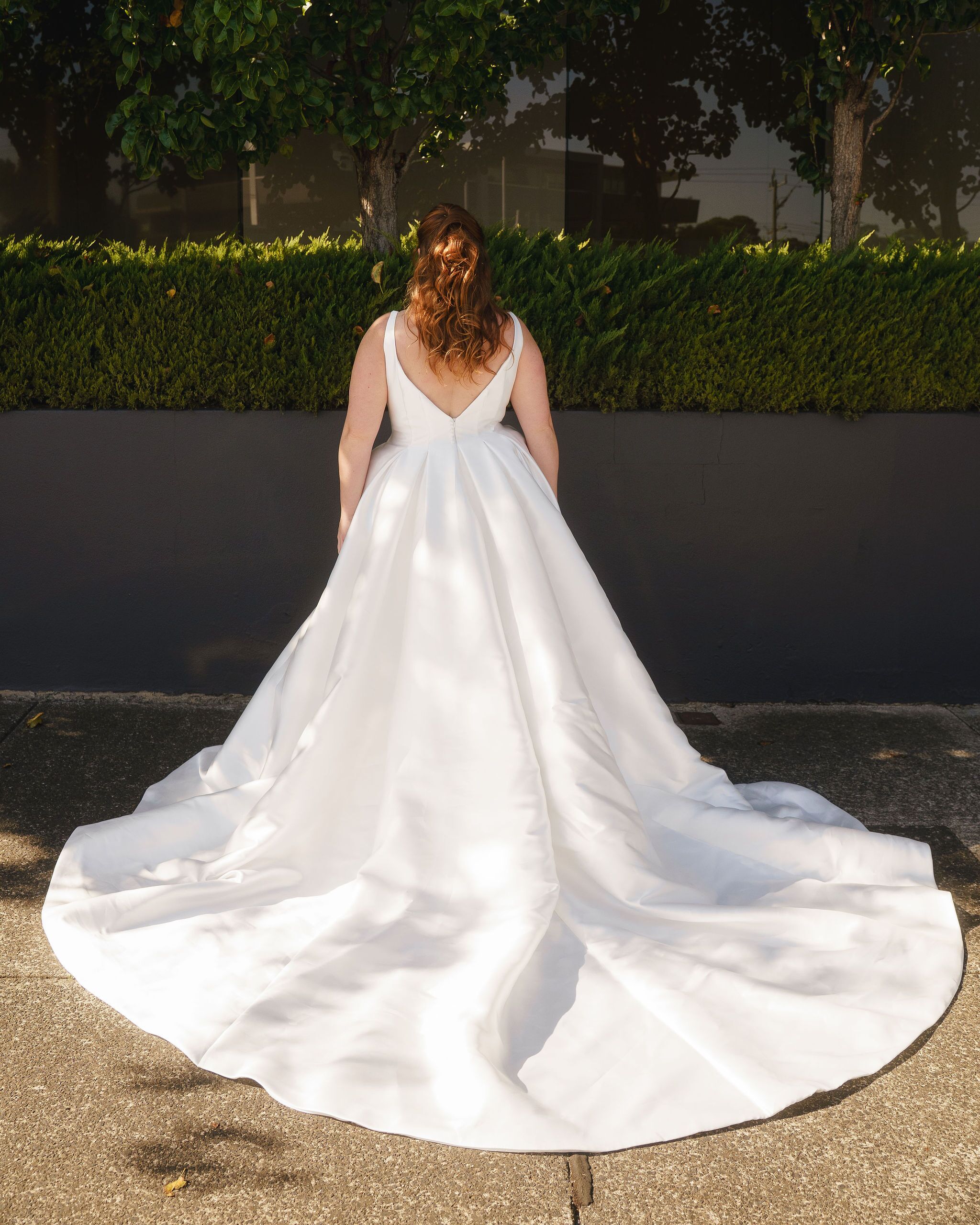 Graceful and grand, SIMINA is a plus-size satin wedding gown is a celebration of classic bridal style with a flattering, modern fit. Featuring elegant supportive straps and a smooth satin bodice, this gown offers both structure and simplicity, making it perfect for timeless wedding themes.