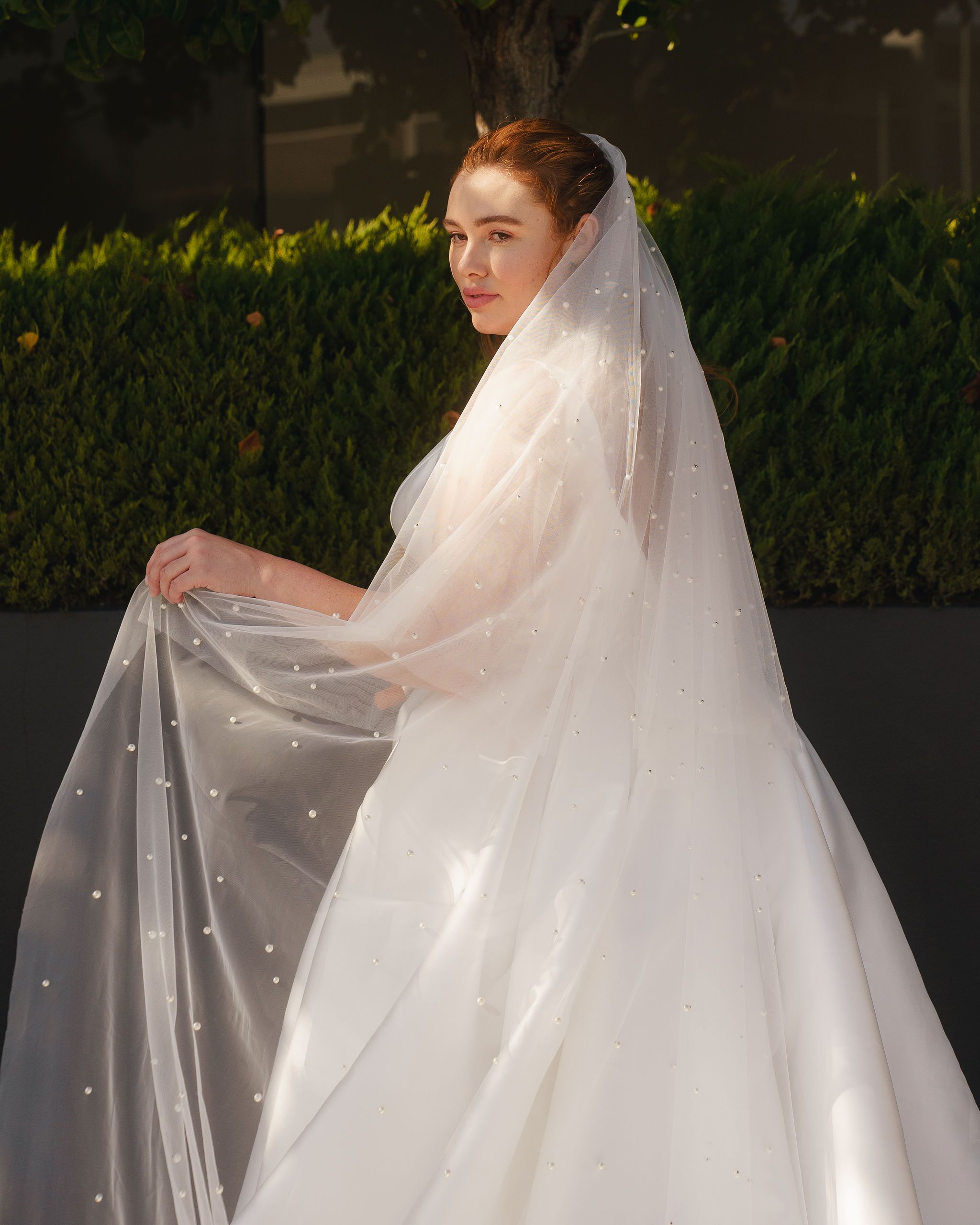 Graceful and grand, SIMINA is a plus-size satin wedding gown is a celebration of classic bridal style with a flattering, modern fit. Featuring elegant supportive straps and a smooth satin bodice, this gown offers both structure and simplicity, making it perfect for timeless wedding themes. The voluminous pleated ballgown skirt...