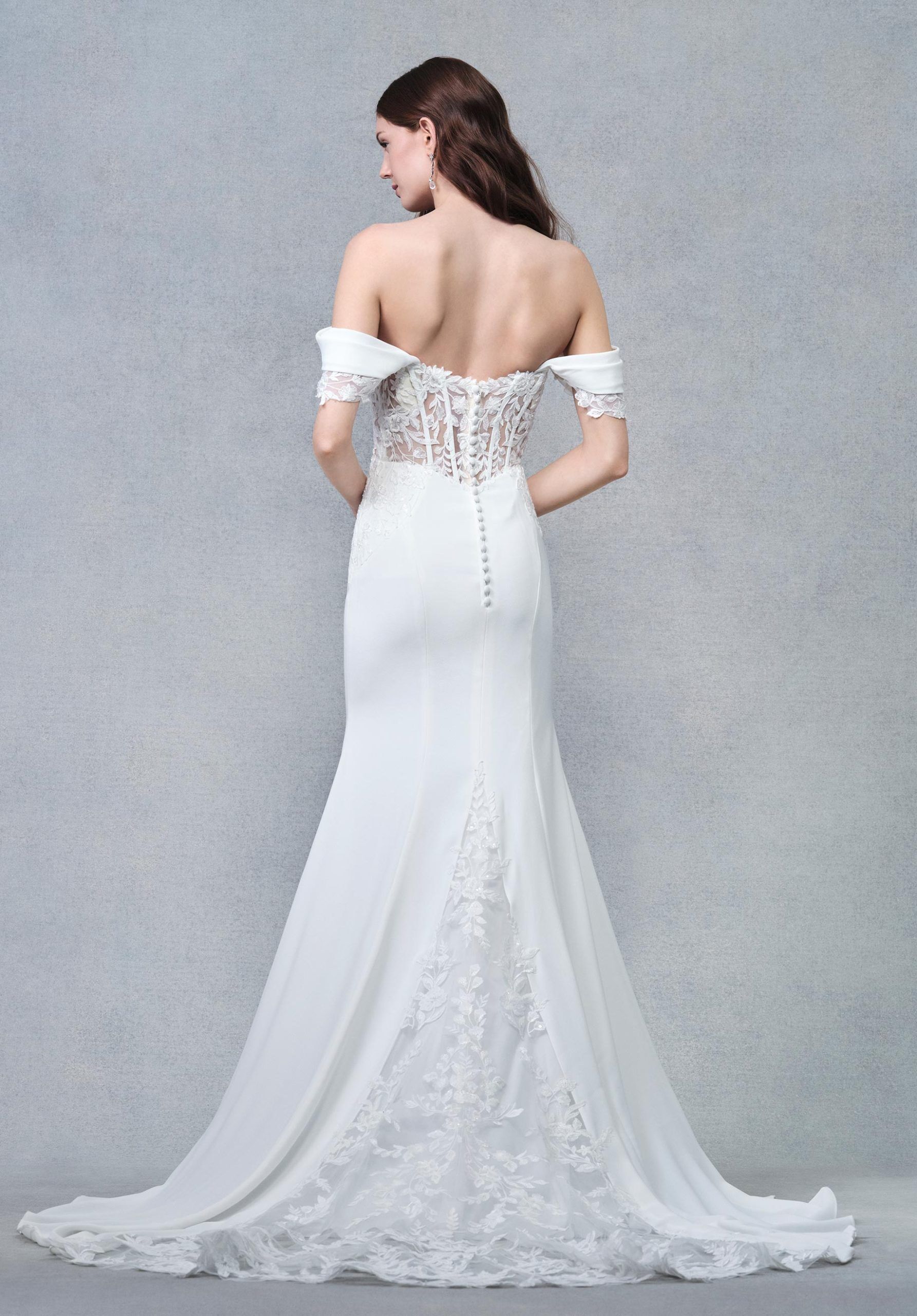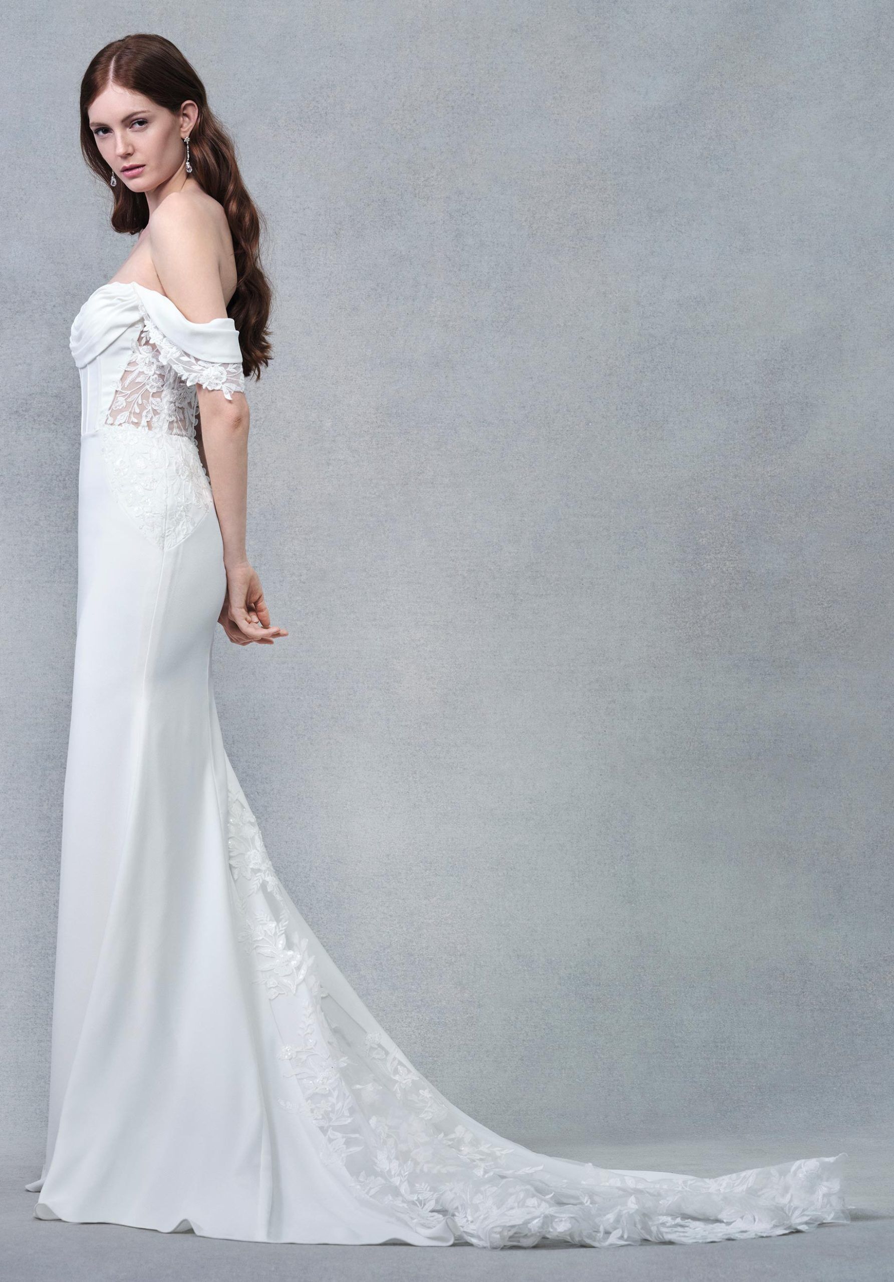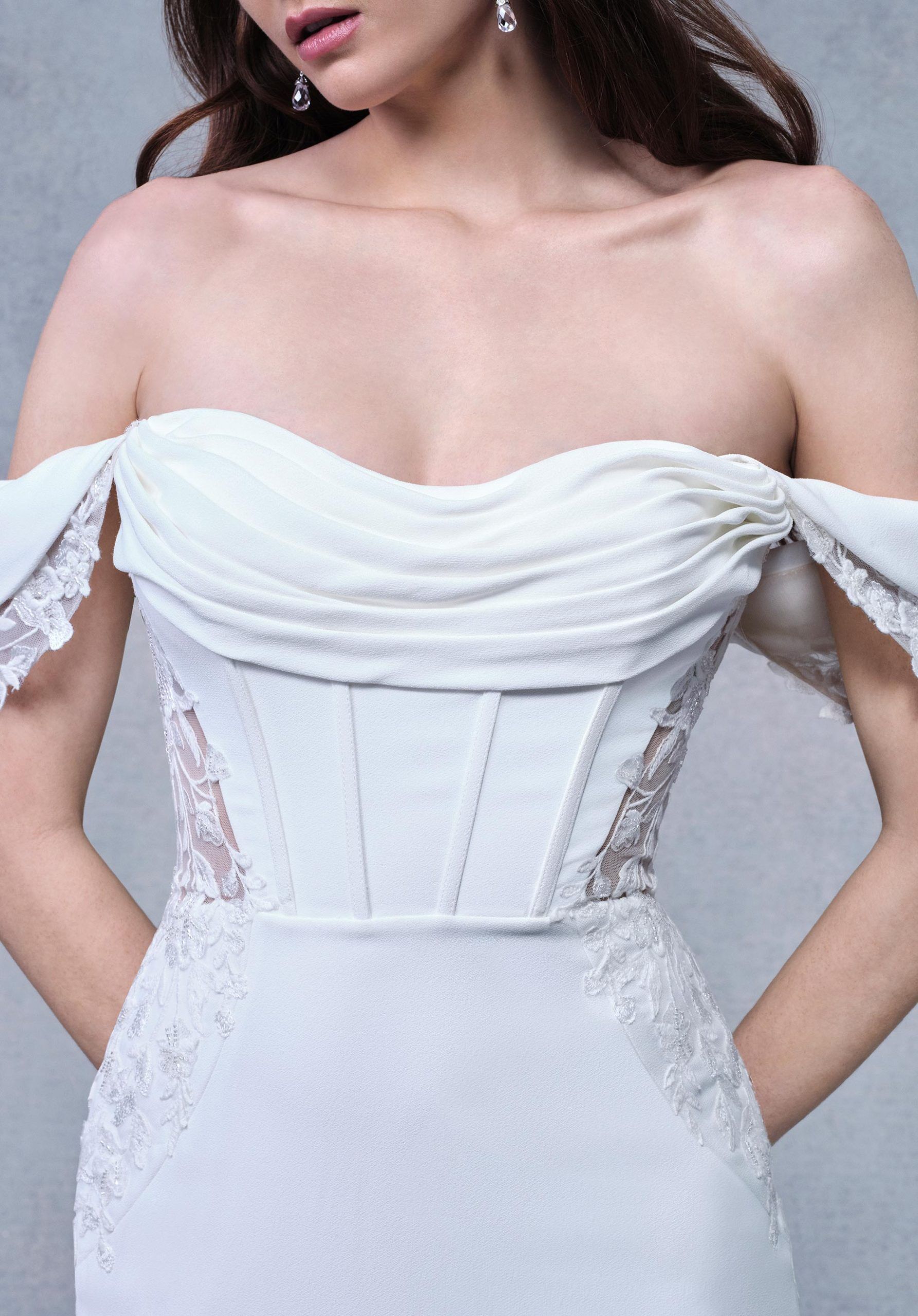 Our Tamara designer wedding dress is for the brides who want true glamour. The sultry style has a scoop neckline with a chic draped detail on a corset-boned bodice featuring sheer sides that gives the illusion of a narrow waist. Stunning crystal beaded lace appliqués contour the fit and flare silhouette, decorate the sheer back, and accent the detachable off-the-shoulder sleeves. For a romantic touch, we’ve designed the train with cut-away lace that looks gorgeous trailing behind you down the aisle.