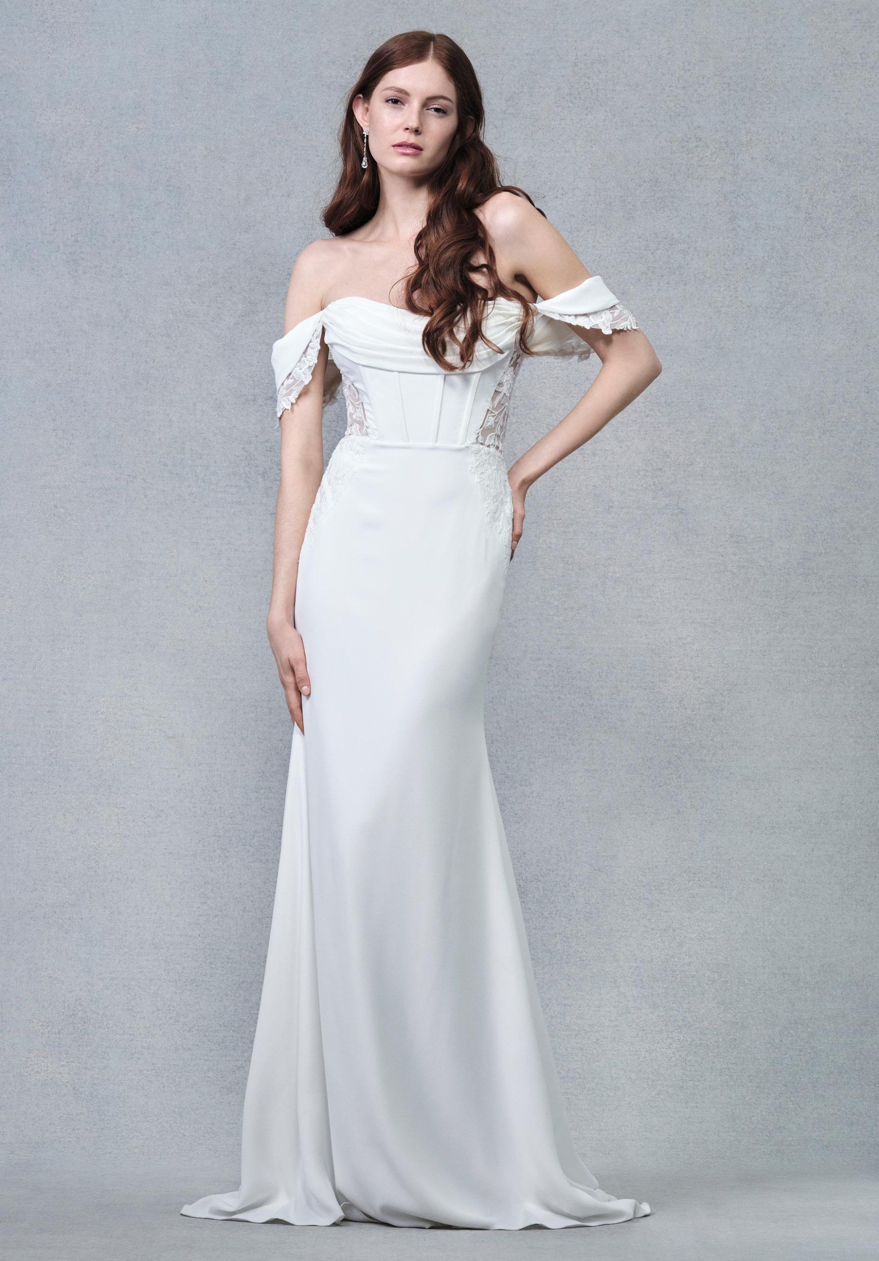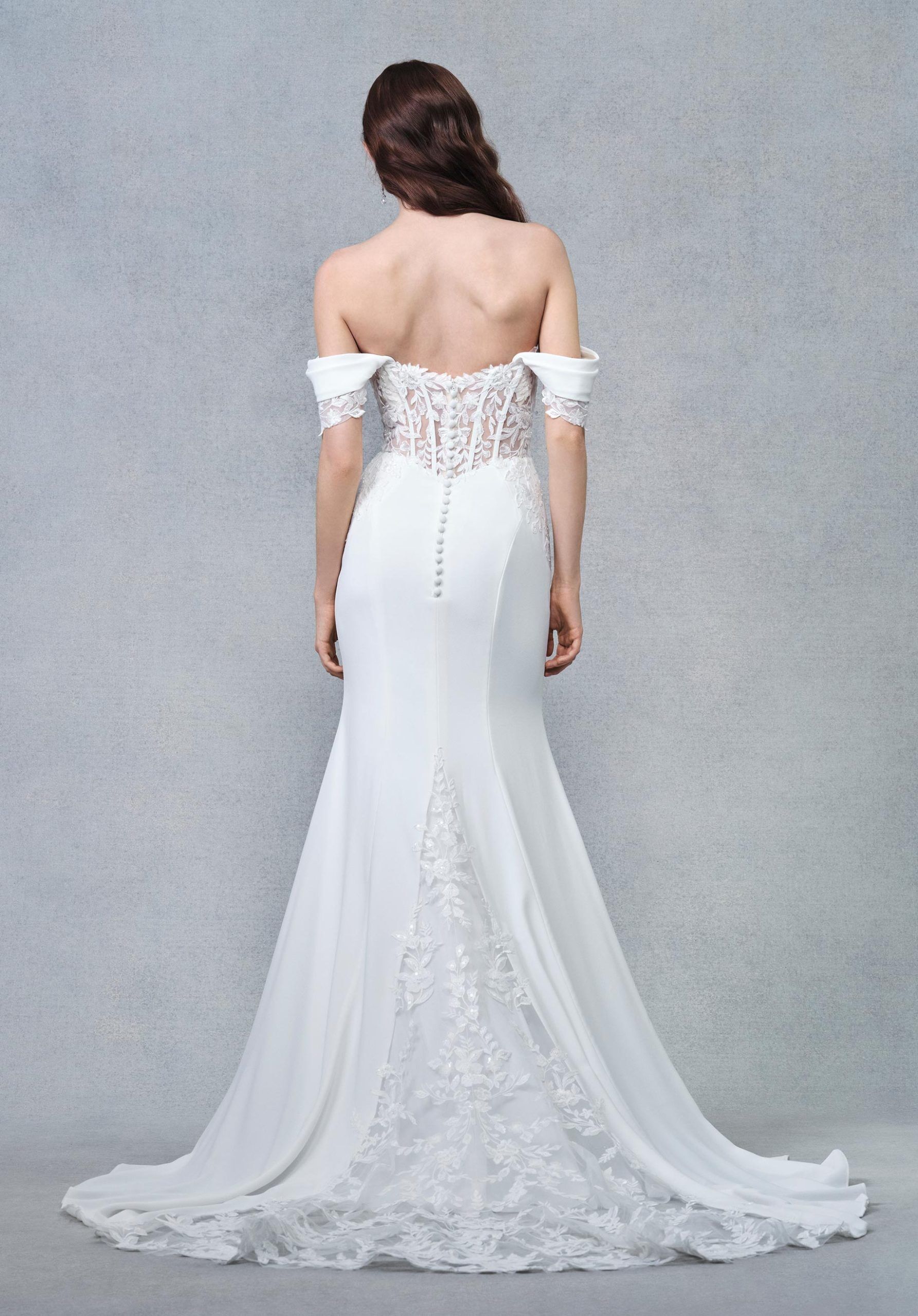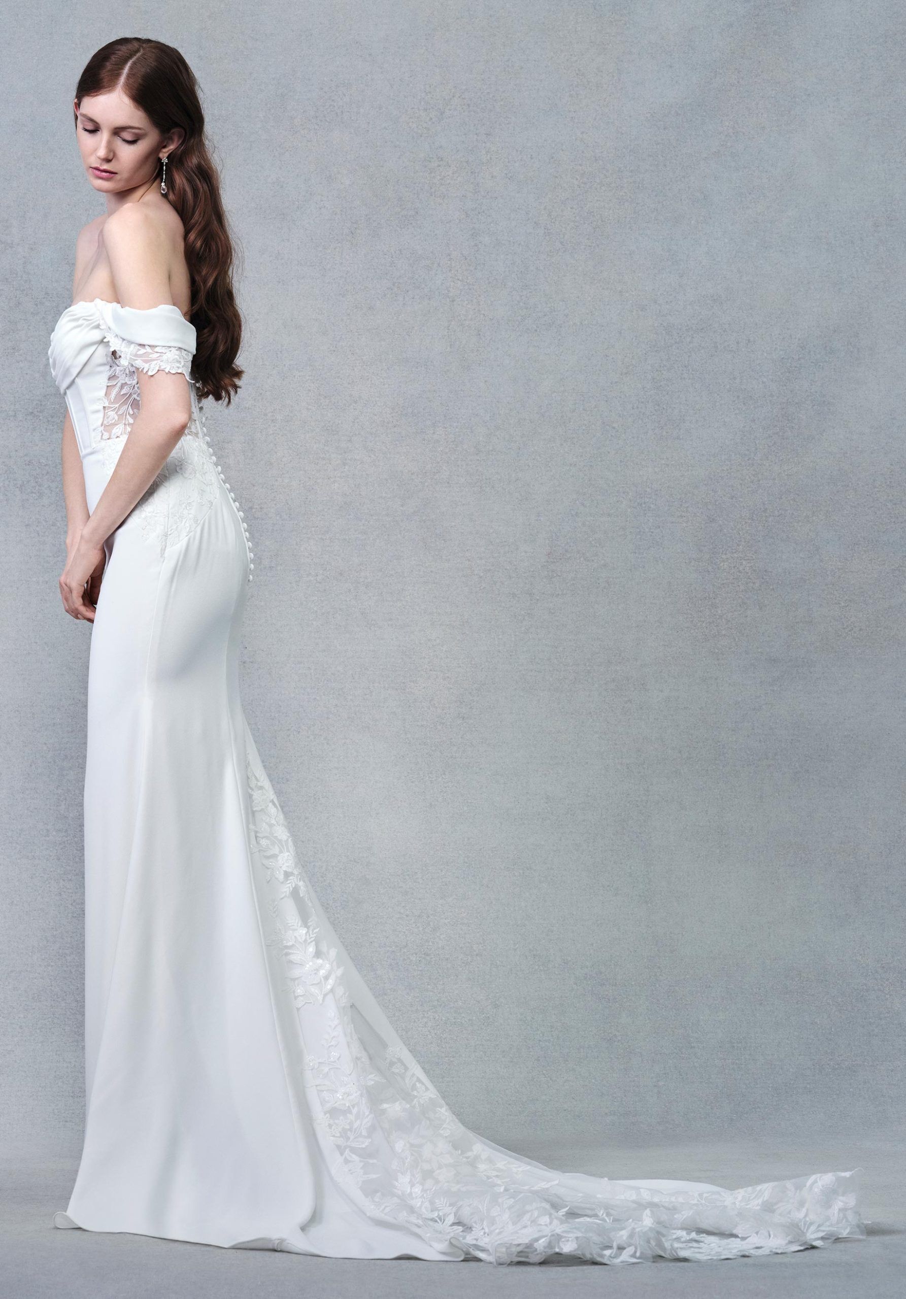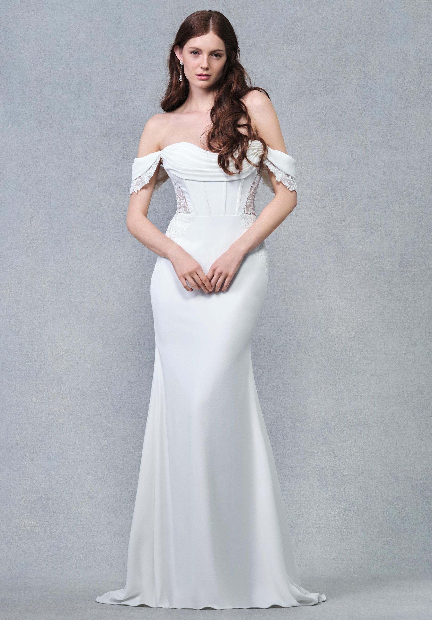 Our Tamara designer wedding dress is for the brides who want true glamour. The sultry style has a scoop neckline with a chic draped detail on a corset-boned bodice featuring sheer sides that gives the illusion of a narrow waist. Stunning crystal beaded lace appliqués contour the fit and flare silhouette, decorate the sheer back, and accent the detachable off-the-shoulder sleeves. For a romantic touch, we’ve designed the train with cut-away lace that looks gorgeous trailing behind you down the aisle.