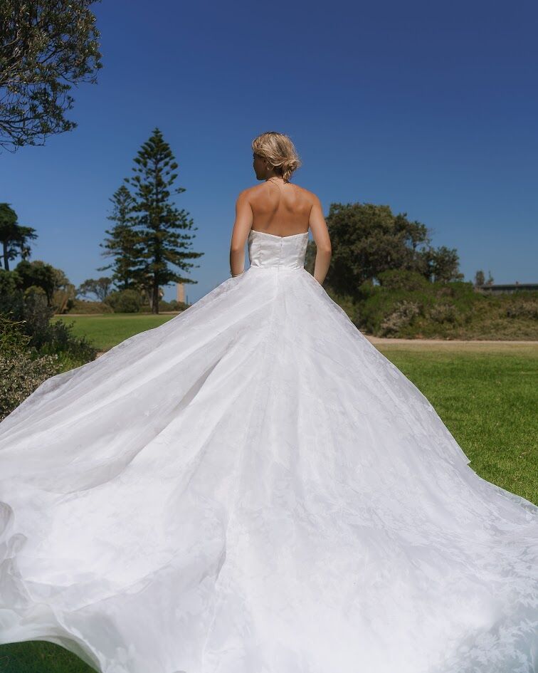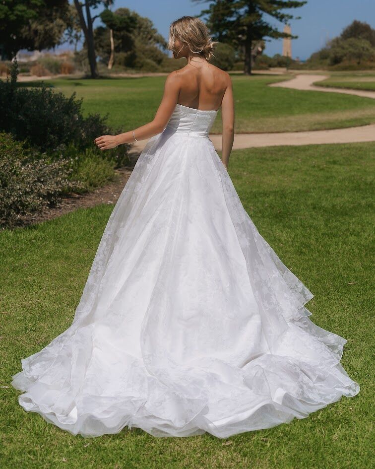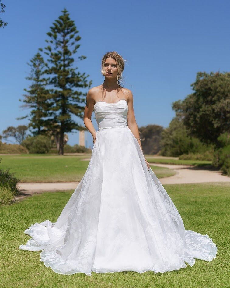 TAYLOR is a perfect blend of romance and modern elegance. Featuring embossed organza fabric, creating a 3D like effect, a stunning A-line silhouette creating a dreamy and ethereal look and a structured softly pleated bodice for structure. This gown is ideal for brides who want to exude a blend of modern elegance and classic grandeur.