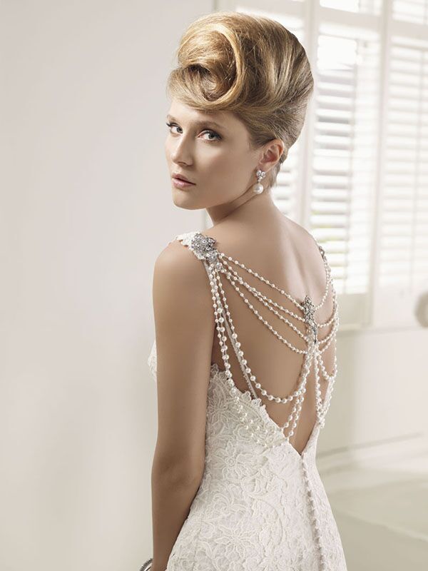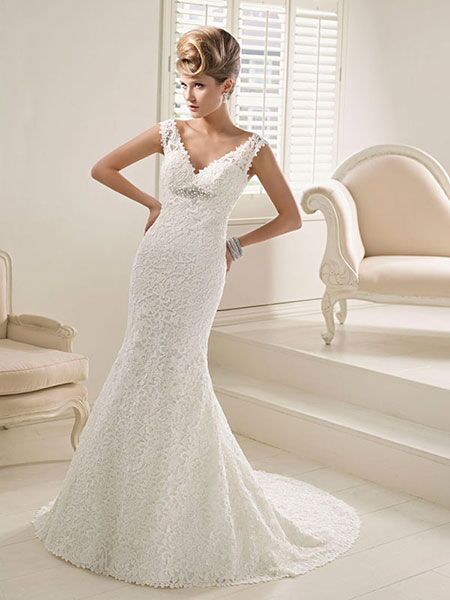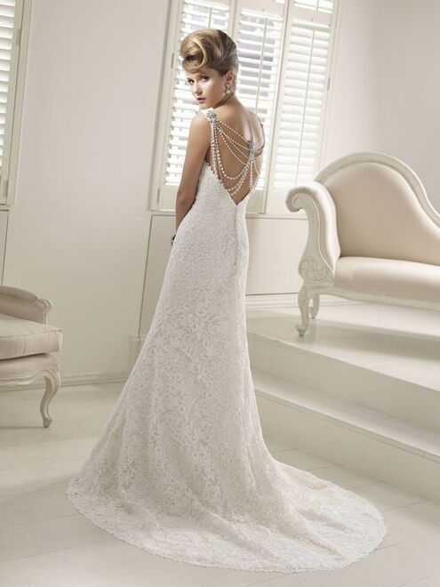 Original, mermaid dress in lace with v-neck. Bodice with v-neck and plunging back. Removable back piece.