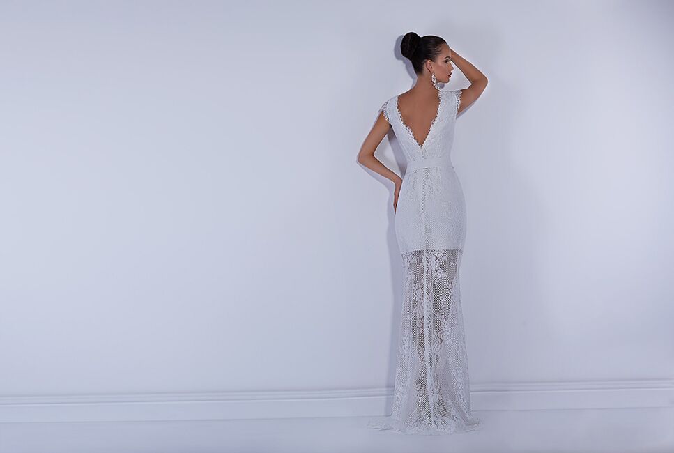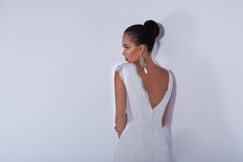 Classic style dress with gorgeous lace, bateau neckline, V-shape back cut out. Belt sold separately.