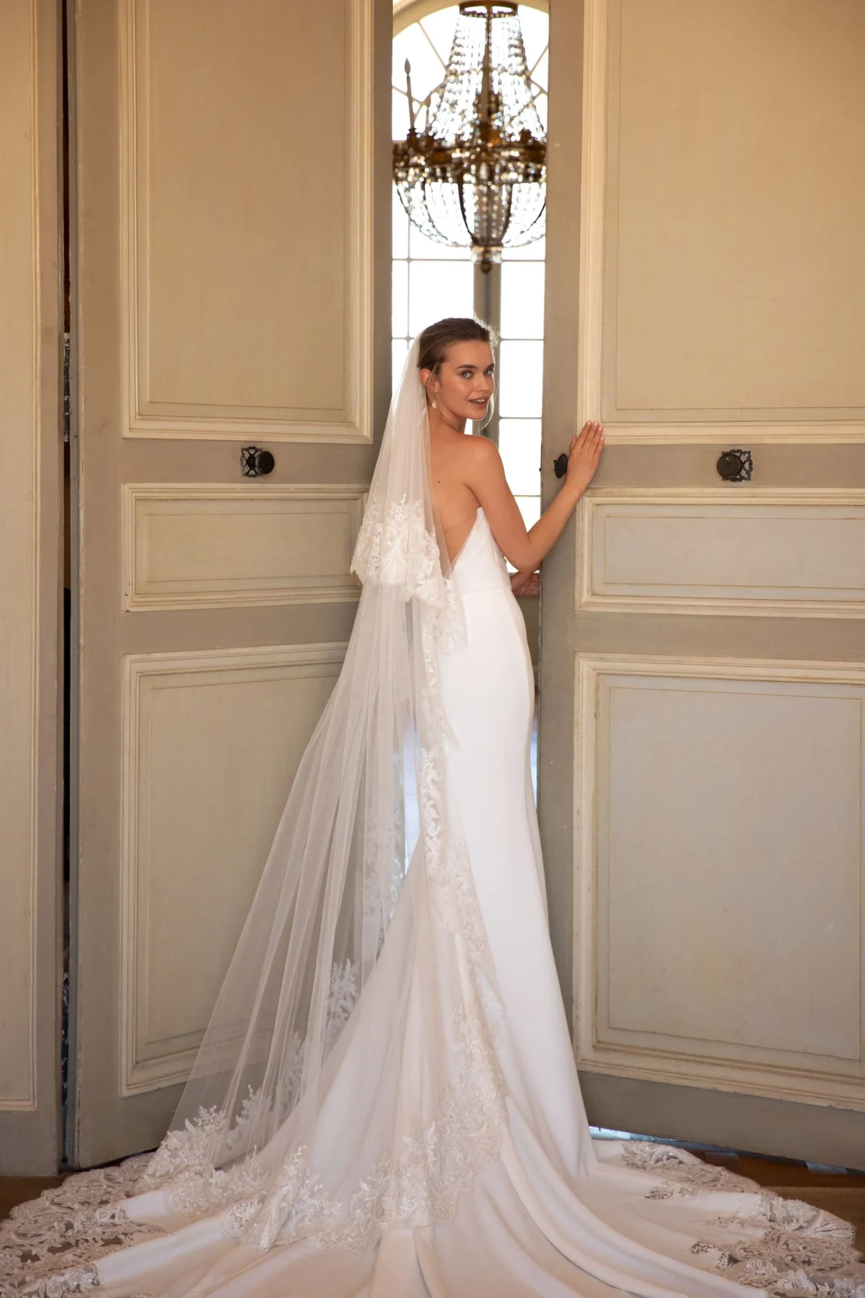Yesterday, today and tomorrow brides will dream of a dress that will show their forms in all its glory. The mermaid silhouette dress made of costume fabric was created for this purpose. Daisy lies beautifully on the body, making elegant female forms expressive. Embroidered appliqués are an element that makes you take a look at every centimeter. The corset with a half-heart neckline, close-fitting skirt with a train, smoothly transitioning to tulle, and nude netting on the back are details that make the image more spectacular and vivid. And removable puffy sleeves with high cuffs harmoniously complement the image. The organza drapery seems to weave the dress, making it even more perfect. Book An Appointment